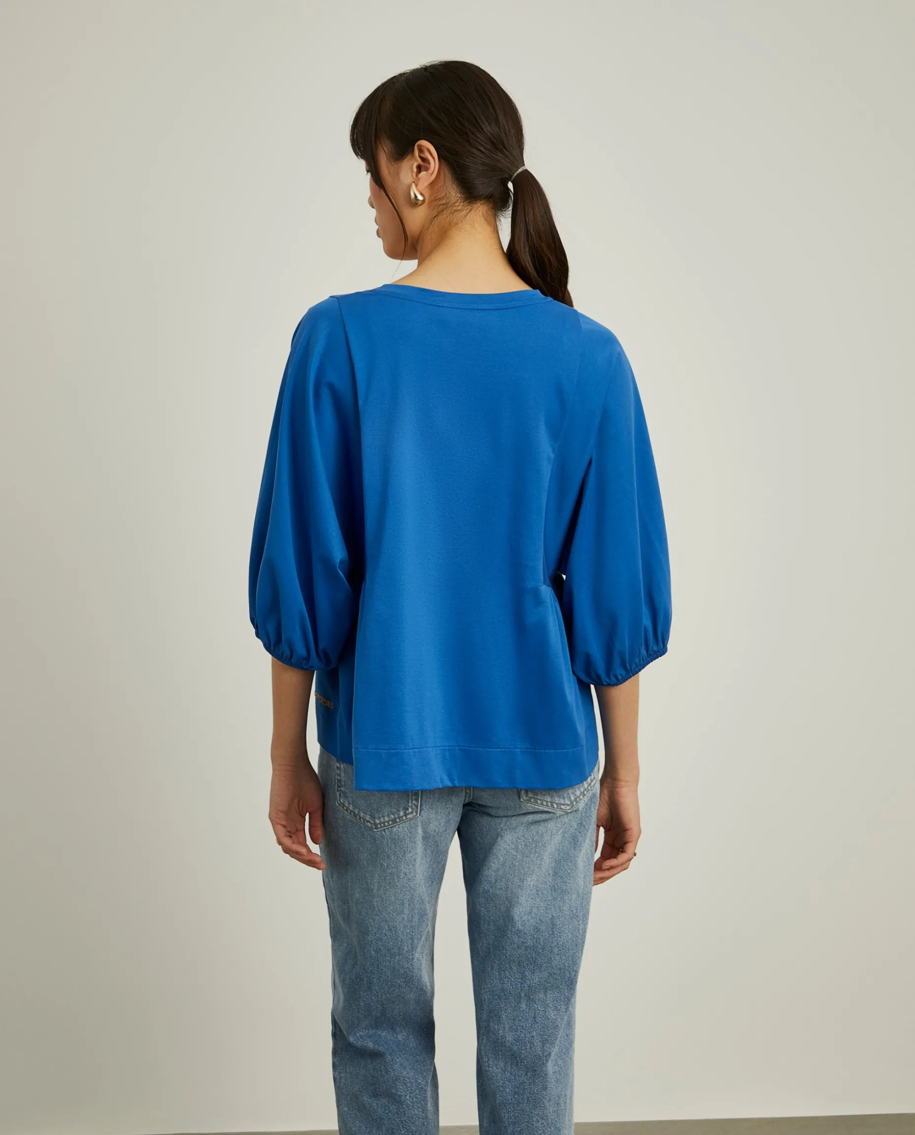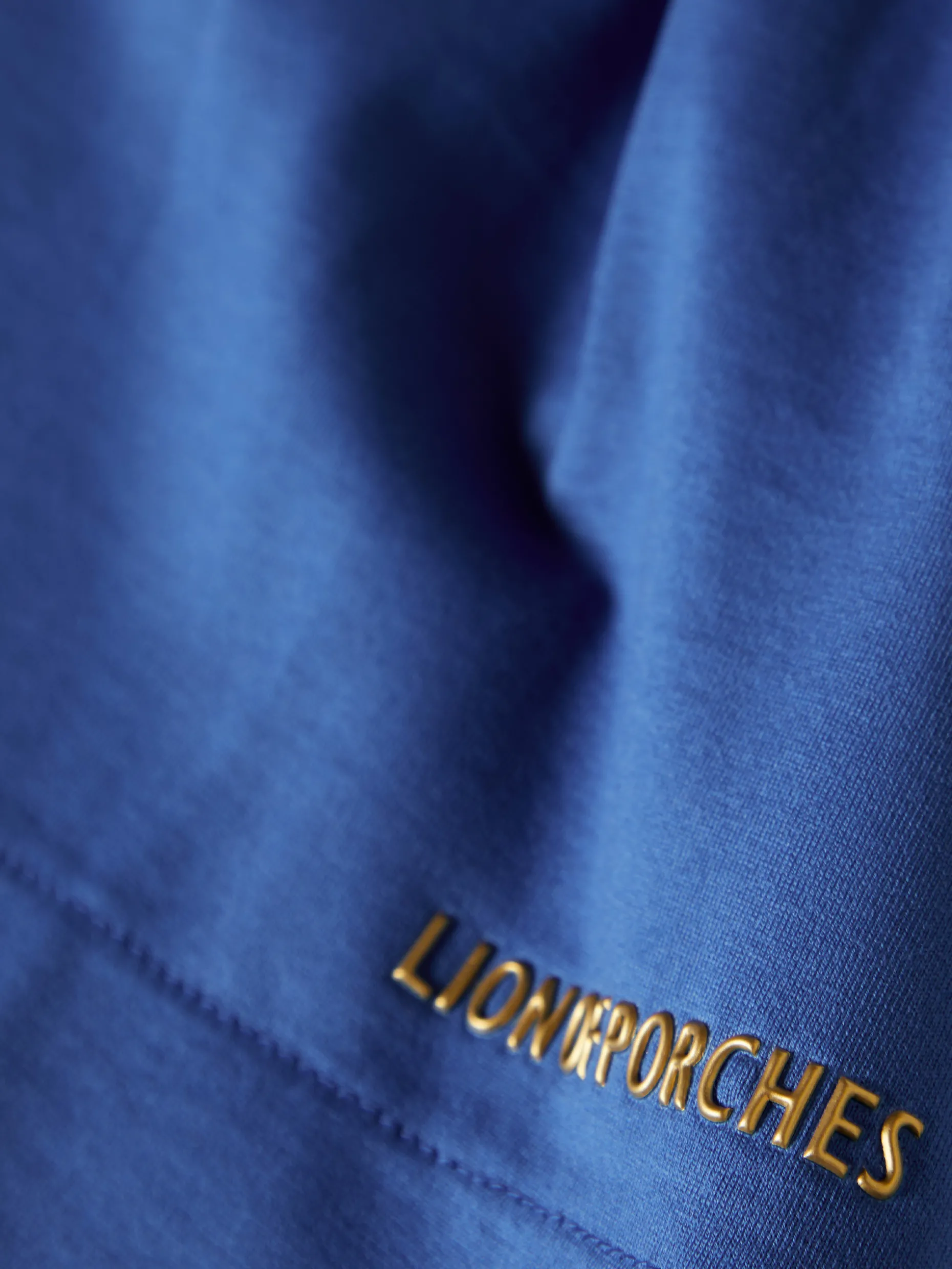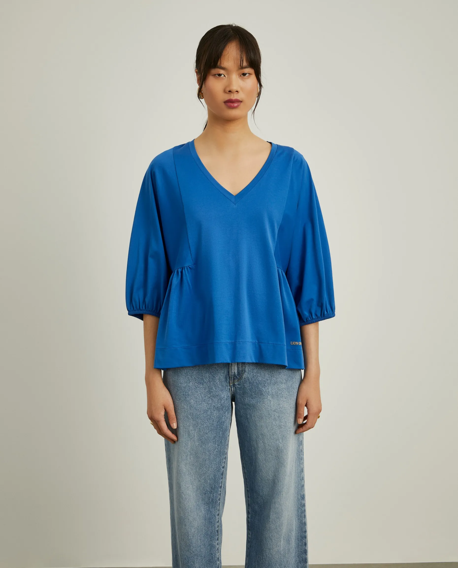 Camisola de fit largo com decote em V. De mangas abalonadas com elástico no punho, finaliza com pregas nas laterais. Pormenor de logotipo Lion of Porches em relevo na base.