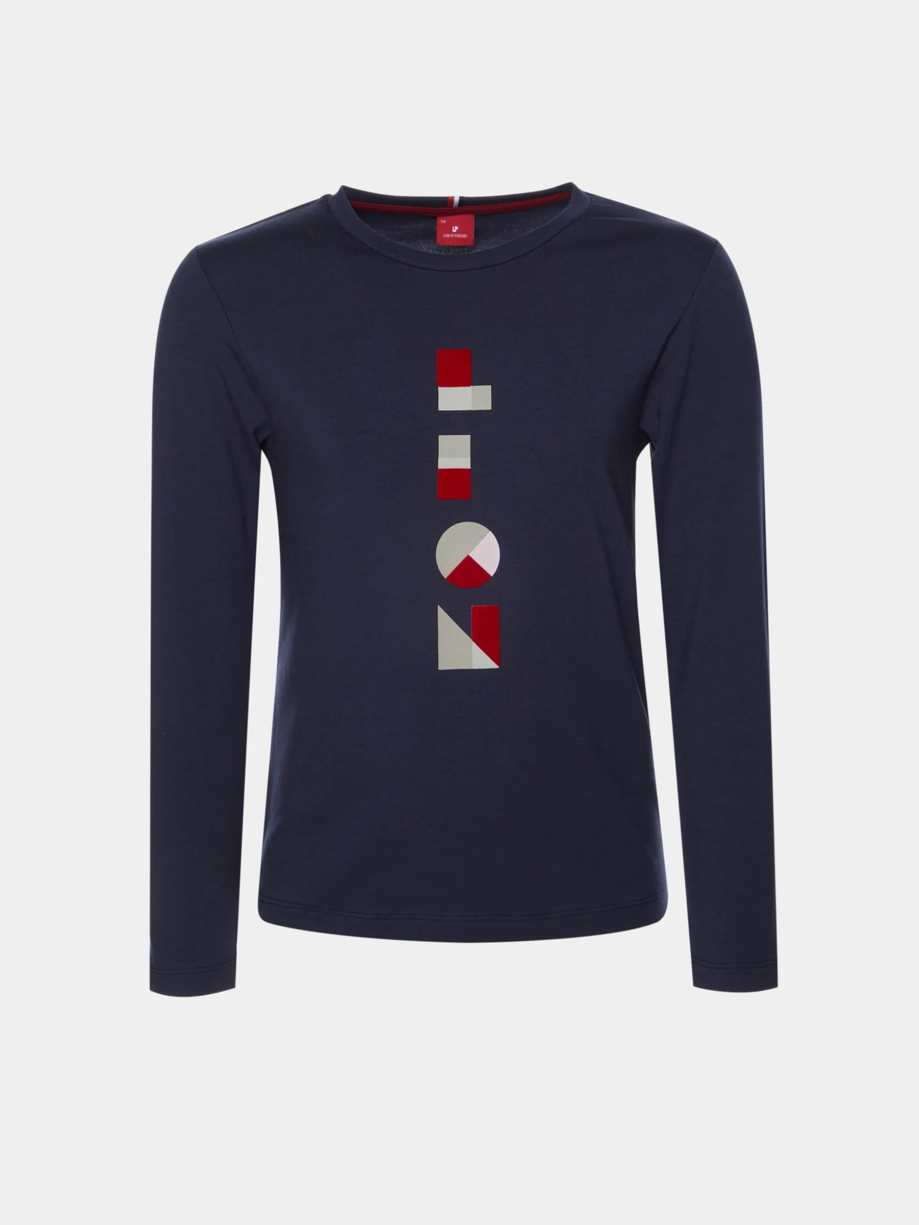 Camisola decote redondo manga comprida com lettering estampado em contraste. Detalhe de fita de riscas atrás na gola.
