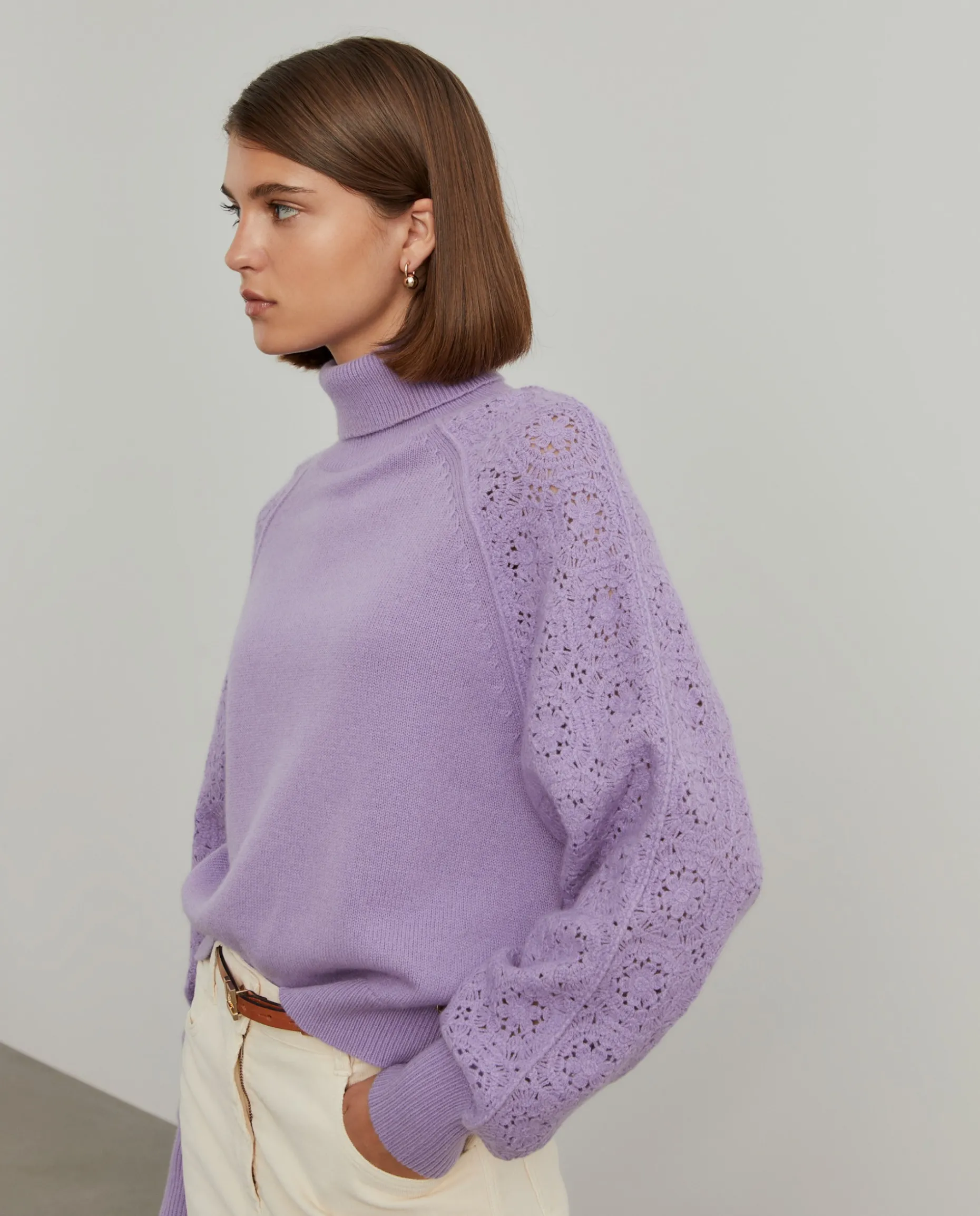 Mantenha-se quente e confortável com esta camisola de gola alta com pormenor elegante e diferenciador de mangas em efeito croché. A gola, base e punhos são canelados. É confecionada, na totalidade, em lã, que confere à peça maior conforto e isolamento térmico.