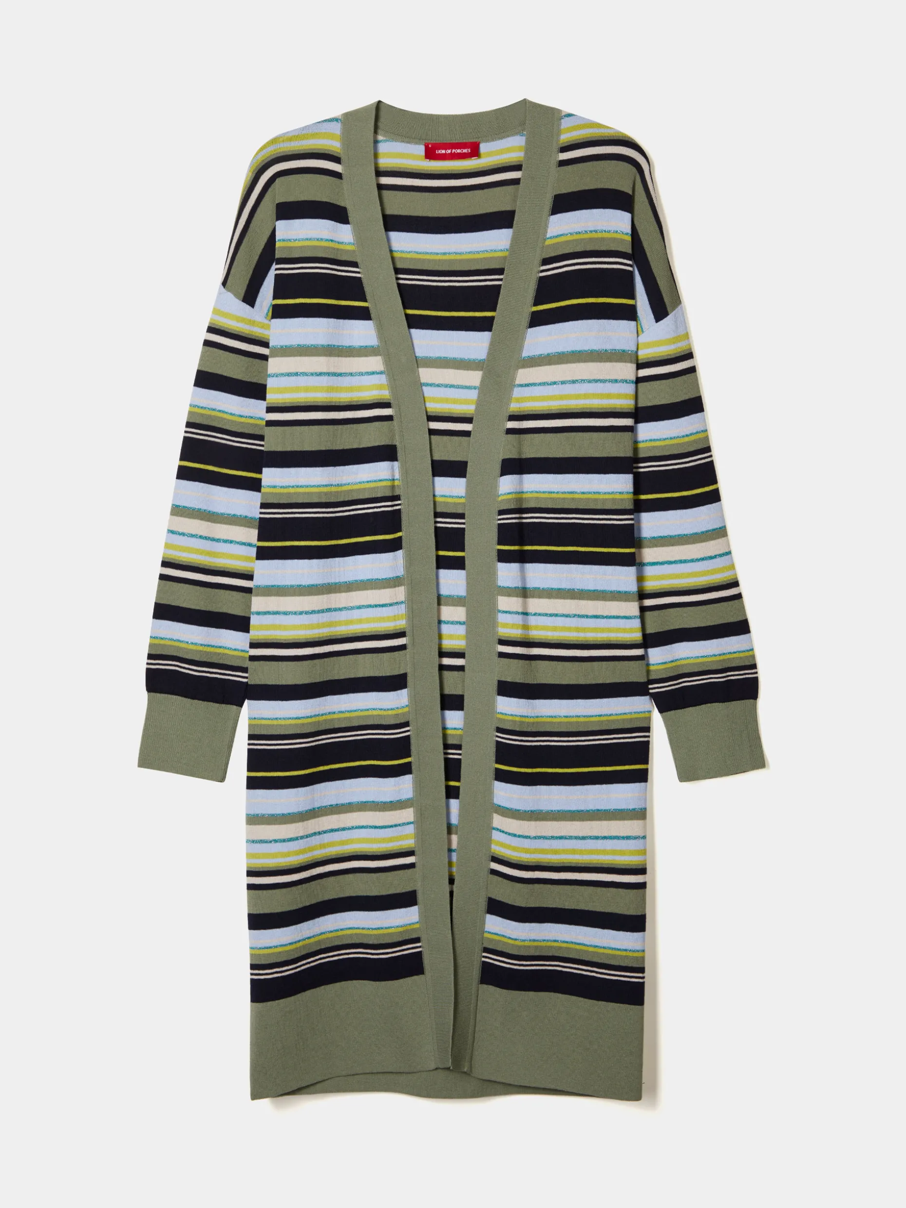 Cardigan de malha às riscas assimétricas macio e confortável confecionado com mistura de algodão. Bainha e punhos rematados com canelado em contraste. Aberturas nas laterais. Possibilidade de calças e colete a combinar, da mesma coleção.