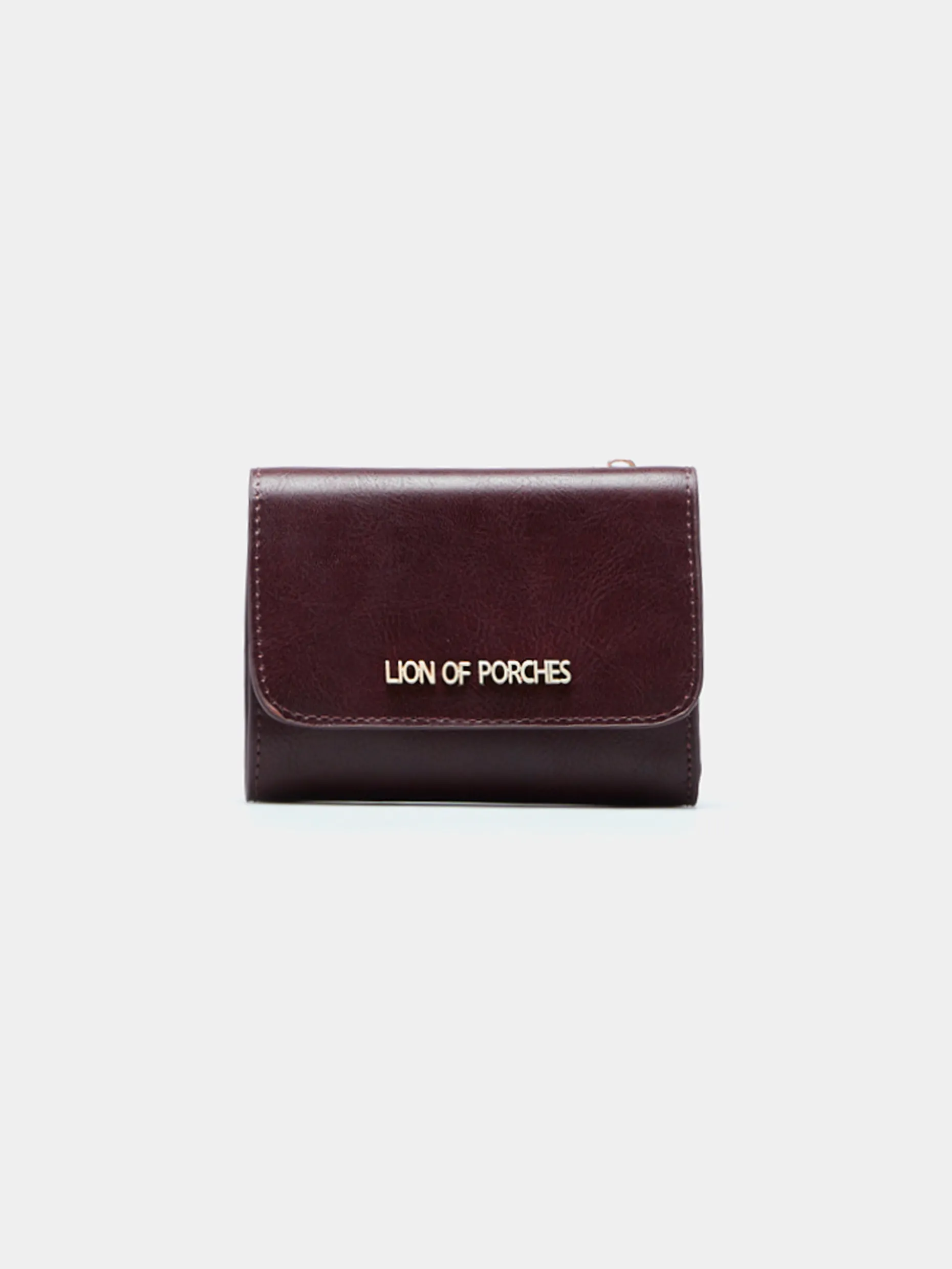 Carteira retangular de cor lisa com pormenor de aplicação metálica Lion of Porches na frente. Contém um porta-cartões amovível através de molas de pressão.
