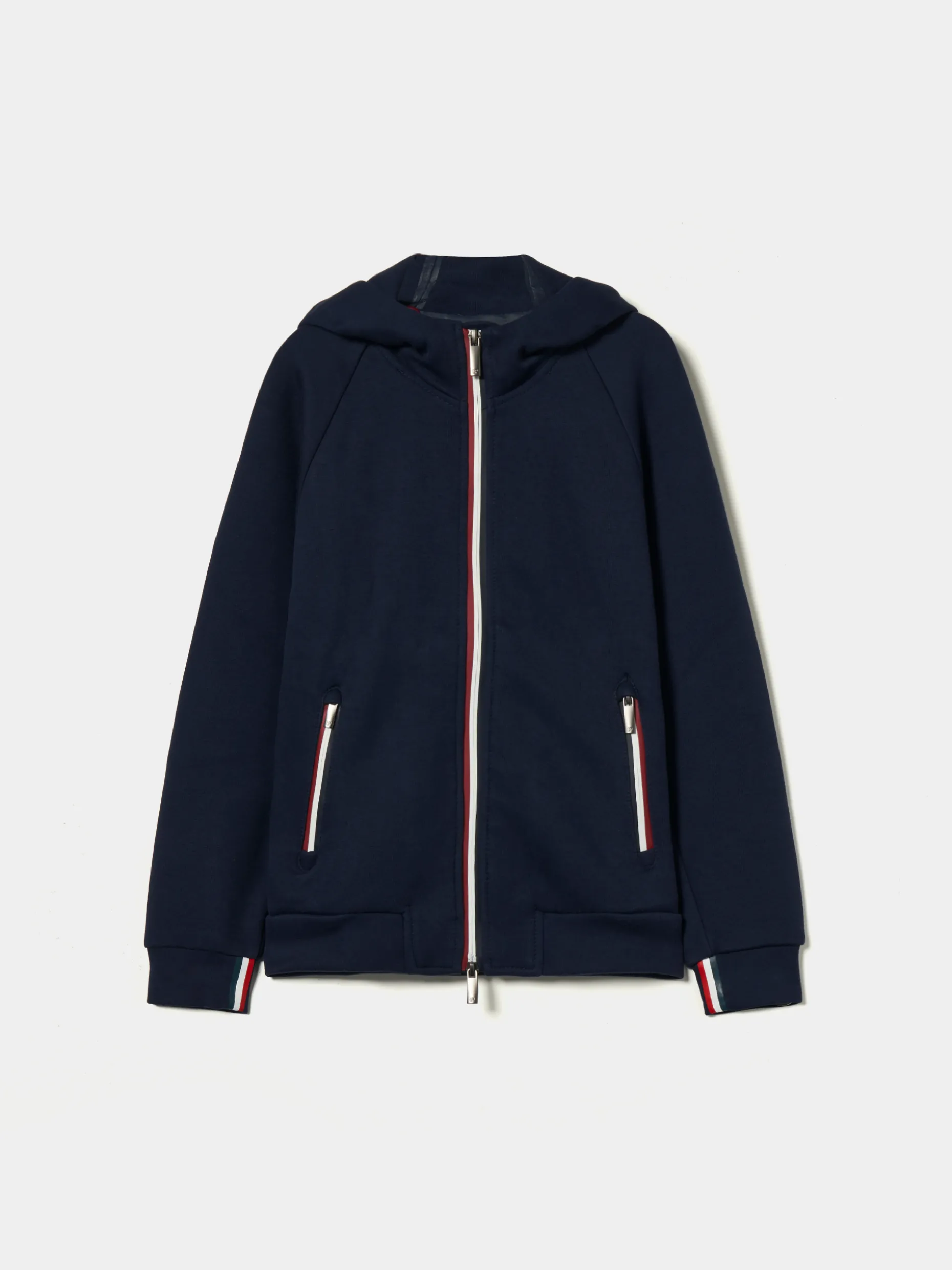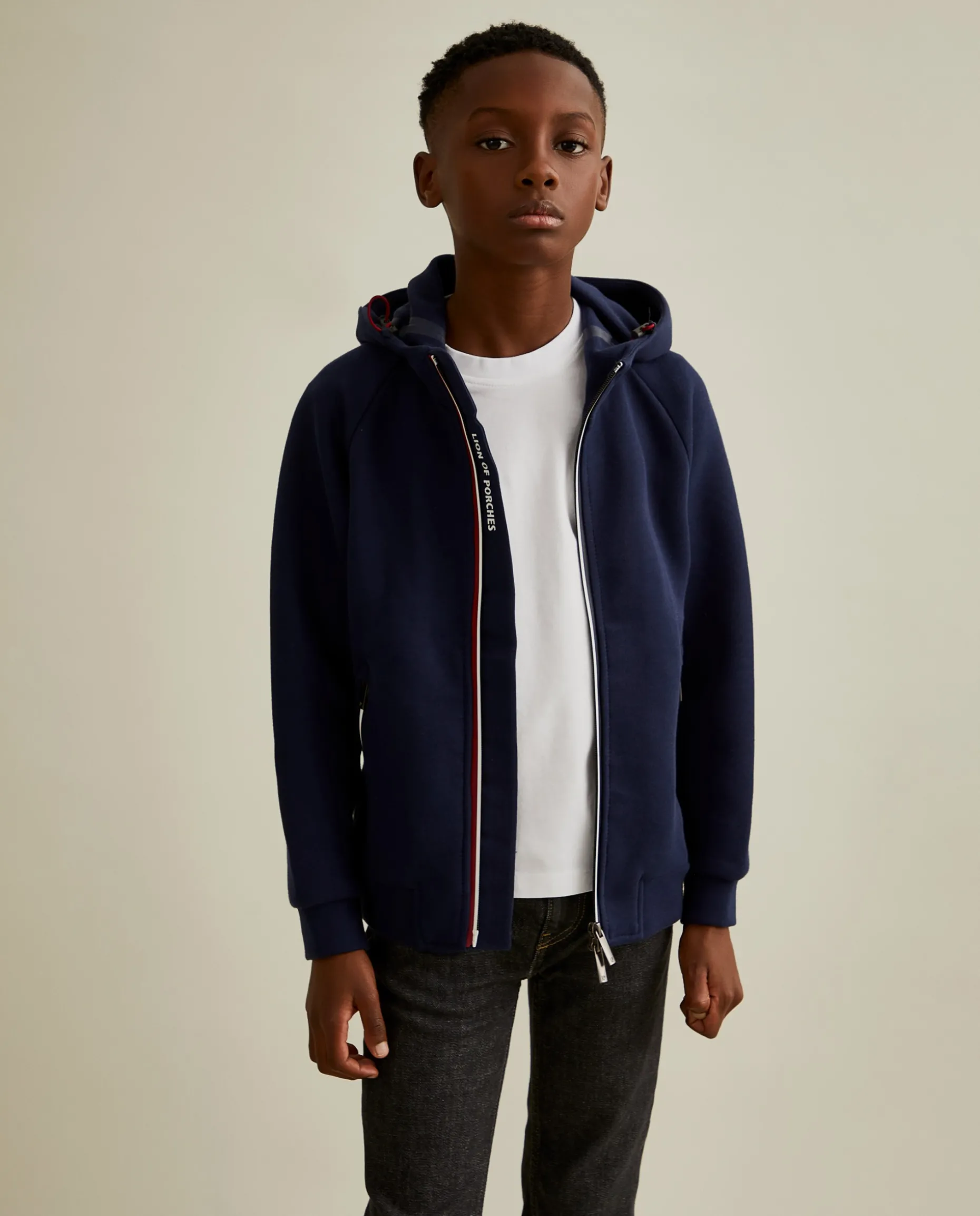 Este casaco desportivo é ideal para os dias mais casuais. Com um capuz ajustável por elásticos, aperta na frente com um fecho contrastante. É finalizado com riscas nos punhos e nos bolsos.