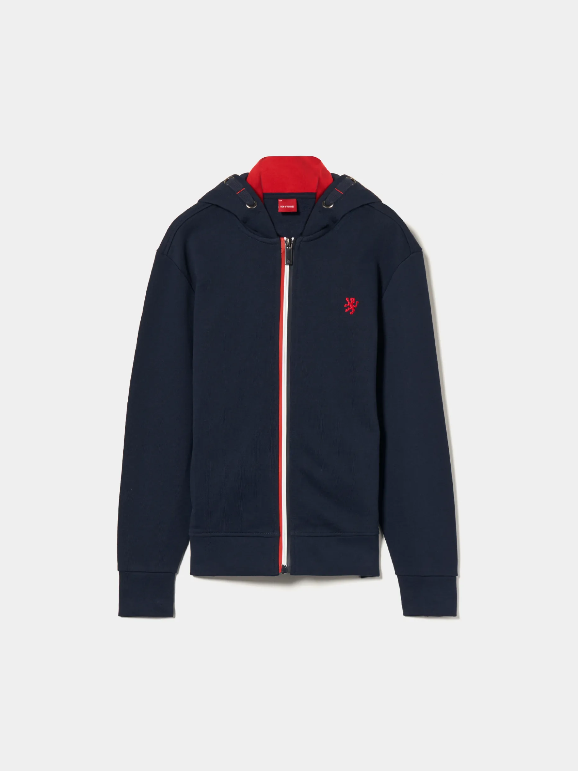 Casaco de malha, de manga comprida, com capuz. Abre na frente com fecho zíper oculto por carcela vulcanizada tricolor. Com bolsos laterais e leão da marca em contraste no peito.
