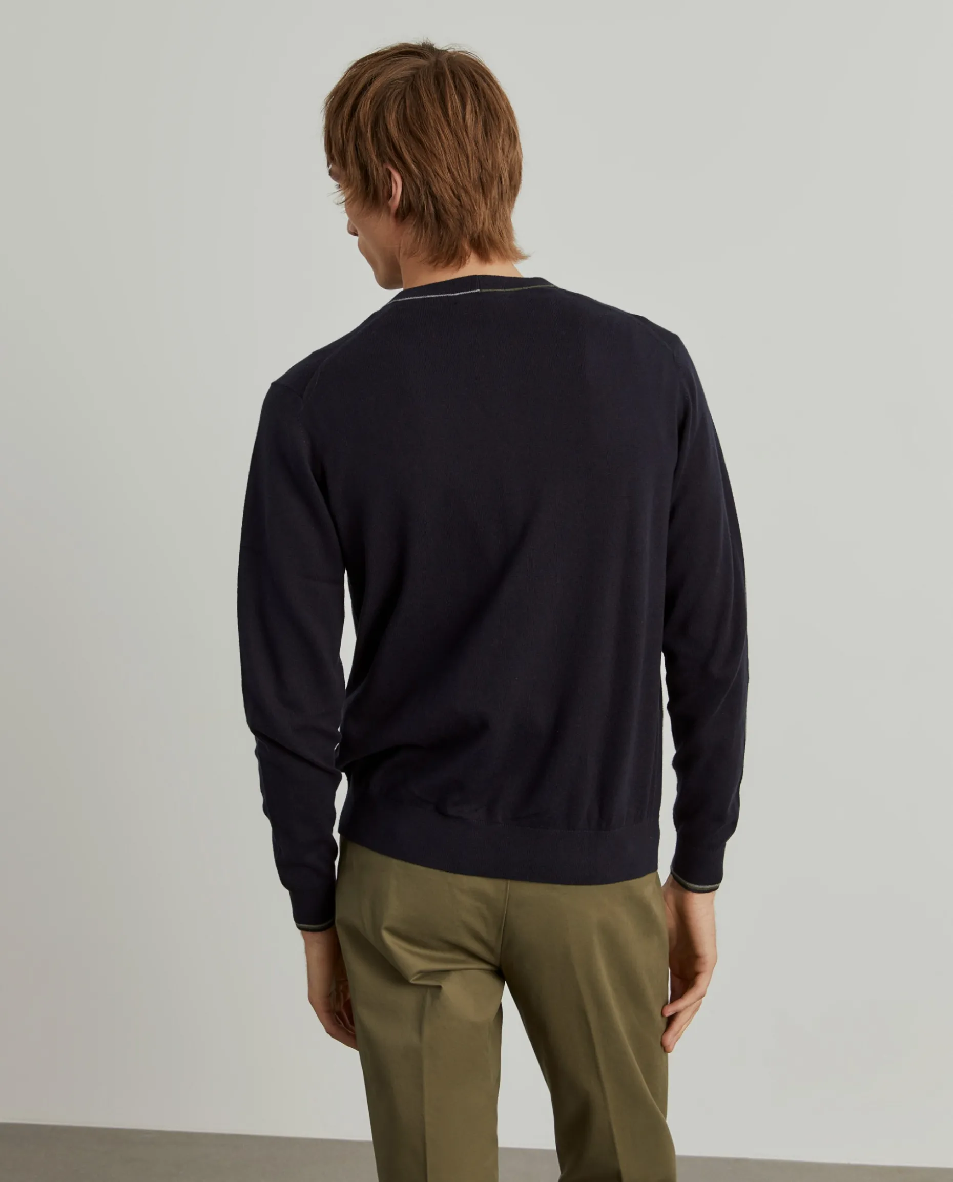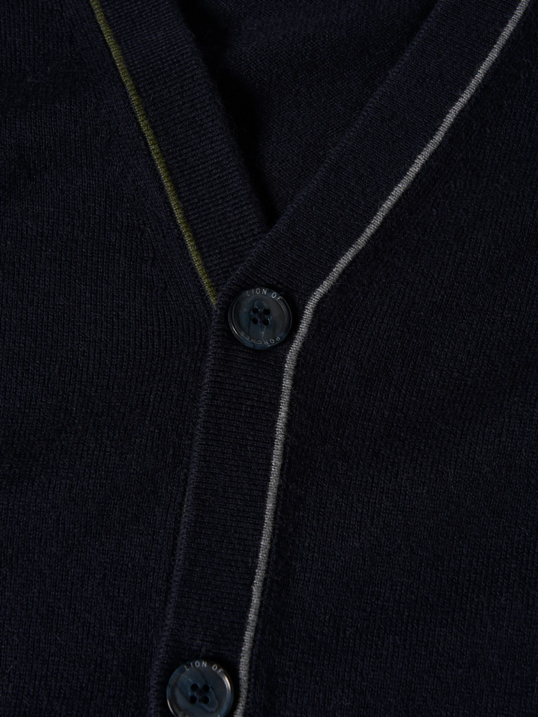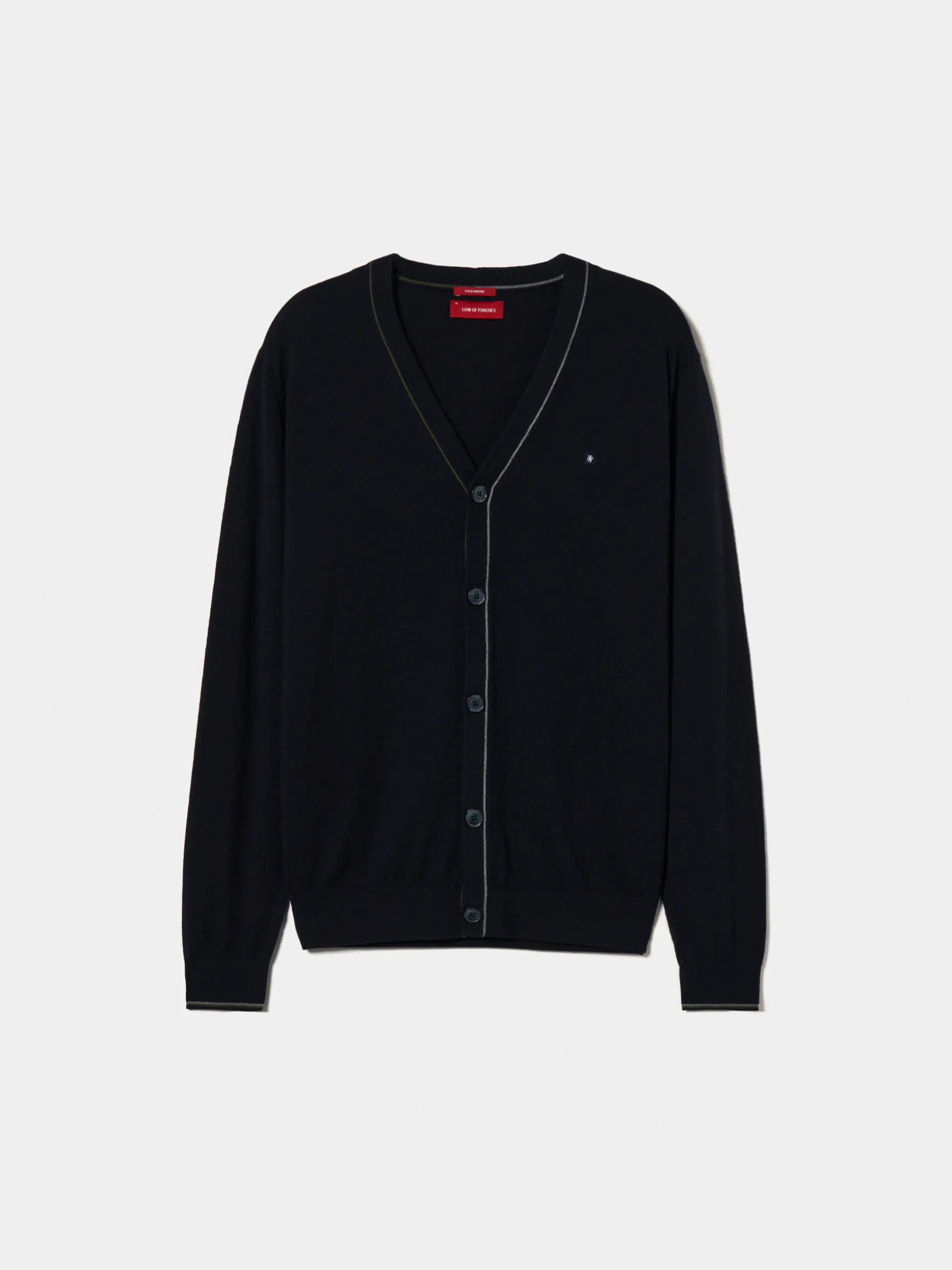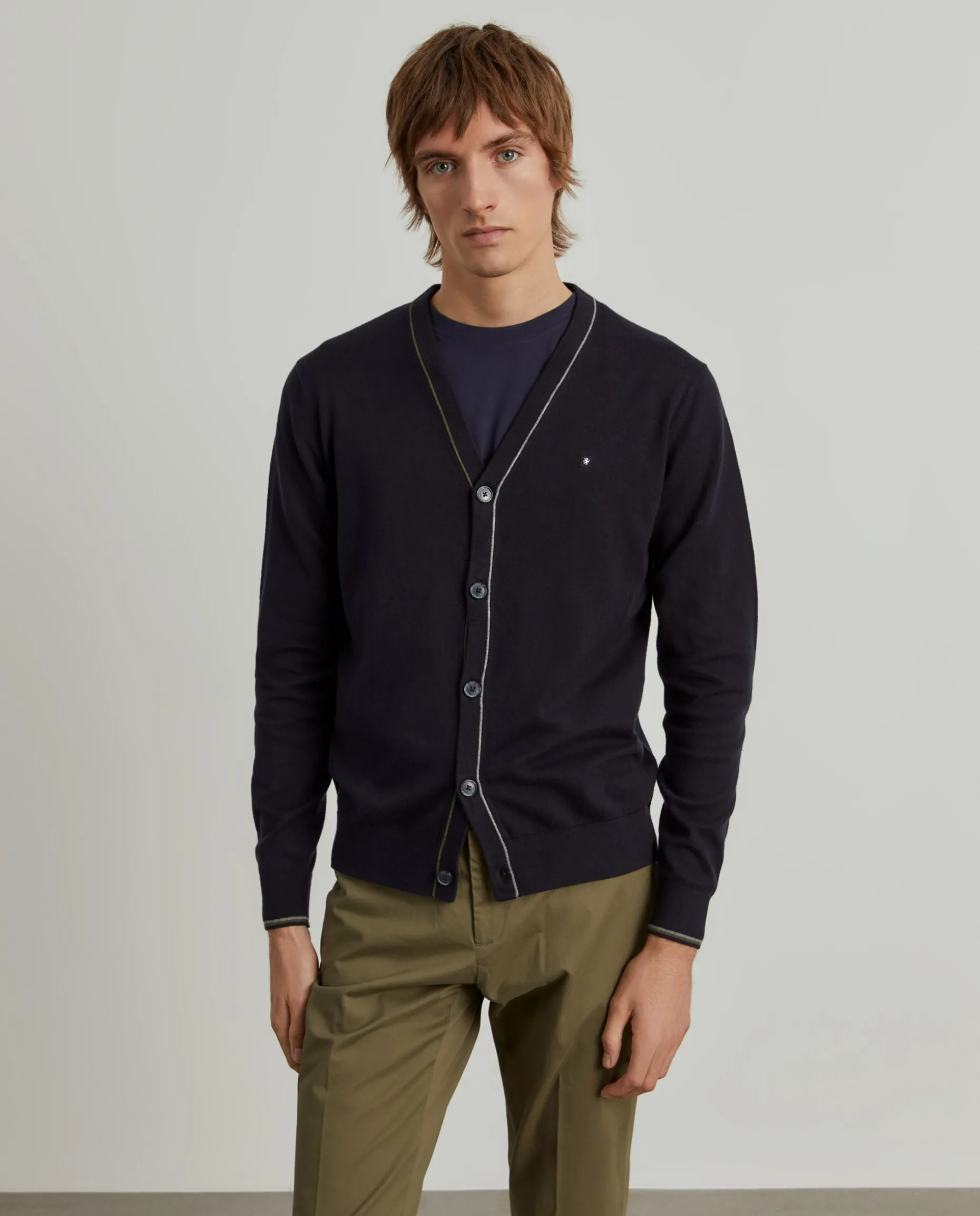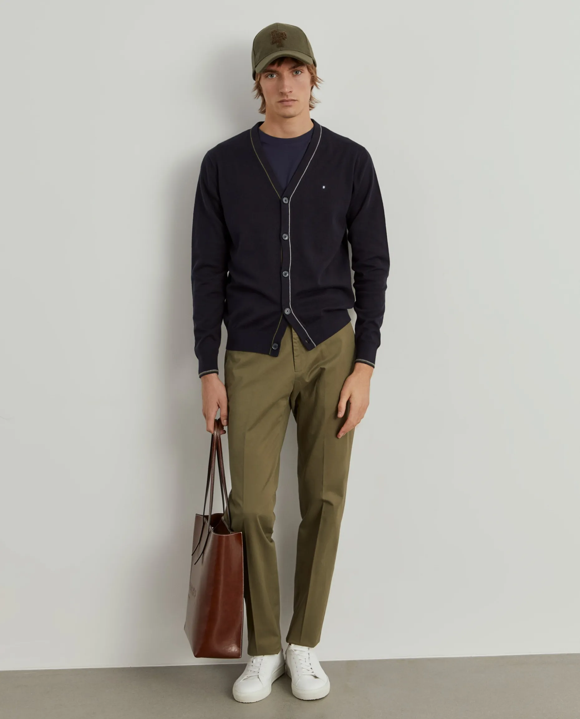 Indispensável nos dias mais frescos, este casaco de malha, tem manga comprida e aperta com botões. Com pormenor diferenciador de riscas em contraste nos punhos, à volta do decote e no decorrer da carcela dos botões. É confecionado com uma mistura de algodão e caxemira que conferem à peça maior conforto e suavidade.