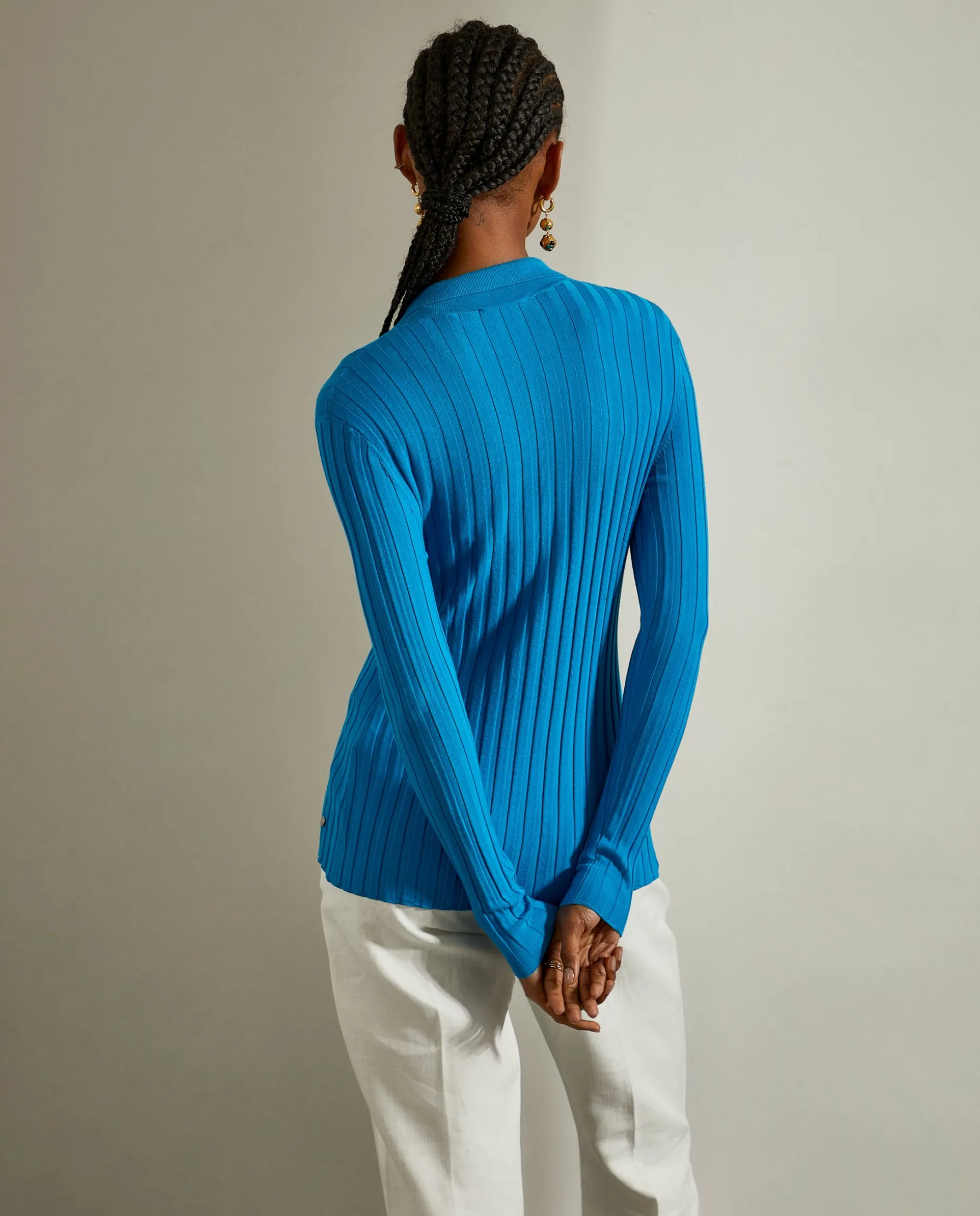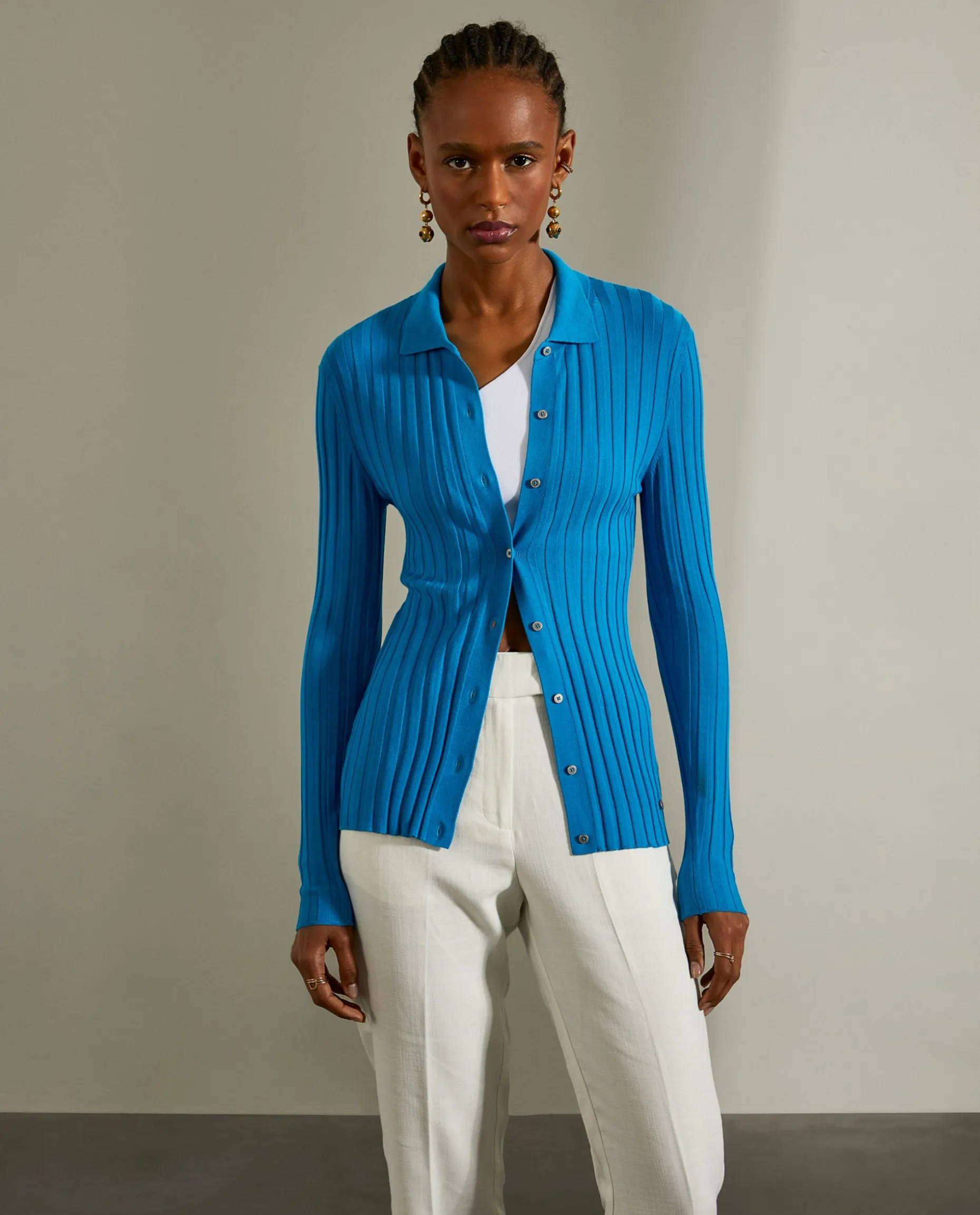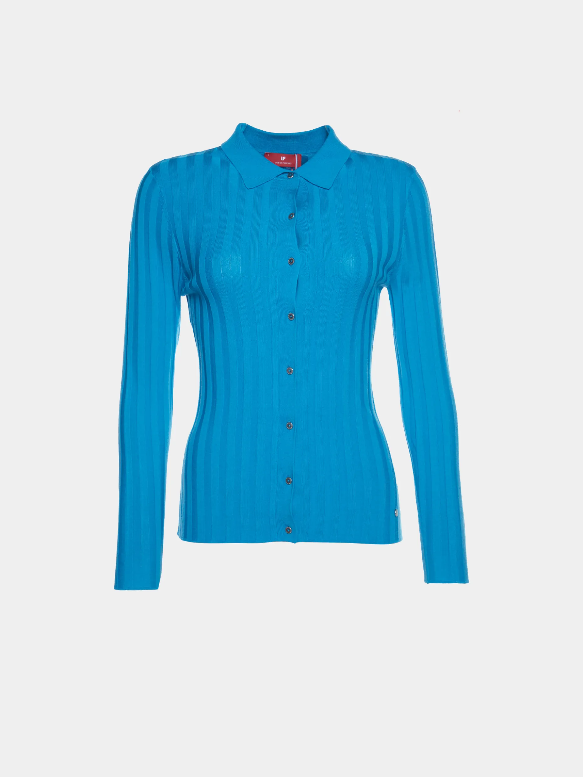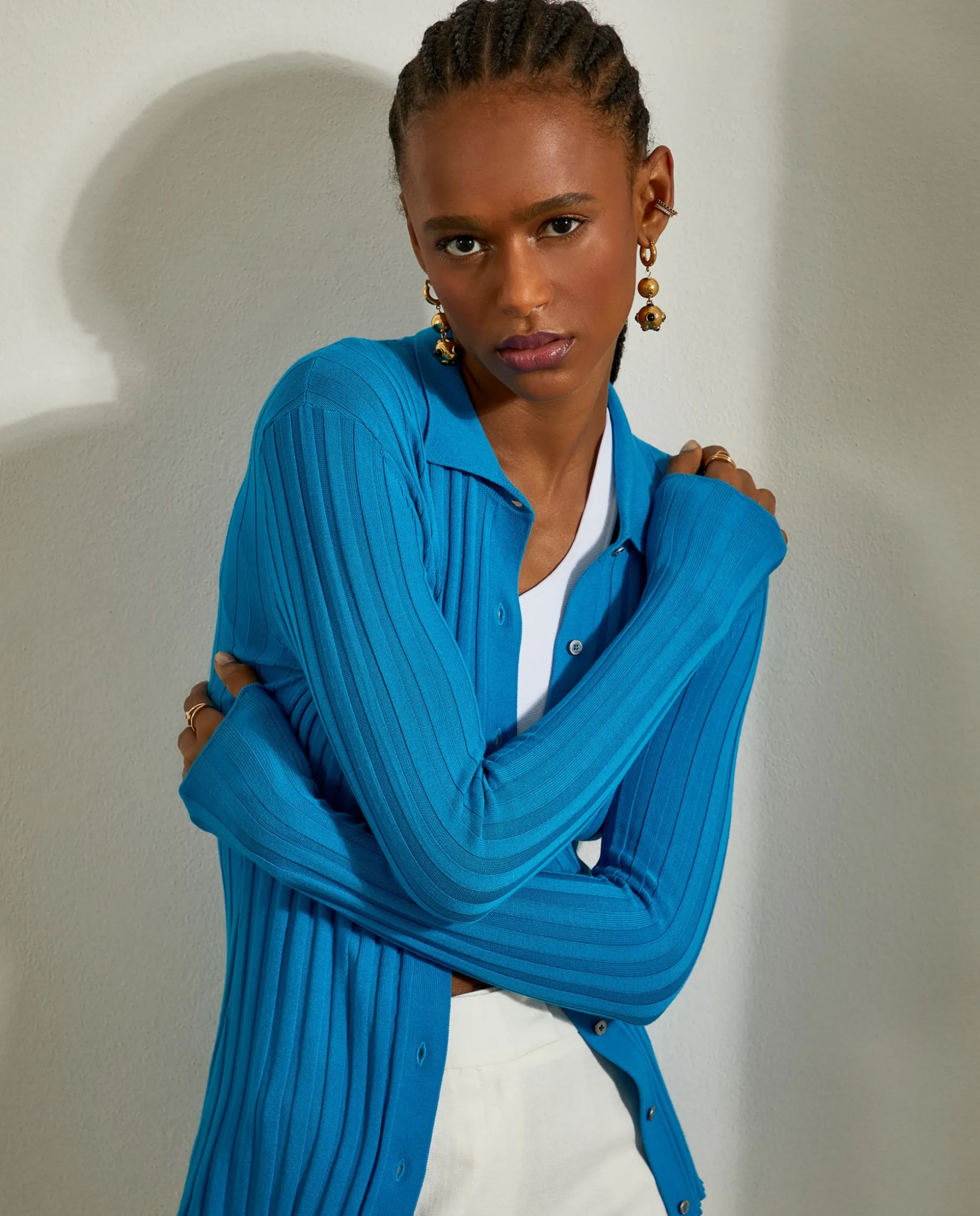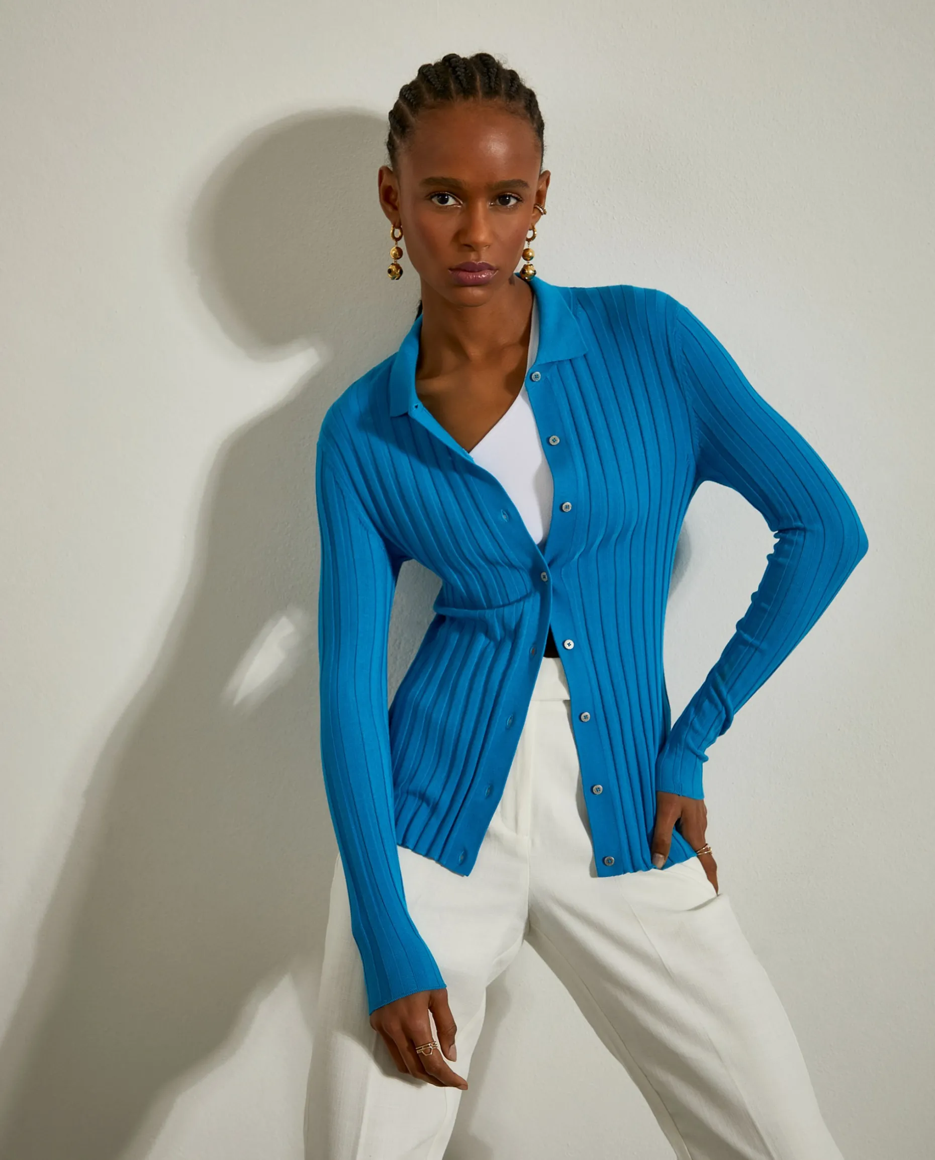 Casaco de malha canelada. Aperta com botões de metal. Possibilidade de camisola e top a combinar.