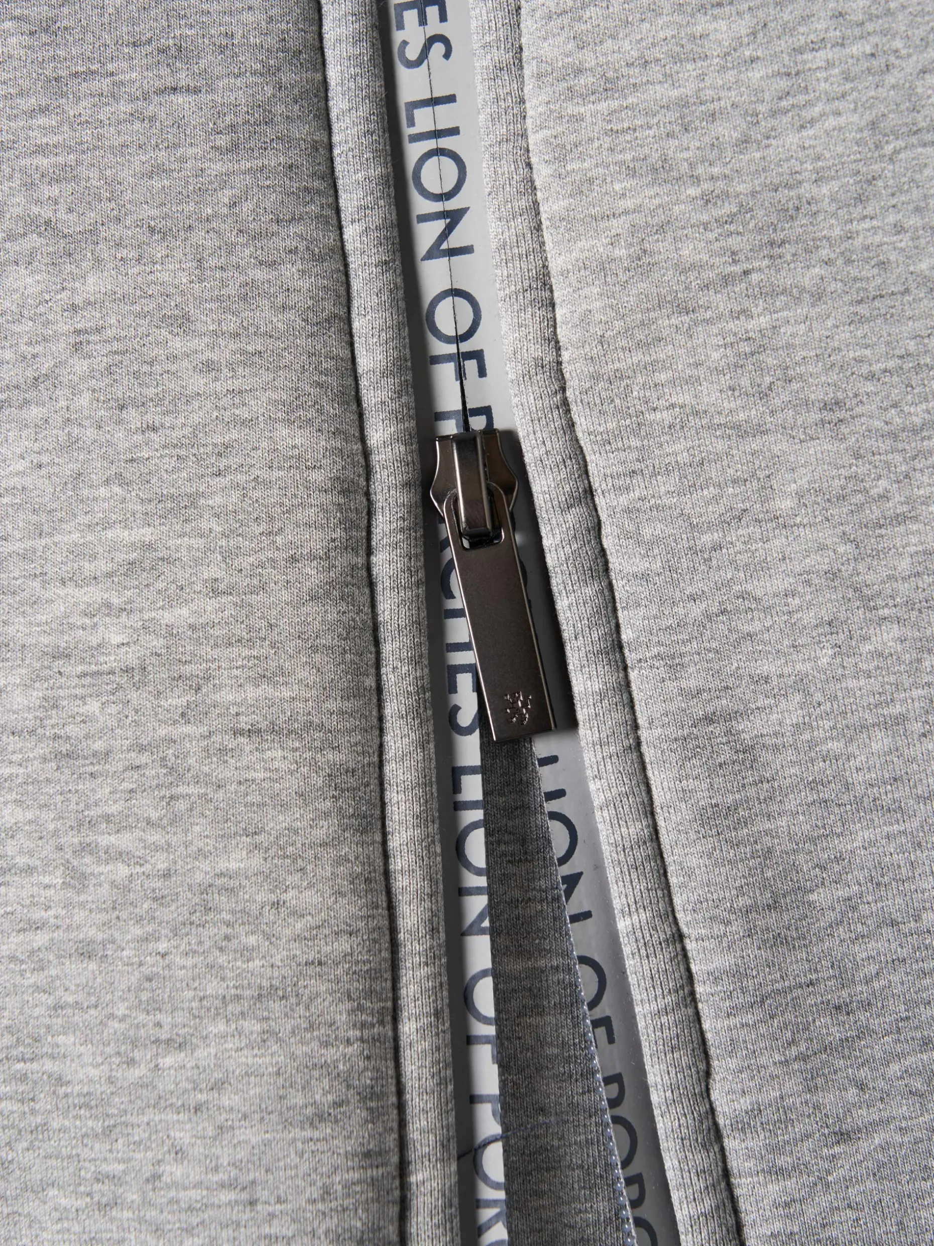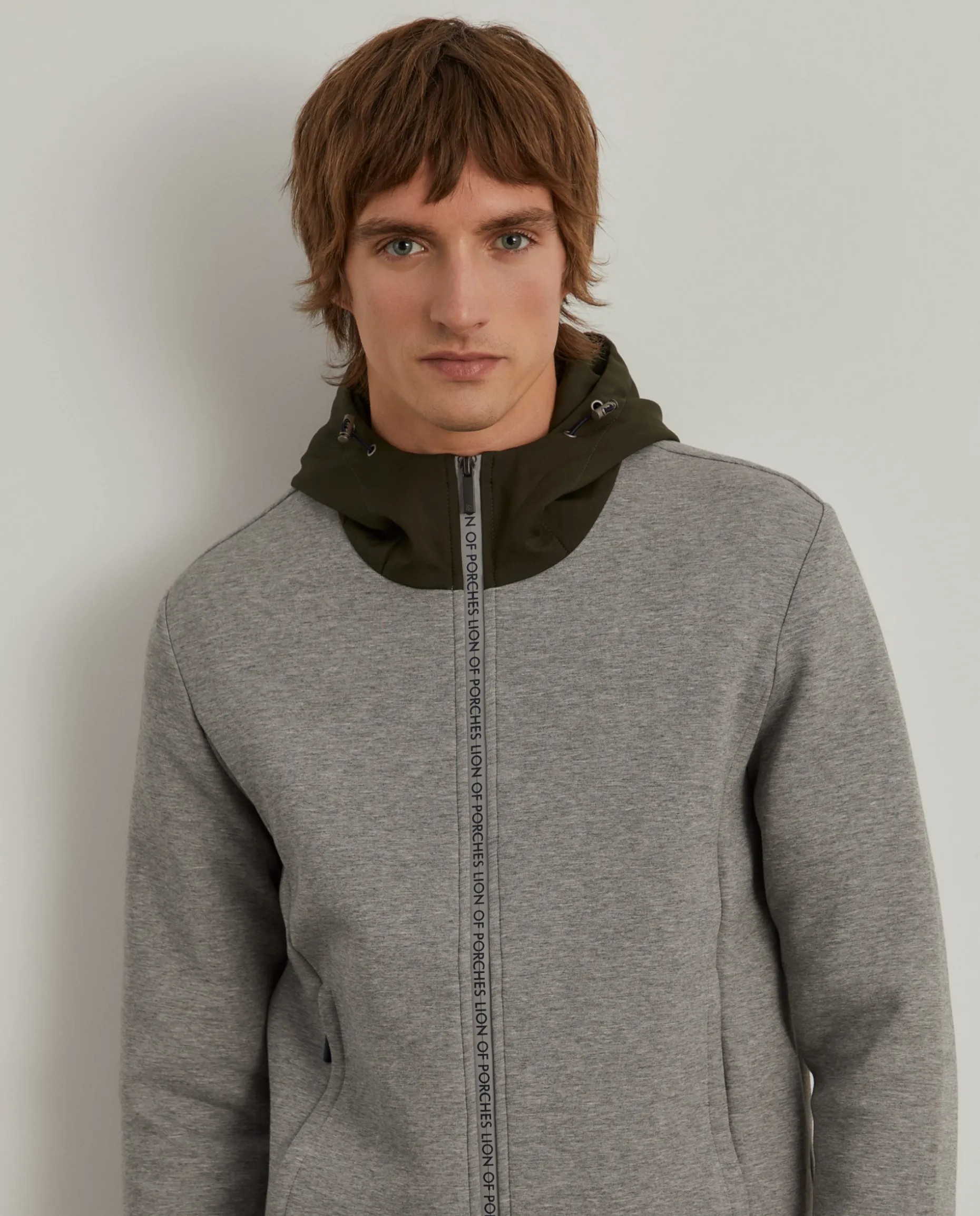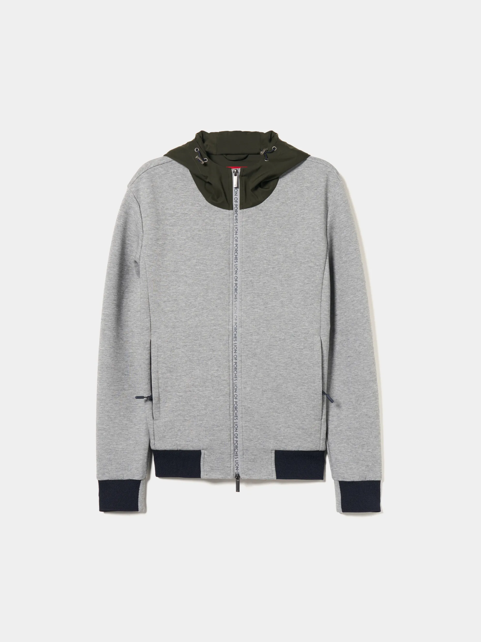 Casaco em malha, de manga comprida, com capuz em tecido técnico em contraste. Com fecho frontal duplo vulcanizado com estampado Lion of Porches em contraste por toda a carcela. Noutra cor estão também a base e os punhos elásticos. Tem ainda bolsos laterais com fecho.