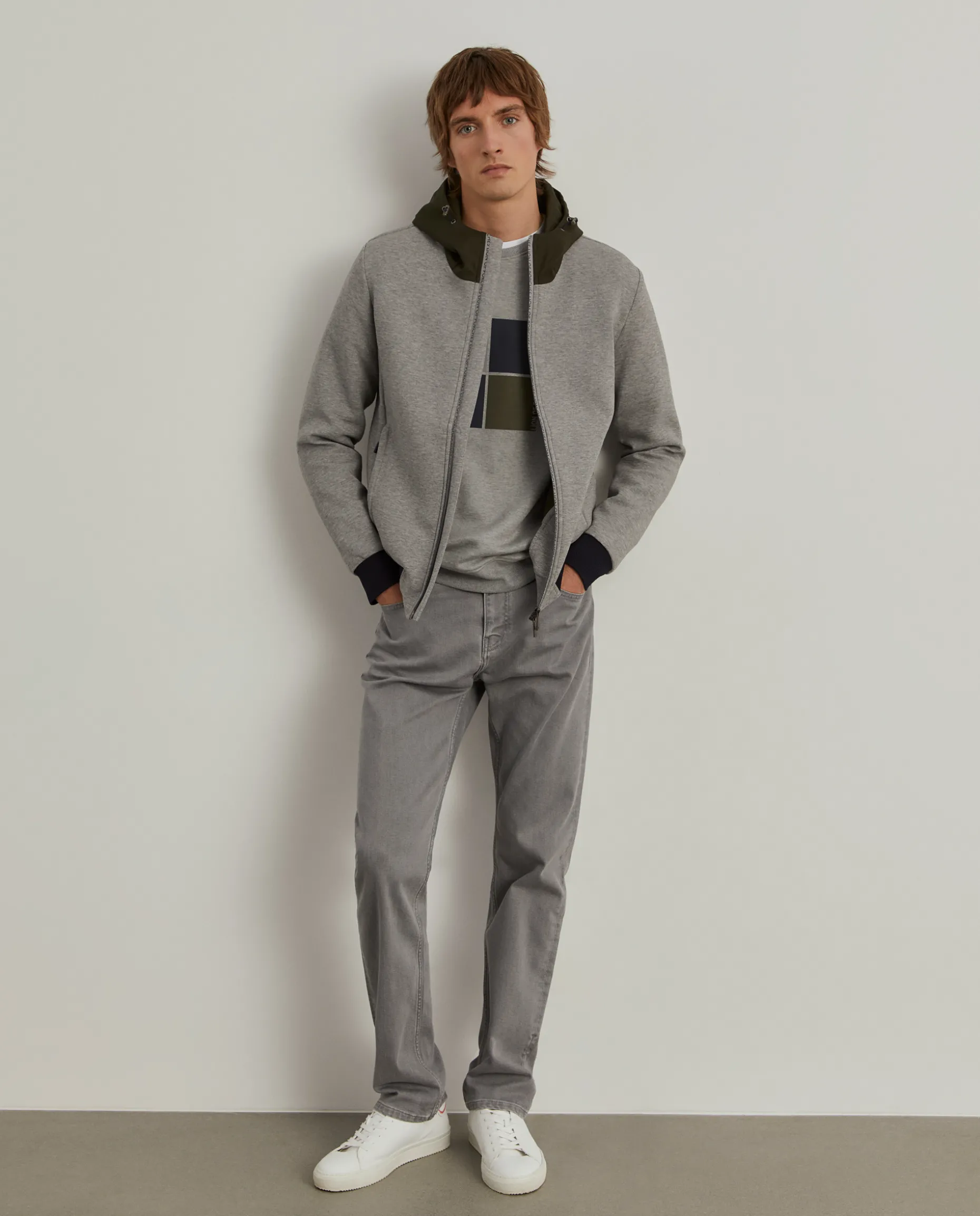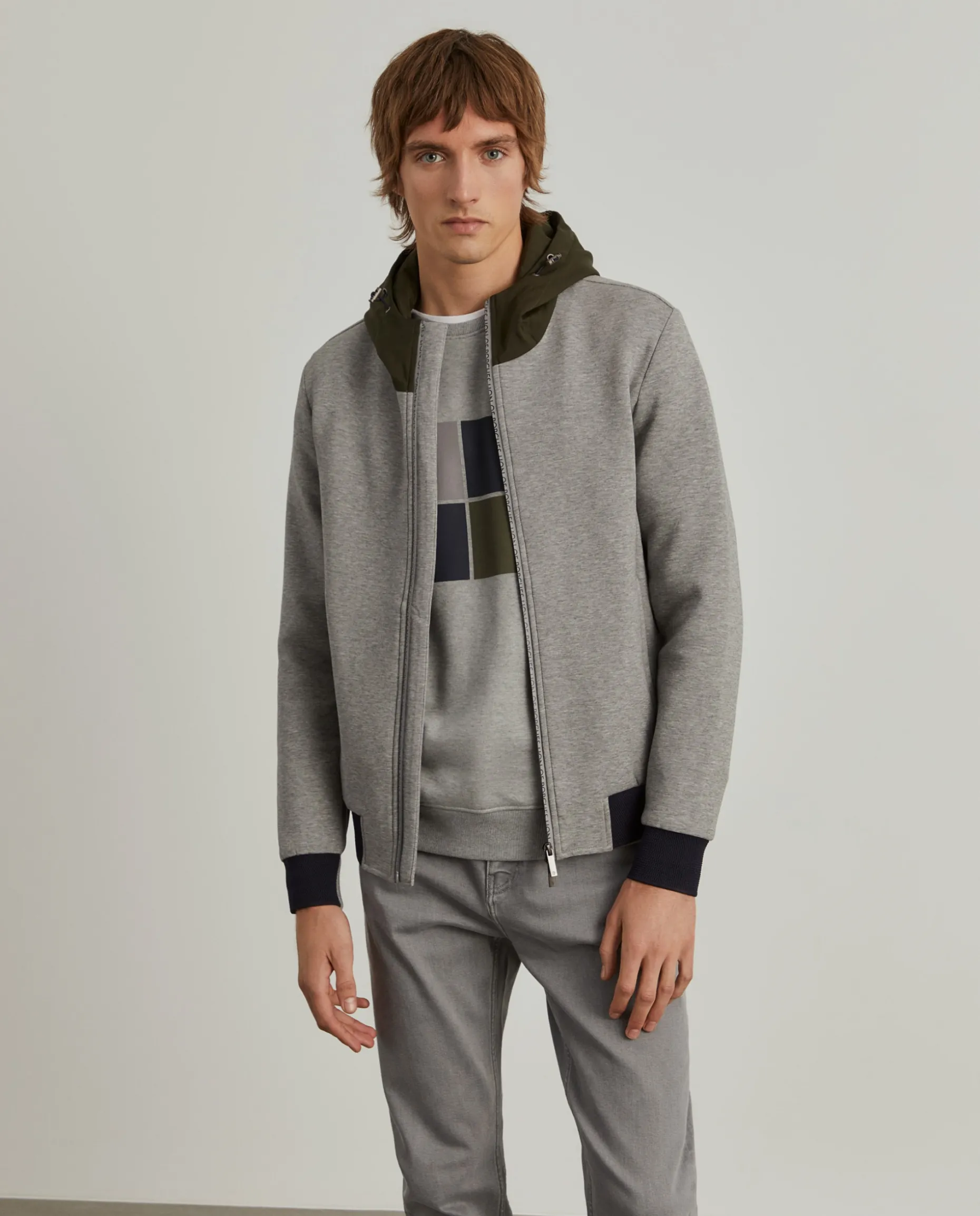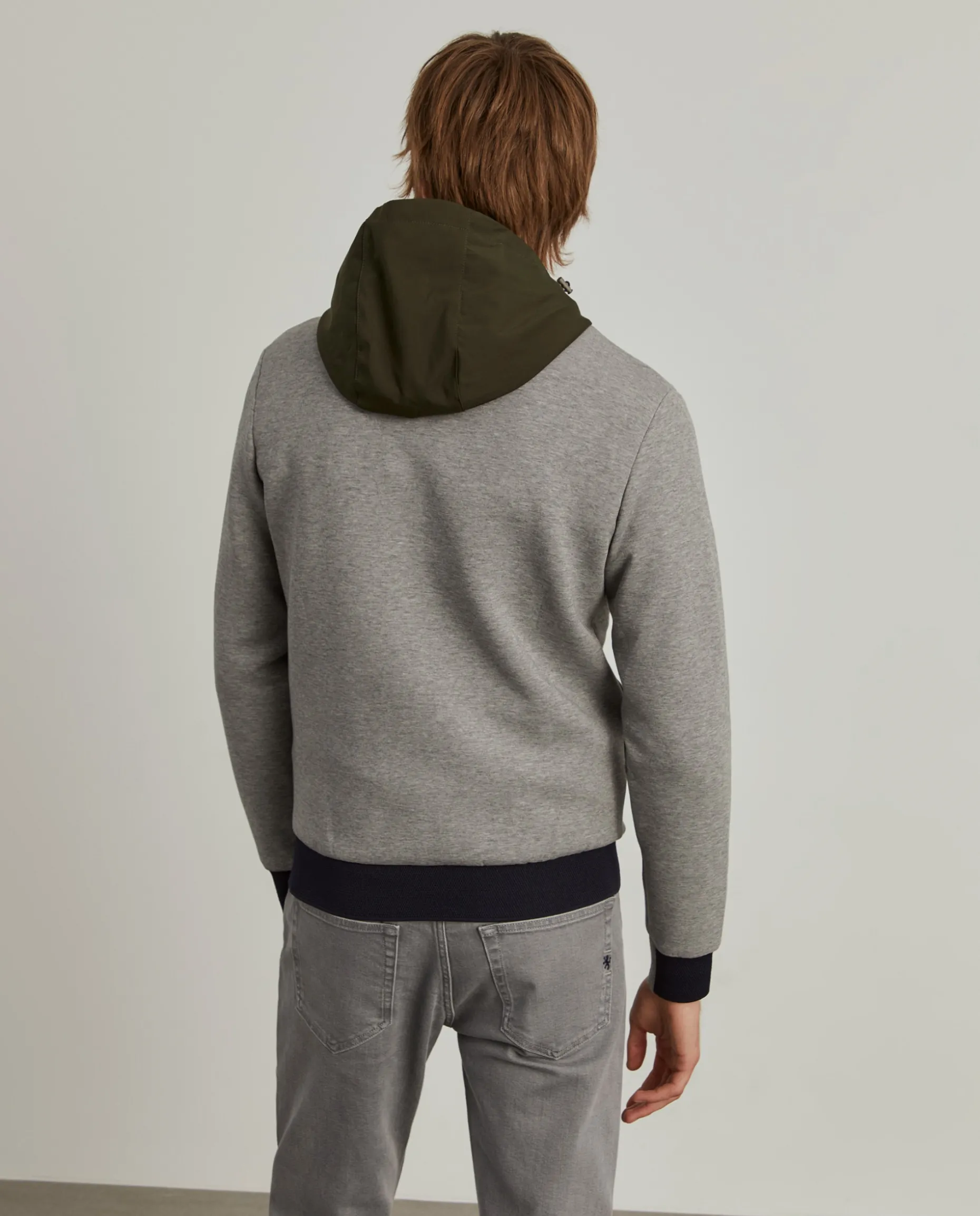 Casaco em malha, de manga comprida, com capuz em tecido técnico em contraste. Com fecho frontal duplo vulcanizado com estampado Lion of Porches em contraste por toda a carcela. Noutra cor estão também a base e os punhos elásticos. Tem ainda bolsos laterais com fecho.