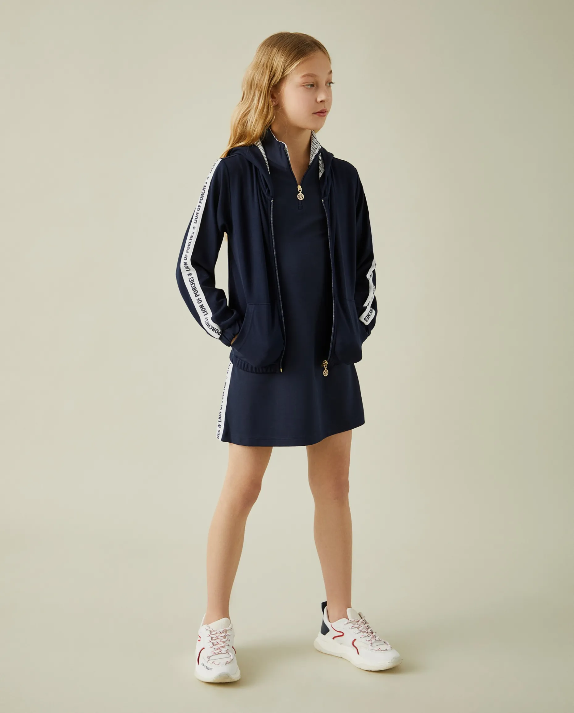 Casaco de malha de cor lisa com capuz. Aperta com fecho e tem dois bolsos fontais. Pormenor diferenciador de fita em contraste nas mangas com branding Lion of Porches. O interior do capuz é em rede noutra cor. Os punhos são elásticos.