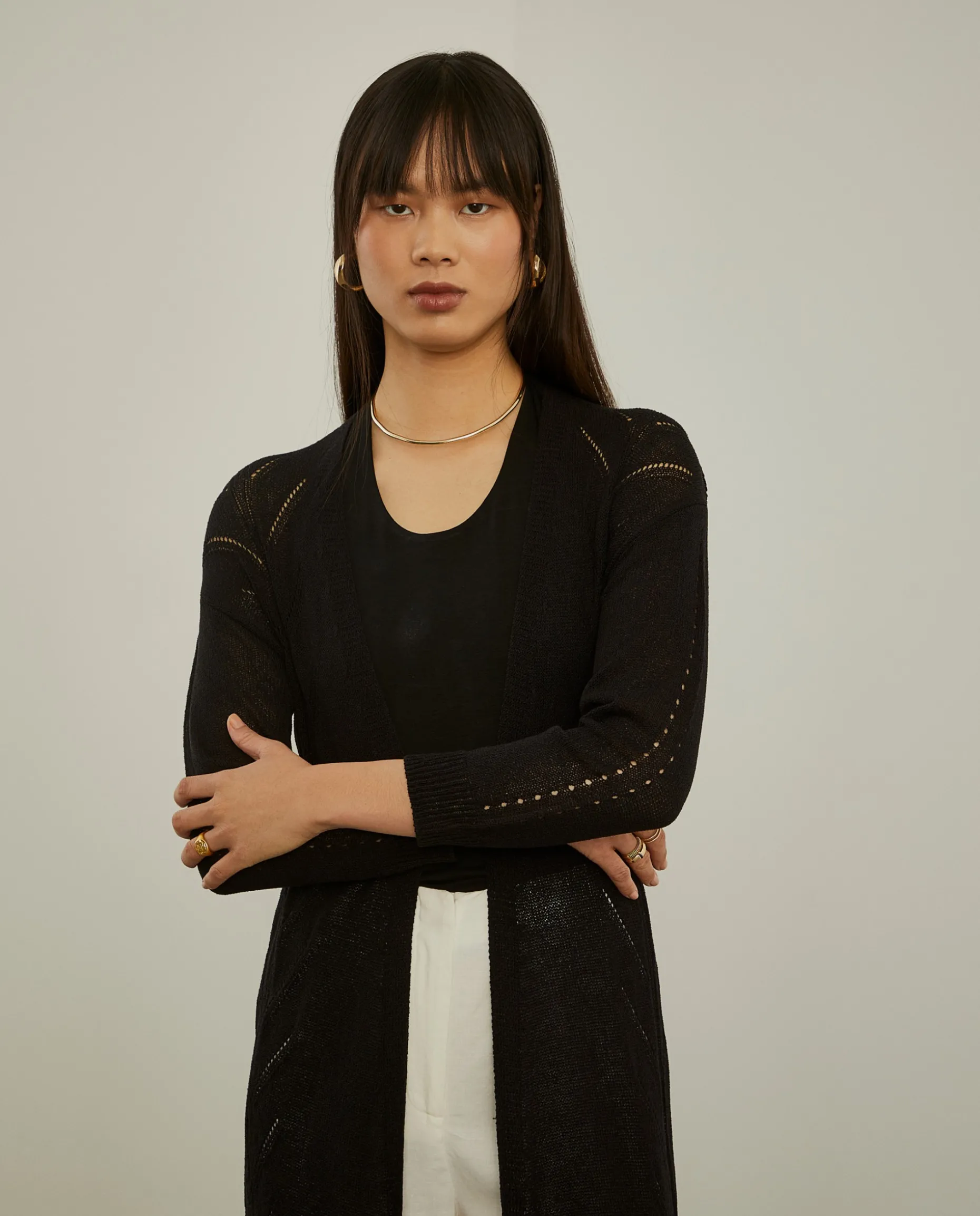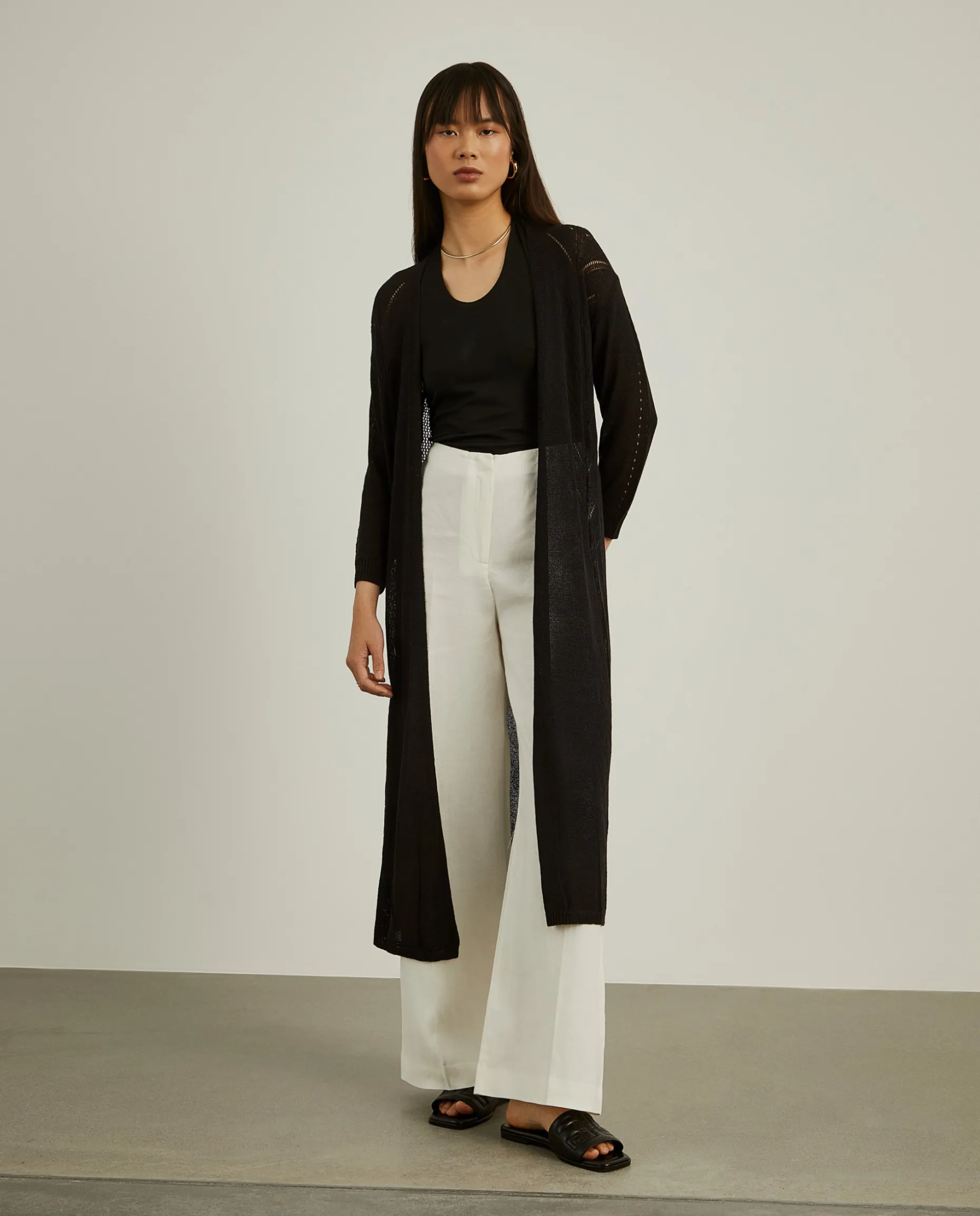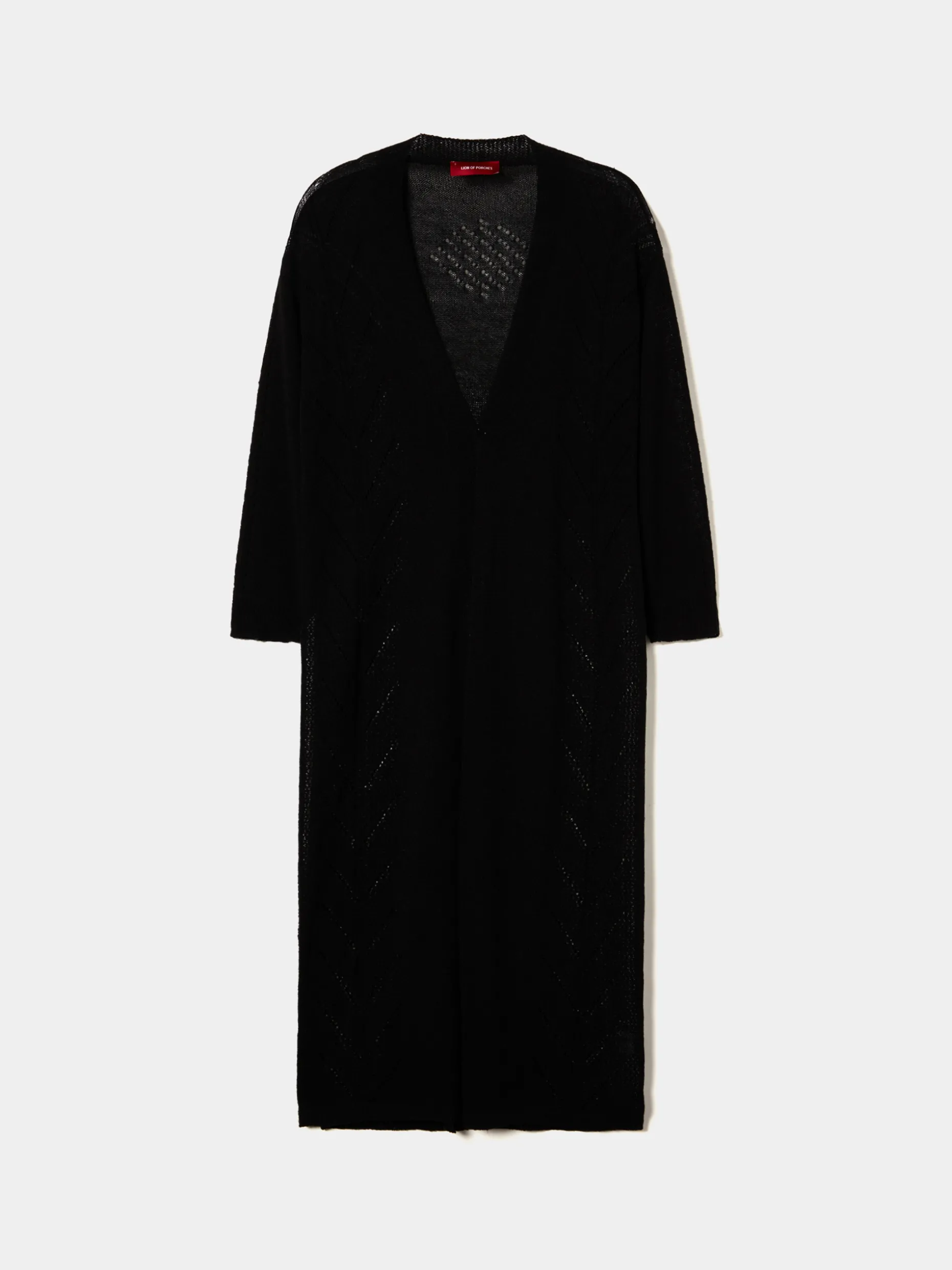 Casaco de malha comprido com estrutura de malha geométrica. De decote em V, a gola, base e punhos são canelados.