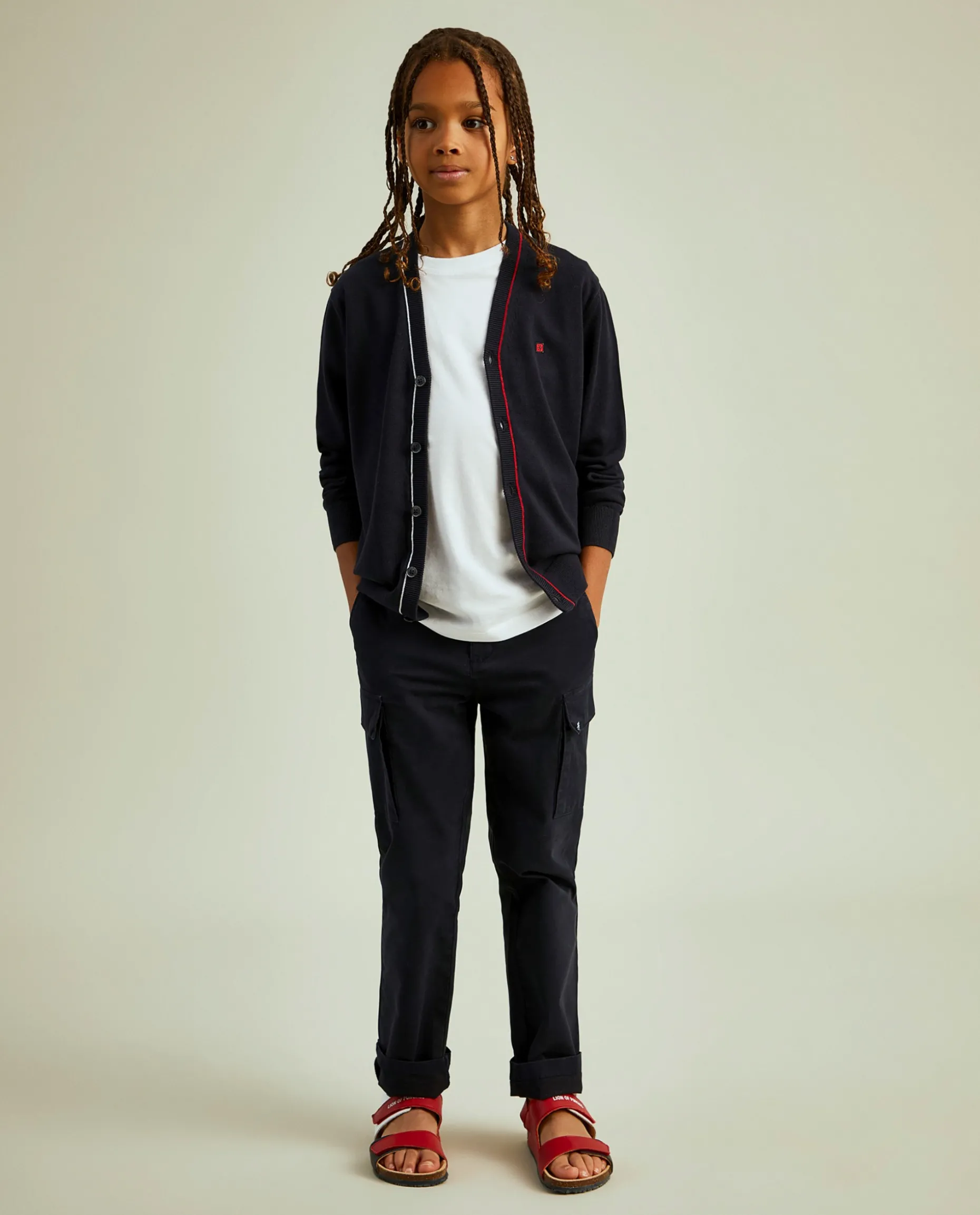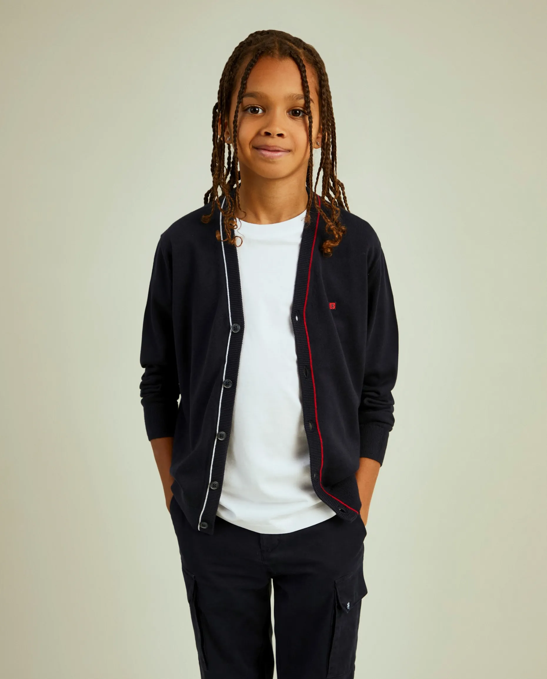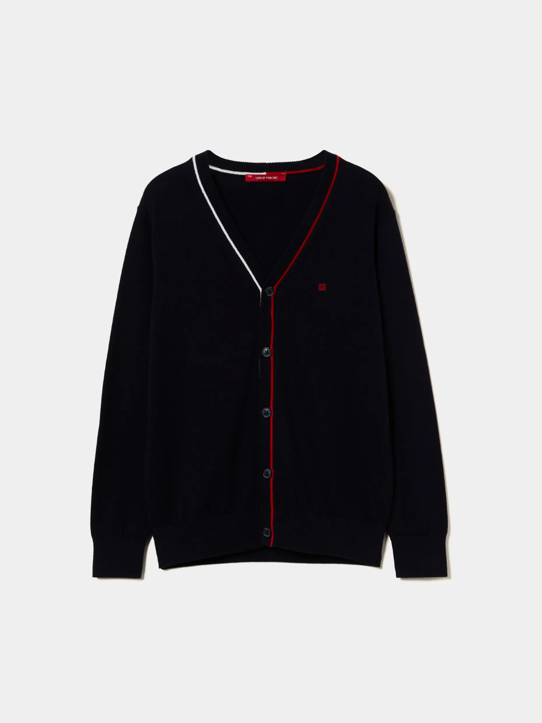Casaco de malha com botões e decote V. Pormenor diferenciador de riscas em contraste à volta do decote e por toda a carcela. Base, punhos e gola canelados. Finaliza com etiqueta leão da marca em contraste de cor no peito.