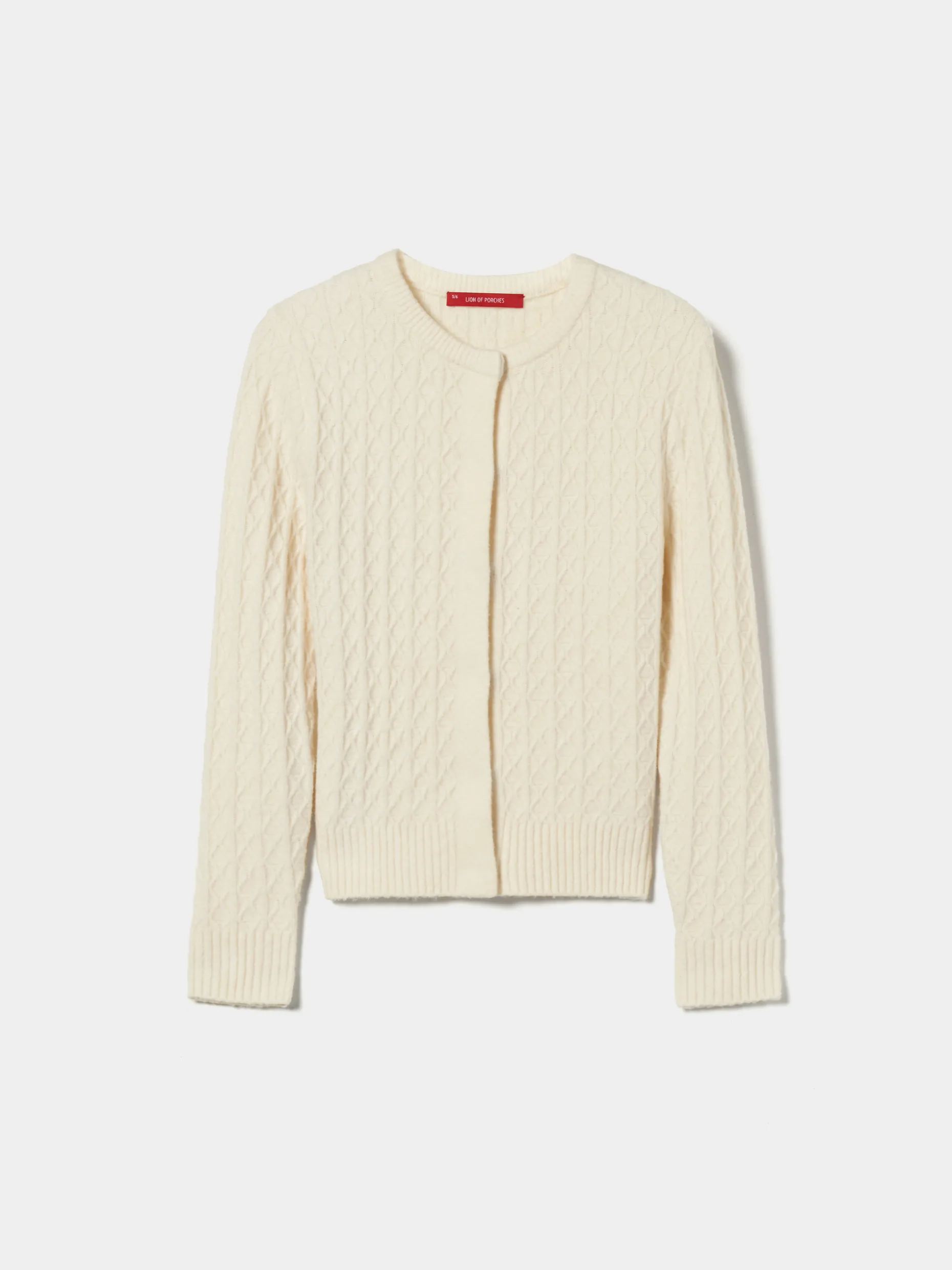 Casaco de malha quentinho e confortável, com manga comprida e textura ondulada. Aperta na frente com molas escondidas e finaliza com canelado na base, gola e punhos. Placa Lion no fundo.