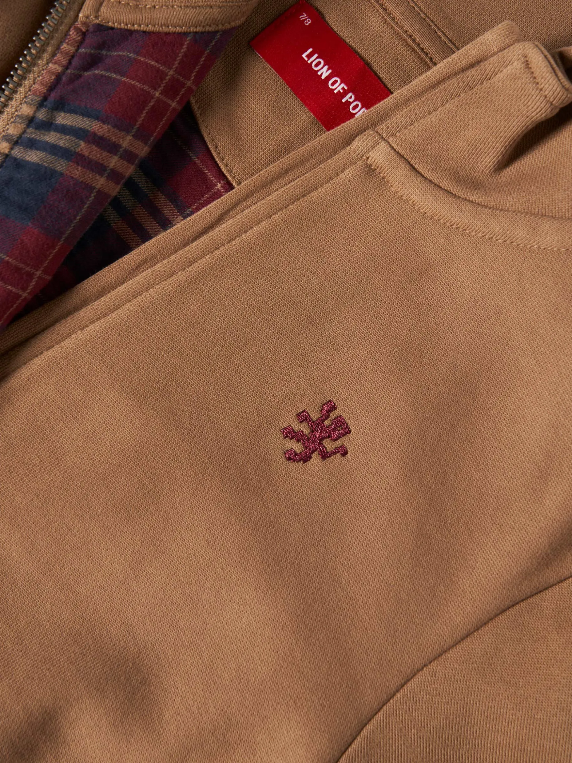 Casaco de manga comprida em malha com fecho de duplo cursor. Bolsos laterais com fecho zíper. Leão da marca em contraste no peito. Interior em xadrez em contraste.