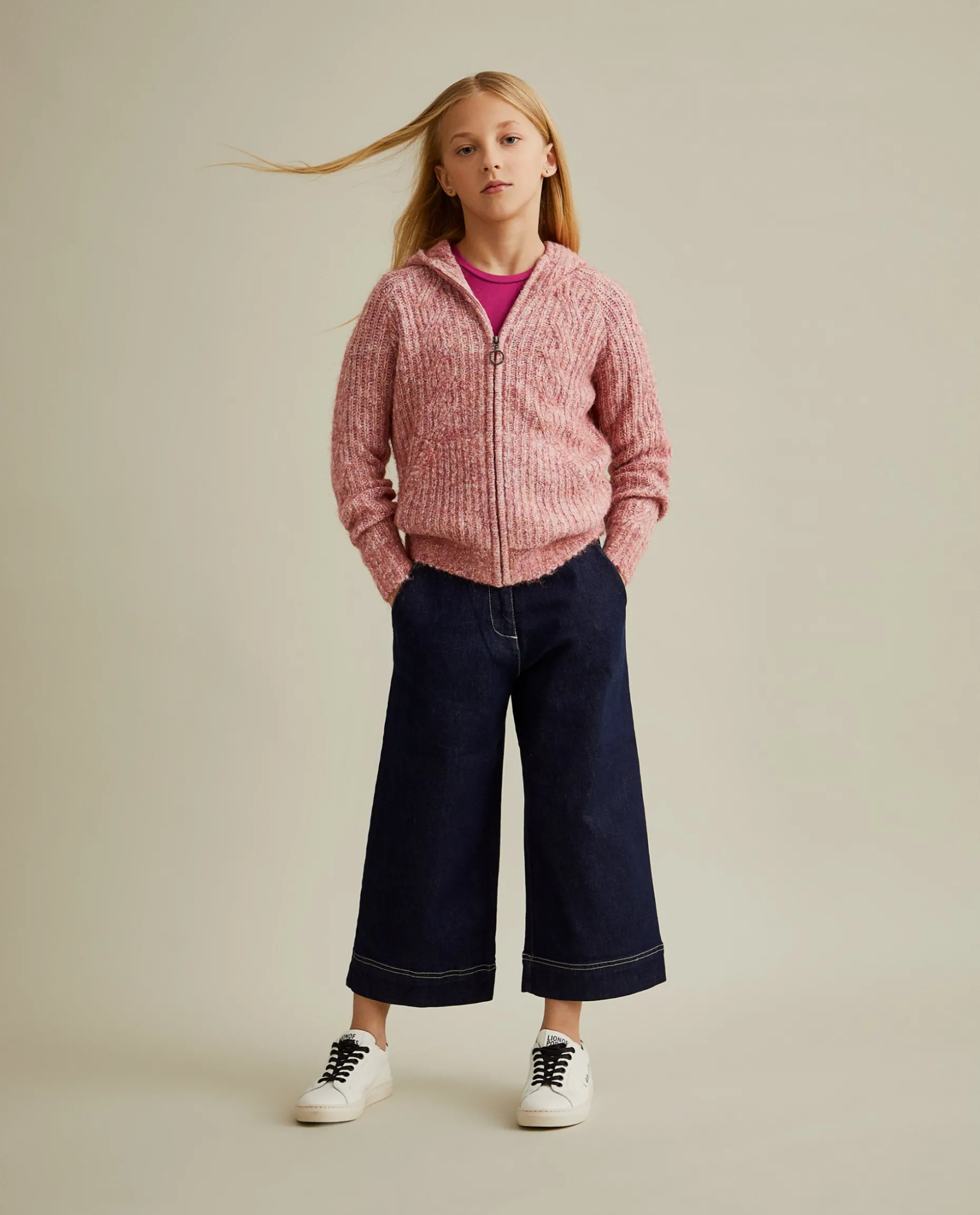Casaco de malha tricotada com capuz, perfeito para garantir conforto nos dias mais frios. Aperta na frente com fecho de cursor personalizado e finaliza com bolsos na frente.