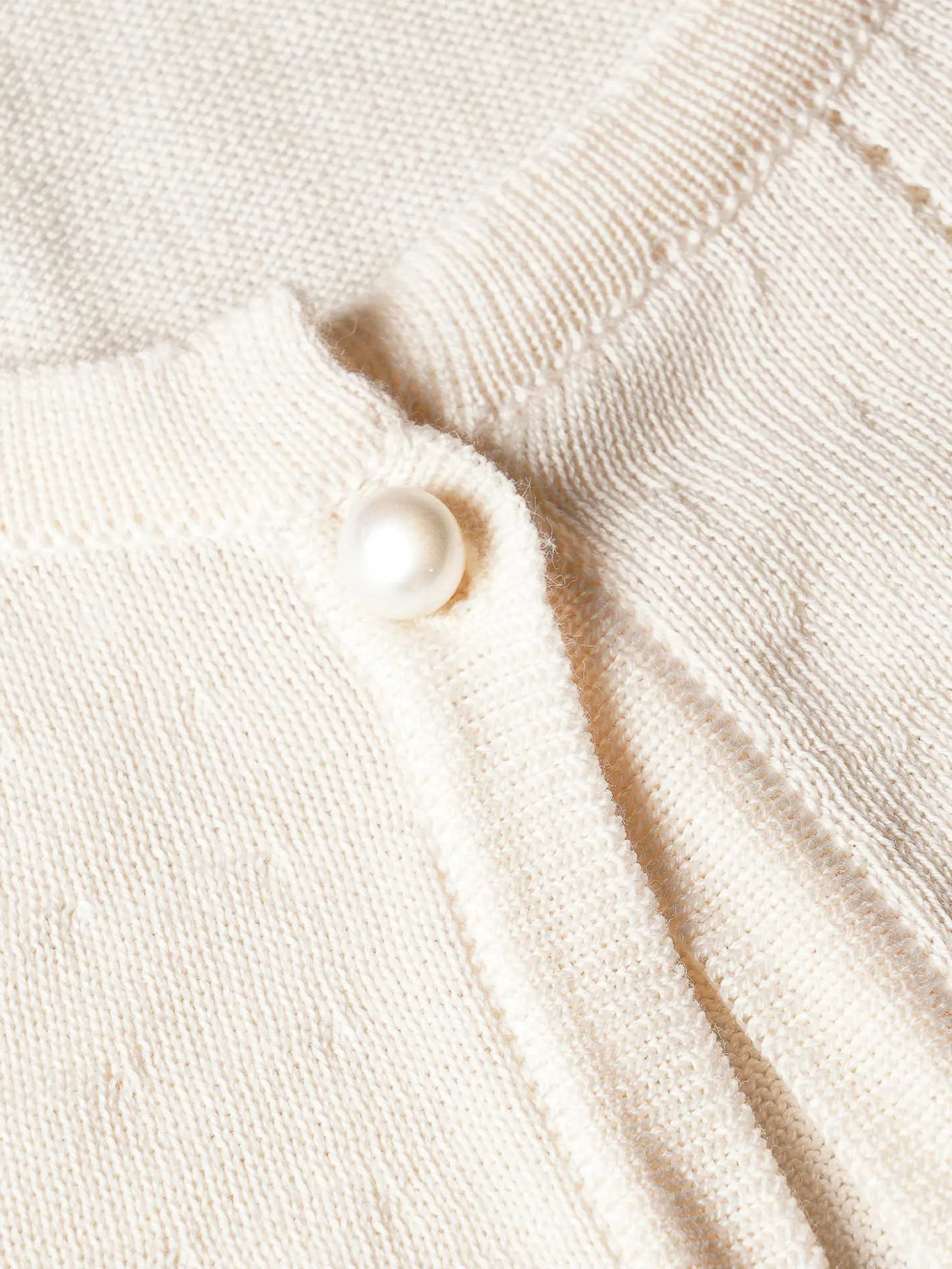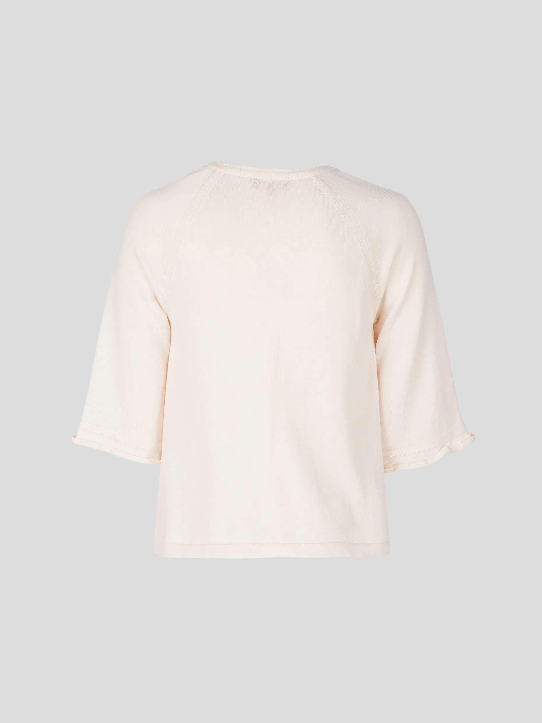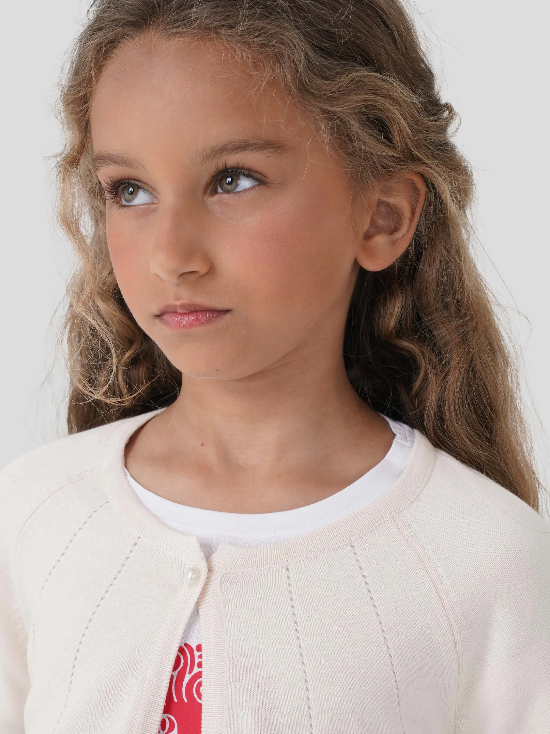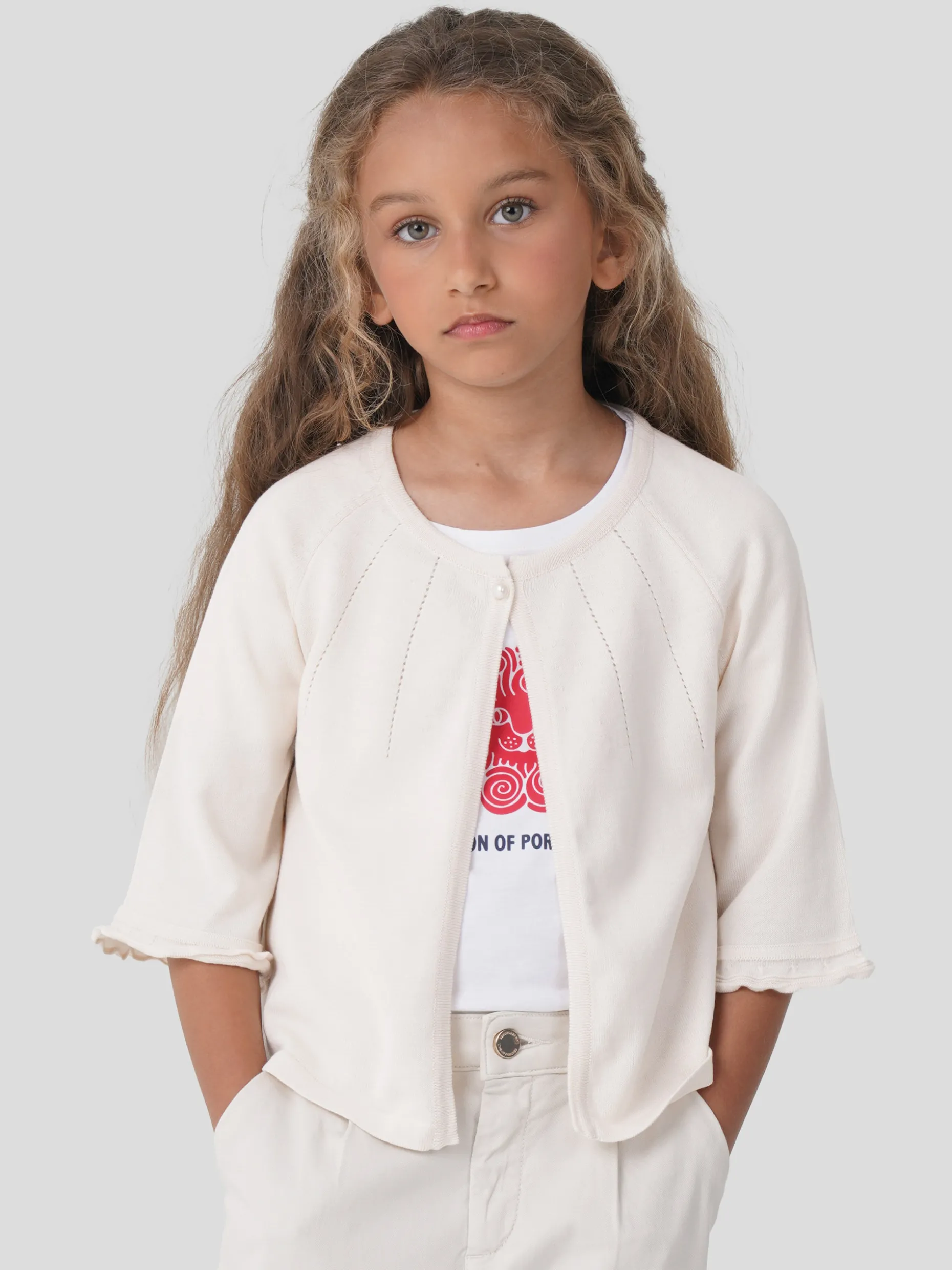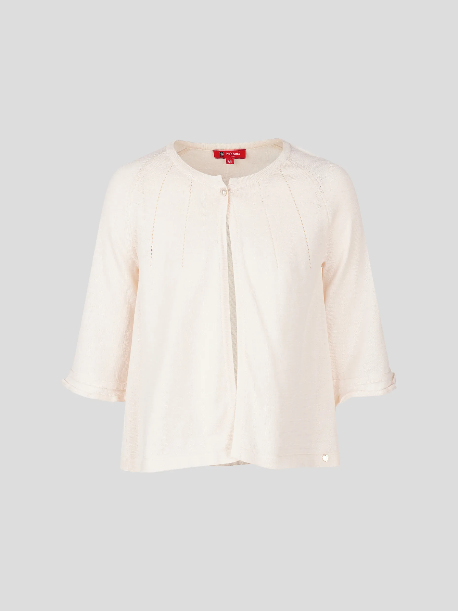 Bolero super feminino em algodão macio com ajours. Mangas 3/4 com pequeno folho. Aperta com um botão em forma de pérola. Pequeno coração dourado com monograma “LP” na base.