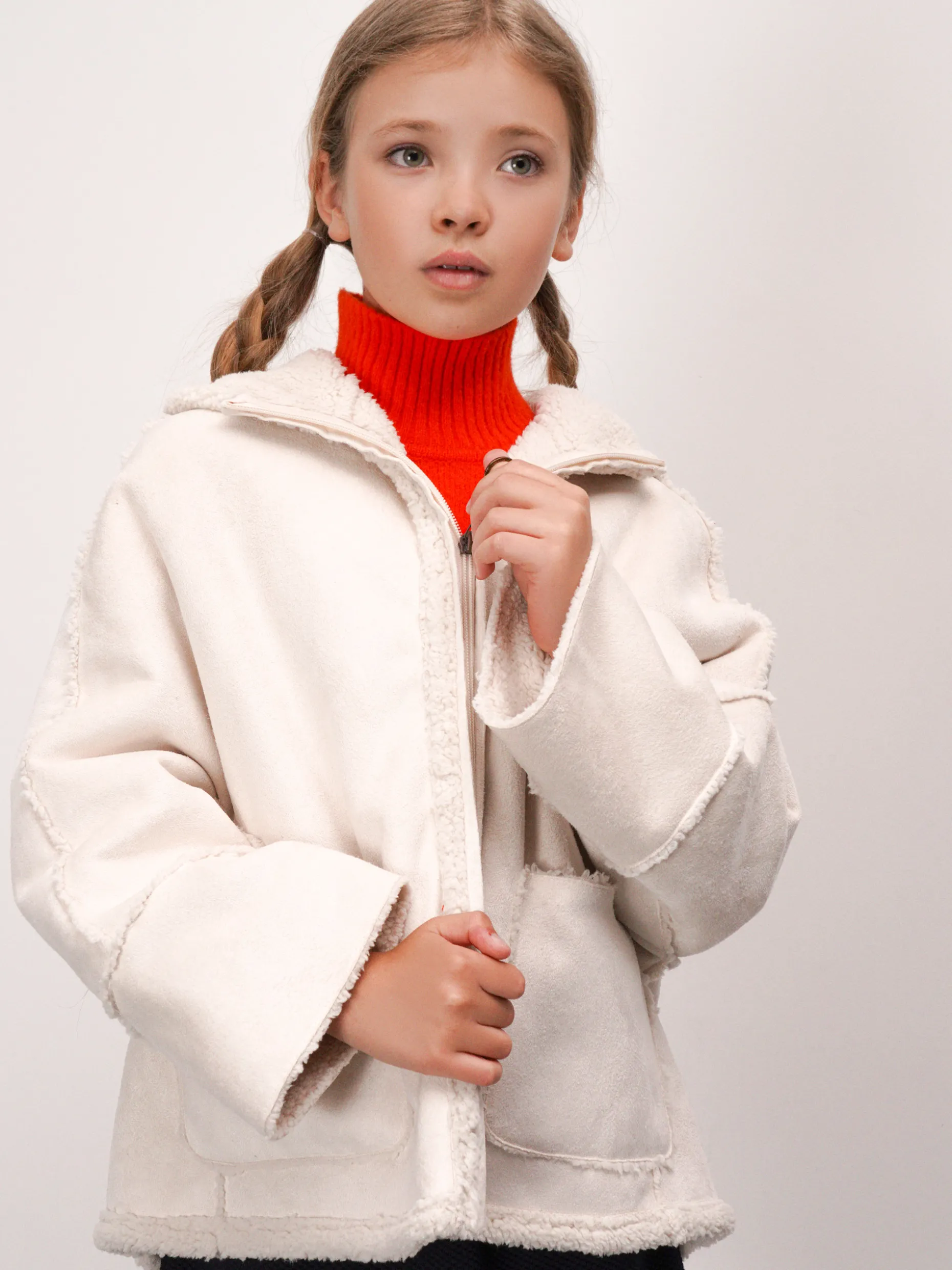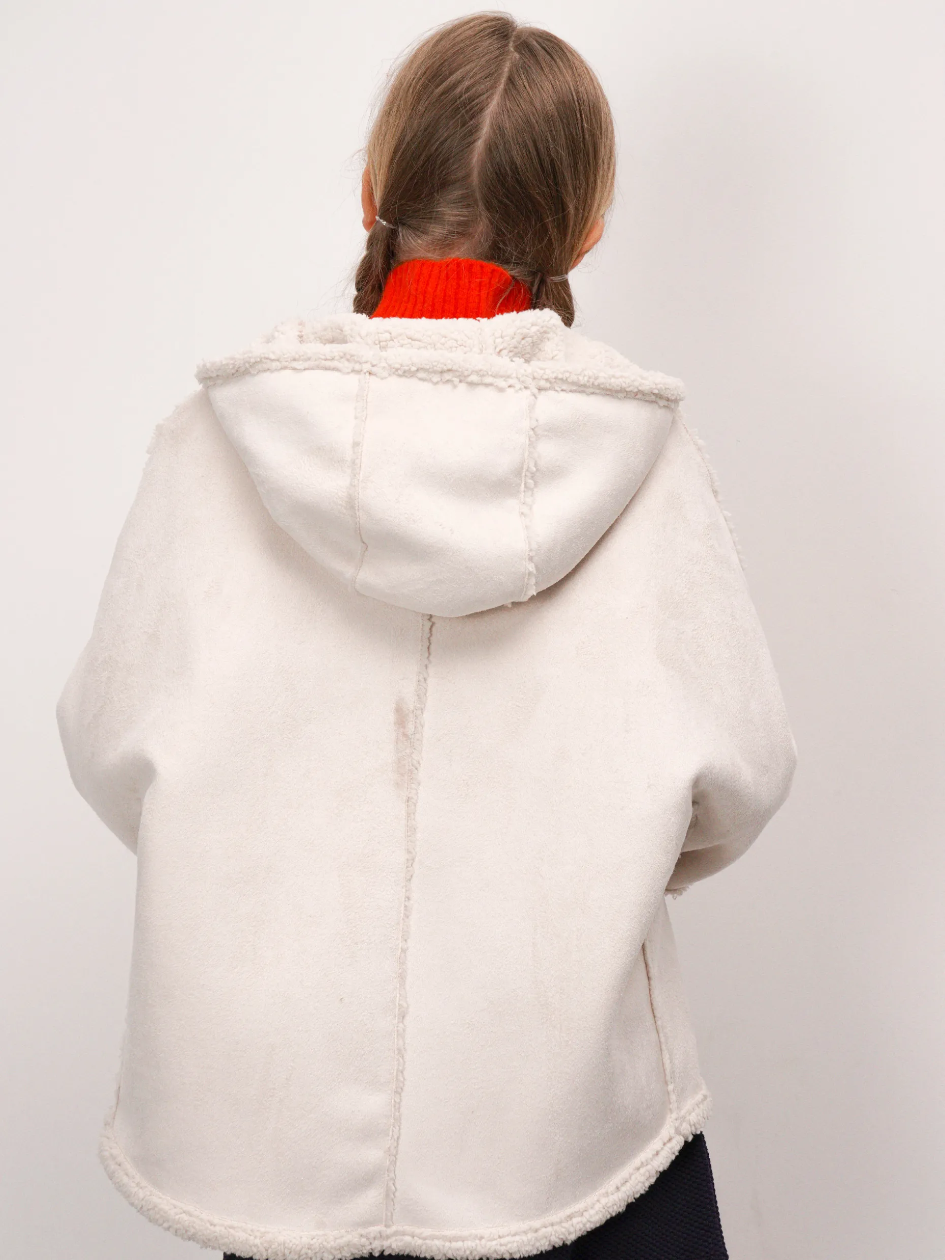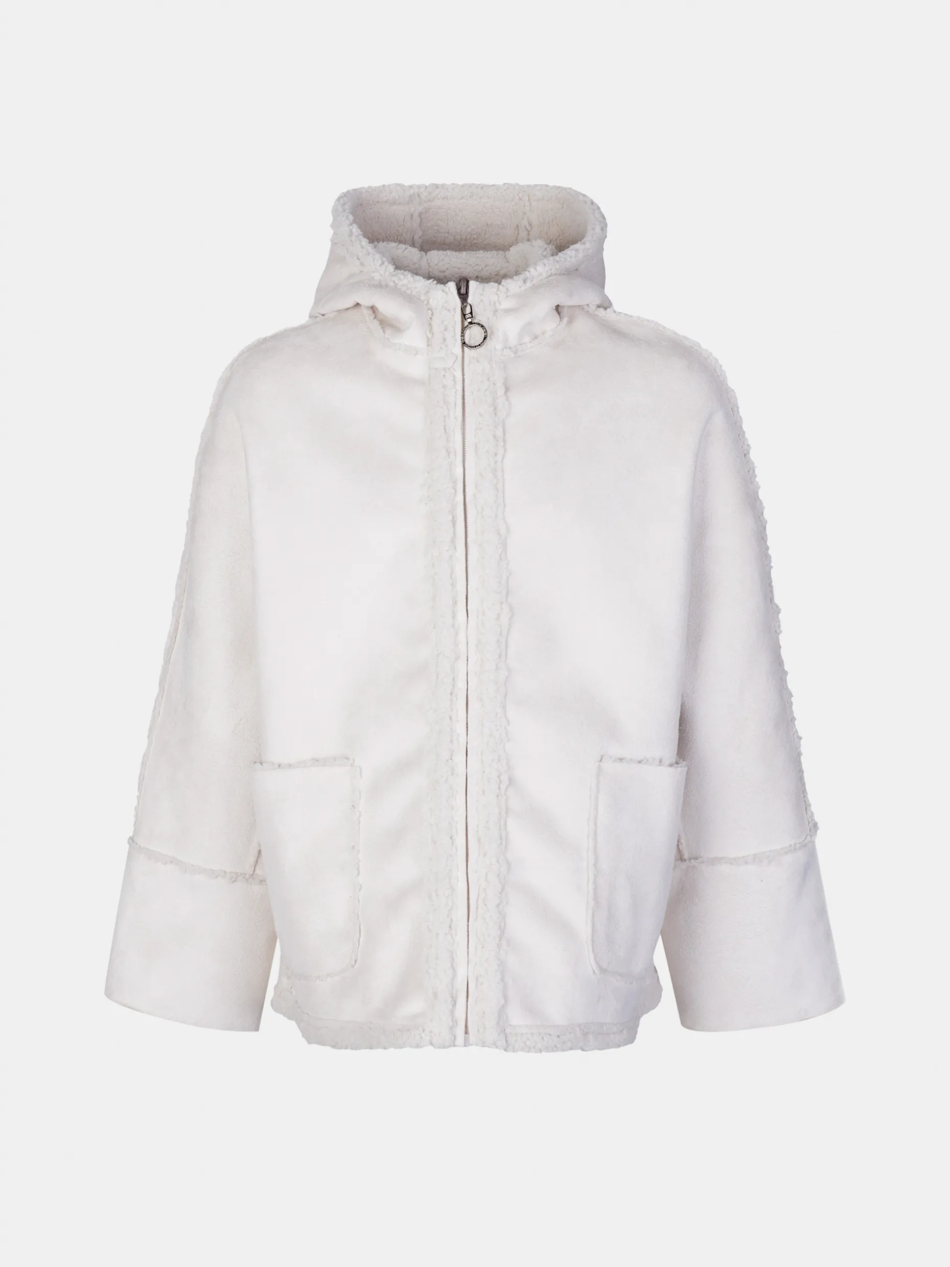 Casaco oversize com capuz confecionado em pele sintética com forro em sherpa. Manga raglan. Aperta com fecho na frente. Dois bolsos frontais.