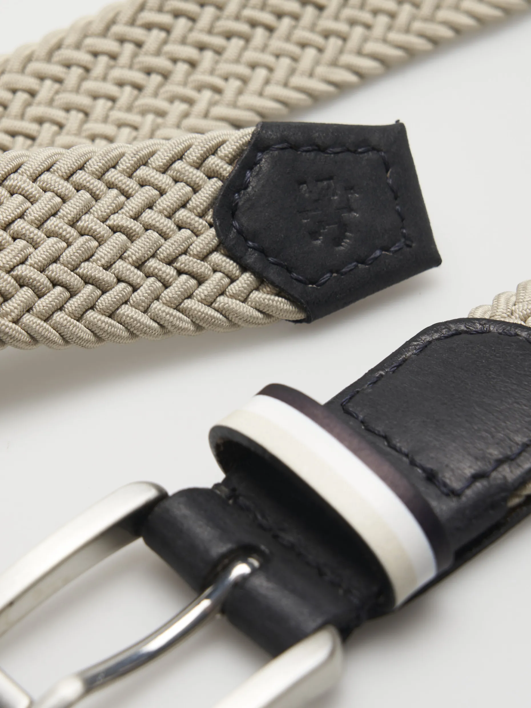 Cinto entrançado com cantos em pele em contraste. De fivela quadrada e pormenor diferenciador de presilha com fita tricolor. Na ponta, leão da marca gravado.