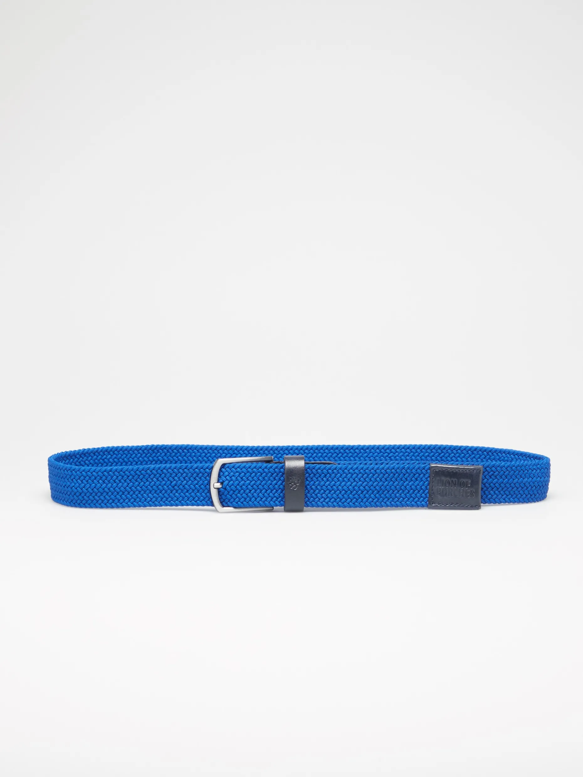 Cinto com entrançado elástico e fivela metálica. Presilha em pele com gravação a cunho de leão pixelizado da marca. Extremidade em pele com gravação Lion Of Porches.