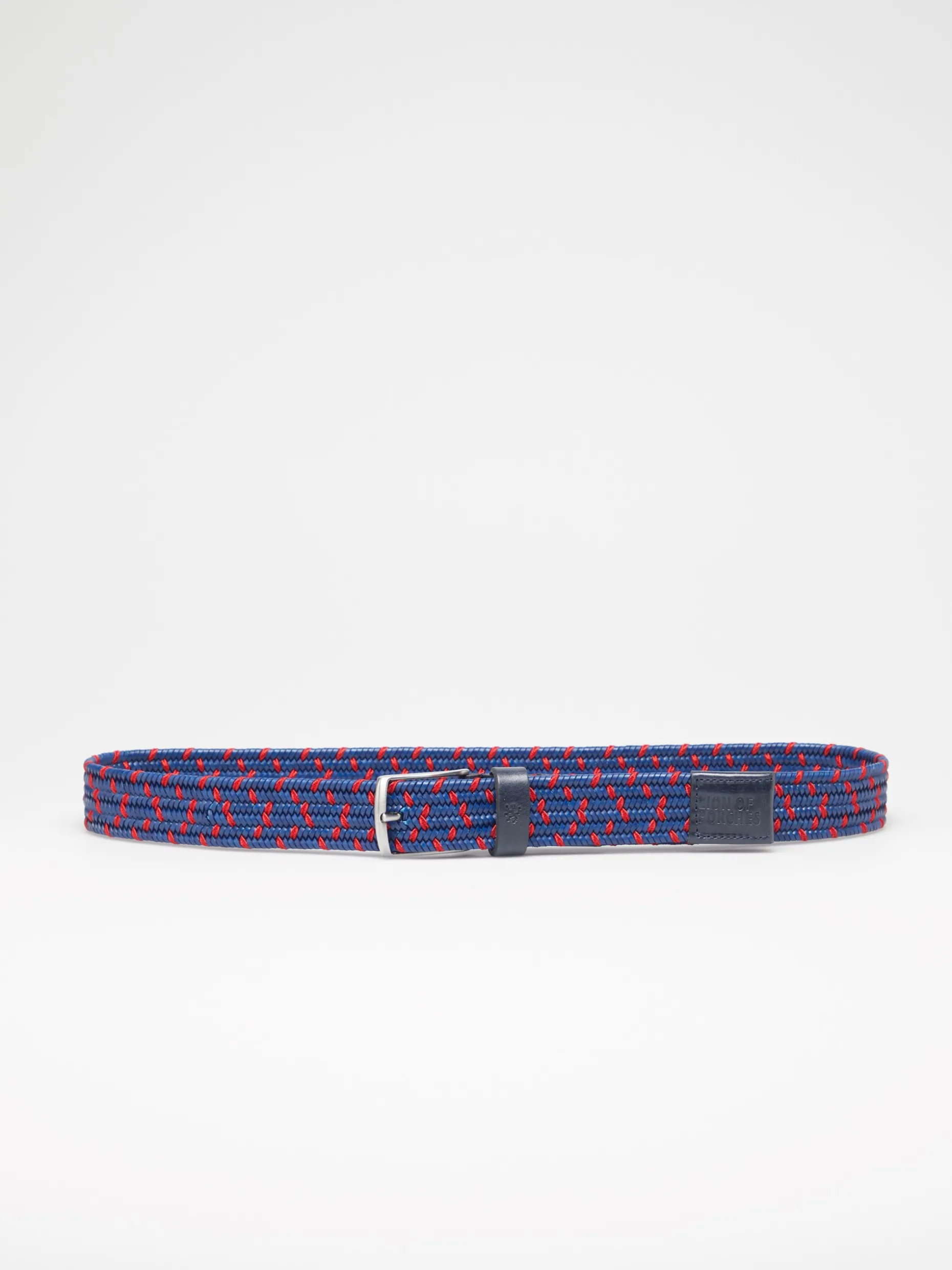 Cinto com entrançado elástico bicolor e fivela metálica. Presilha em pele com gravação a cunho de leão pixelizado da marca. Extremidade em pele com gravação Lion Of Porches.