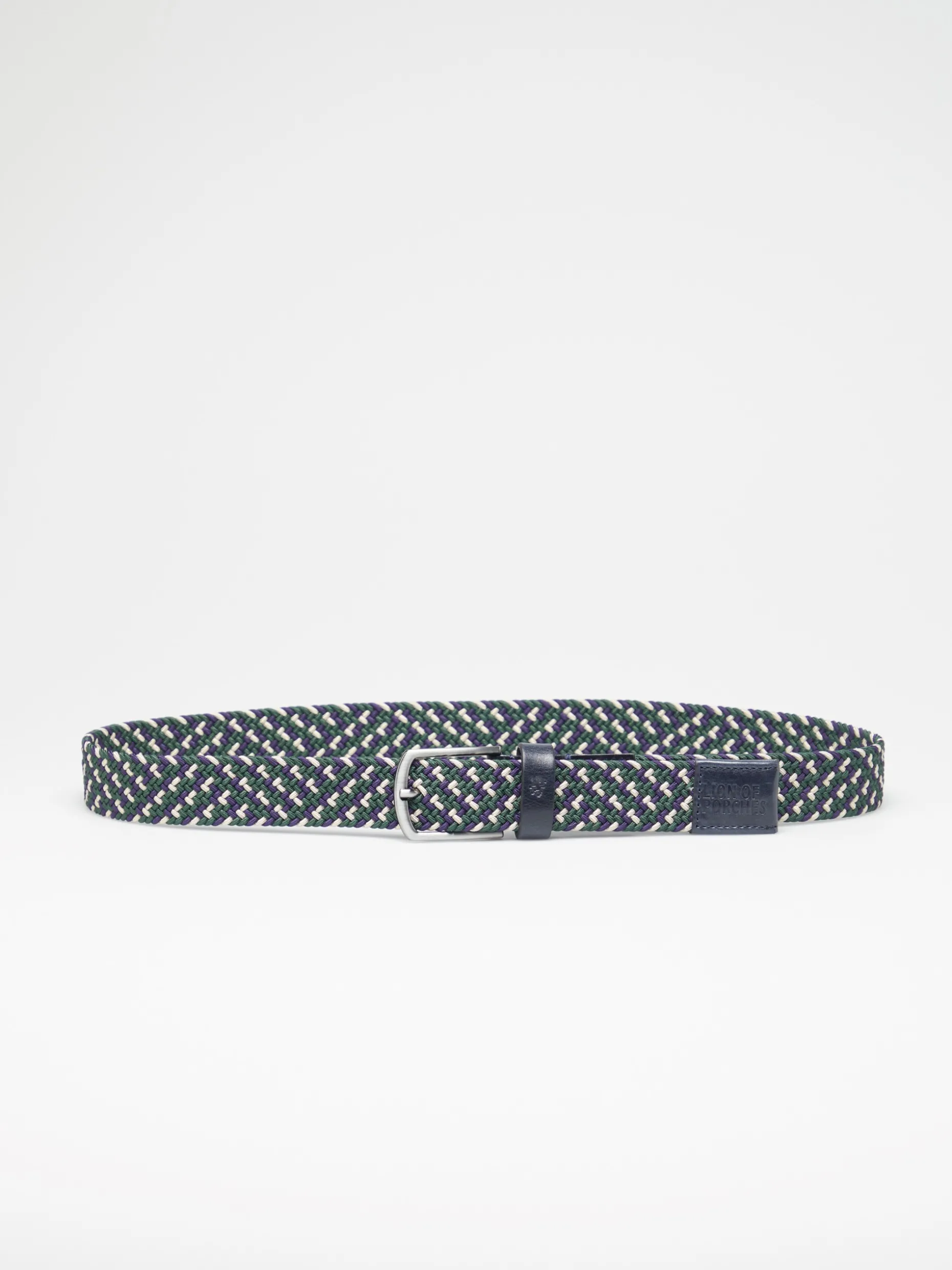 Cinto com entrançado elástico tricolor e fivela metálica. Presilha em pele com gravação a cunho de leão pixelizado da marca. Extremidade em pele com gravação Lion Of Porches.