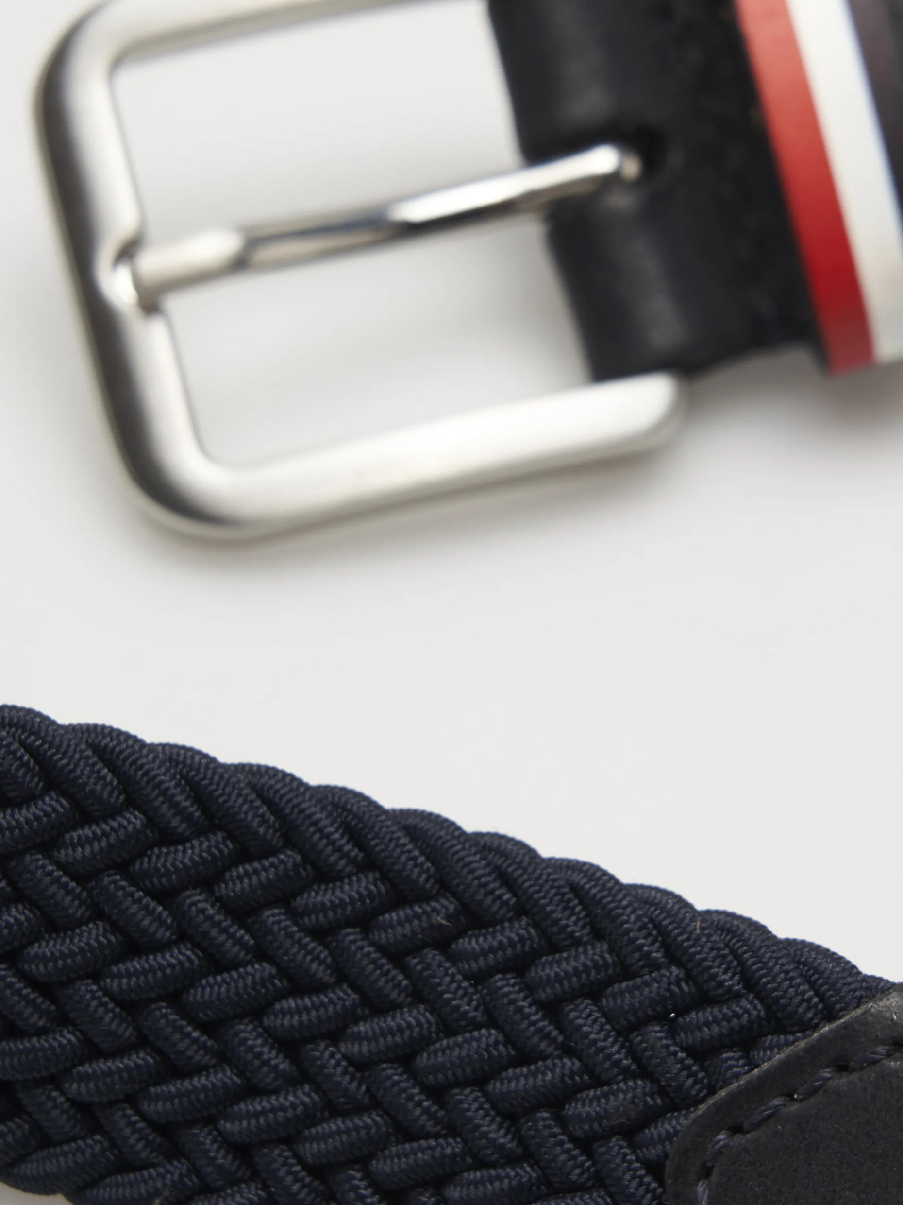 Cinto entrançado com cantos em pele em contraste. De fivela quadrada e pormenor diferenciador de presilha com fita tricolor. Na ponta, leão da marca gravado.
