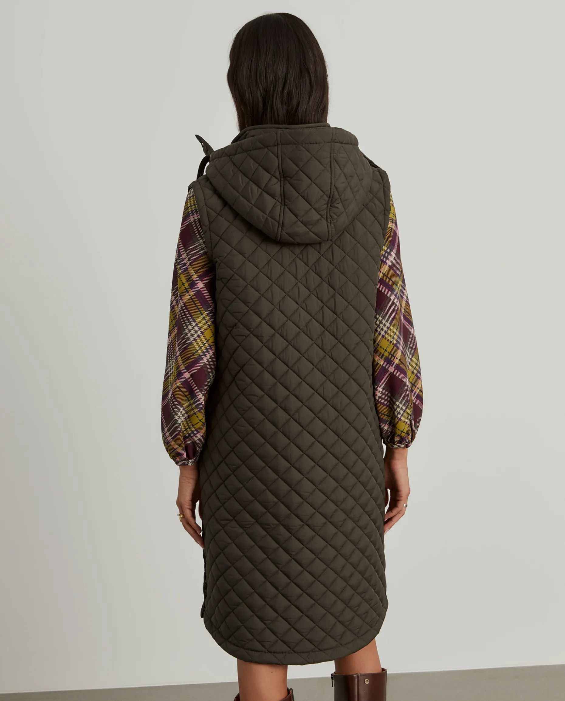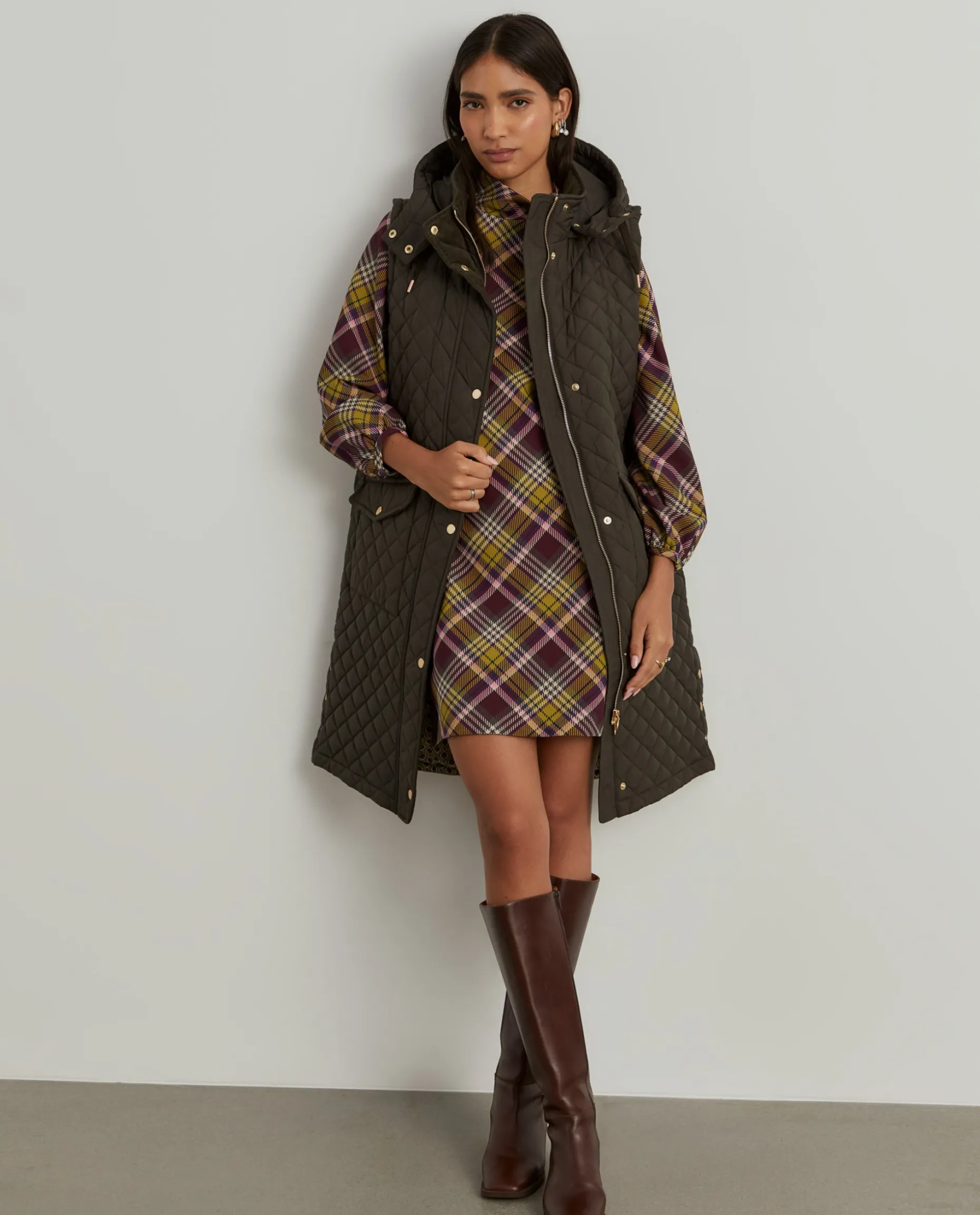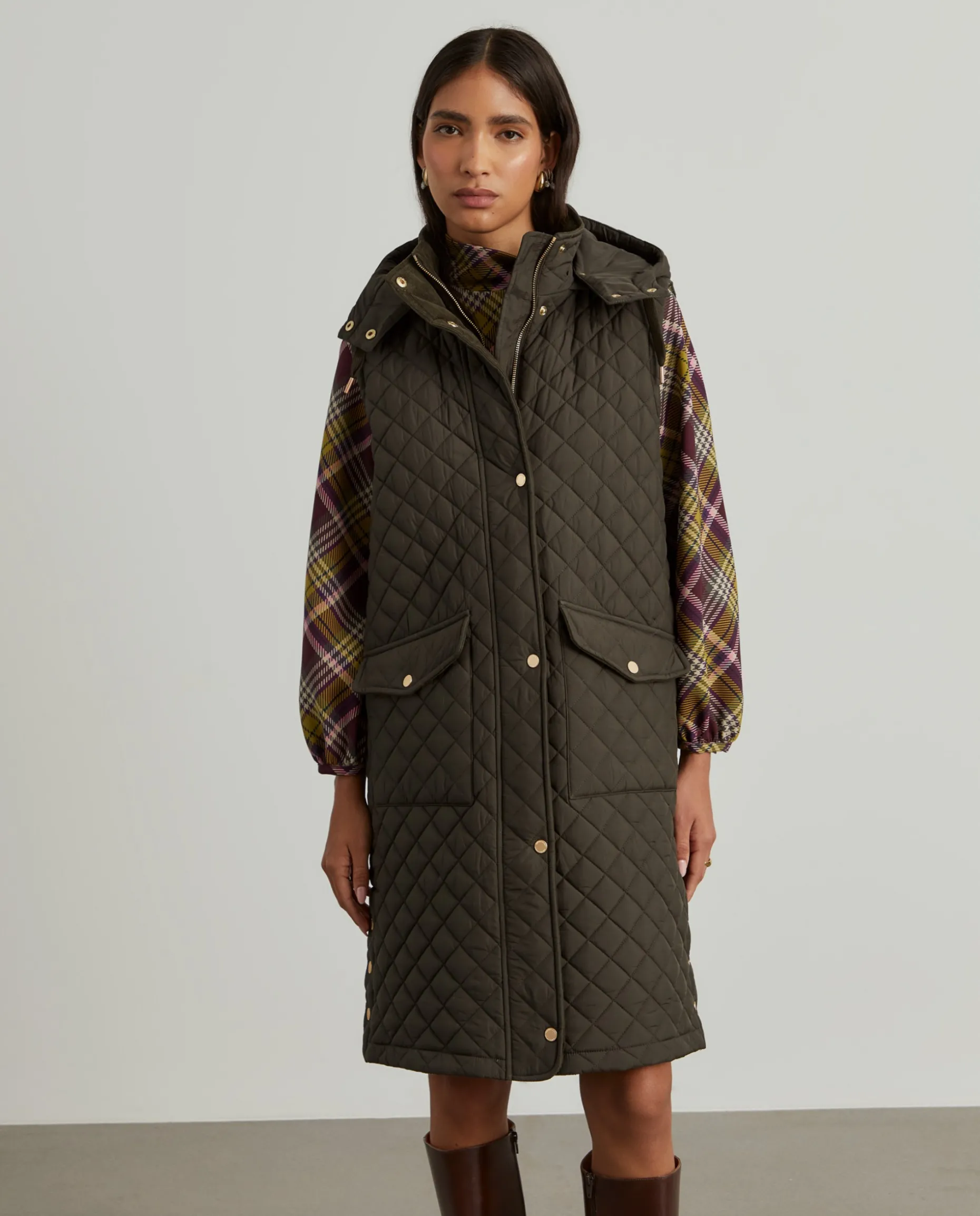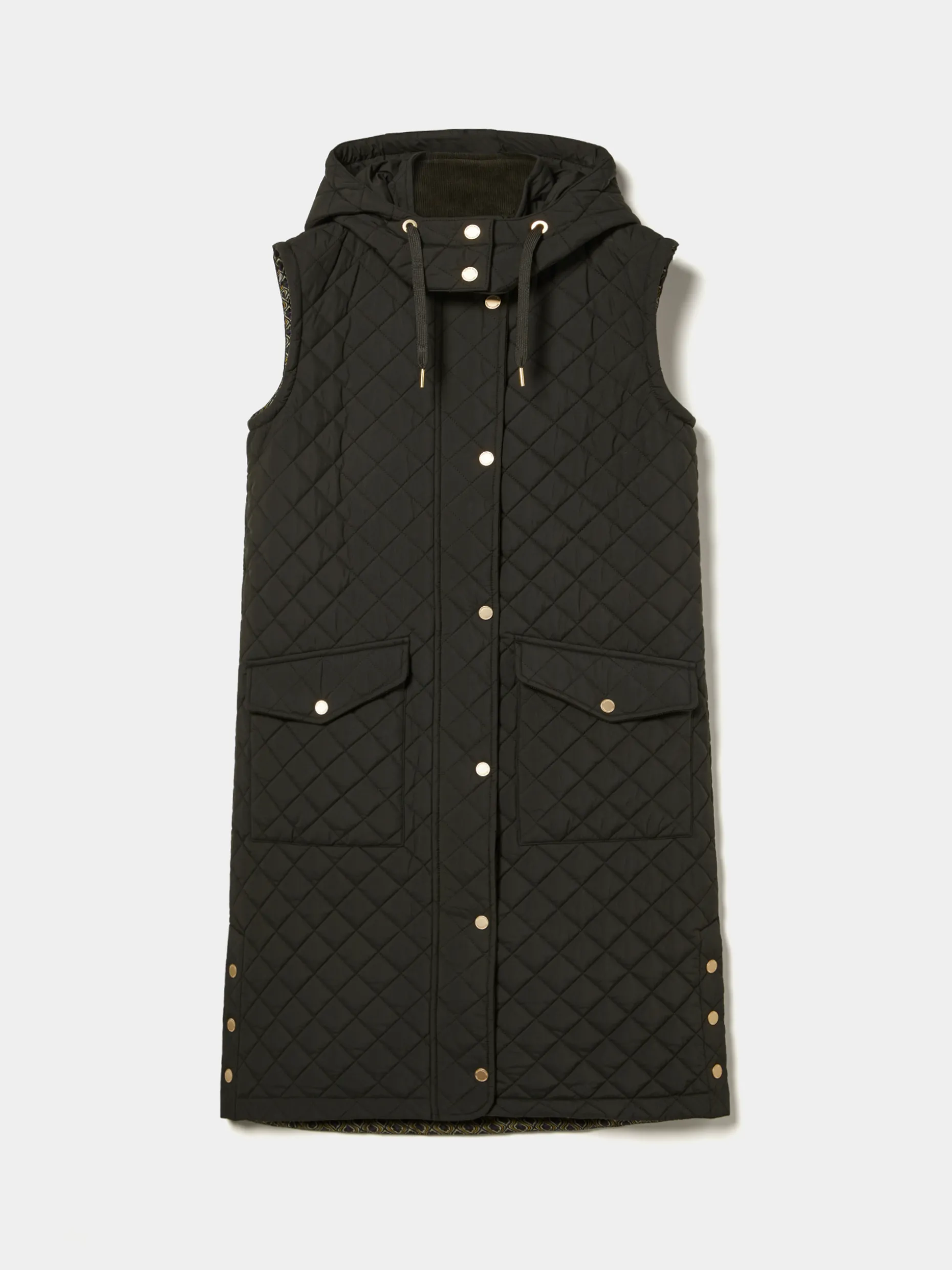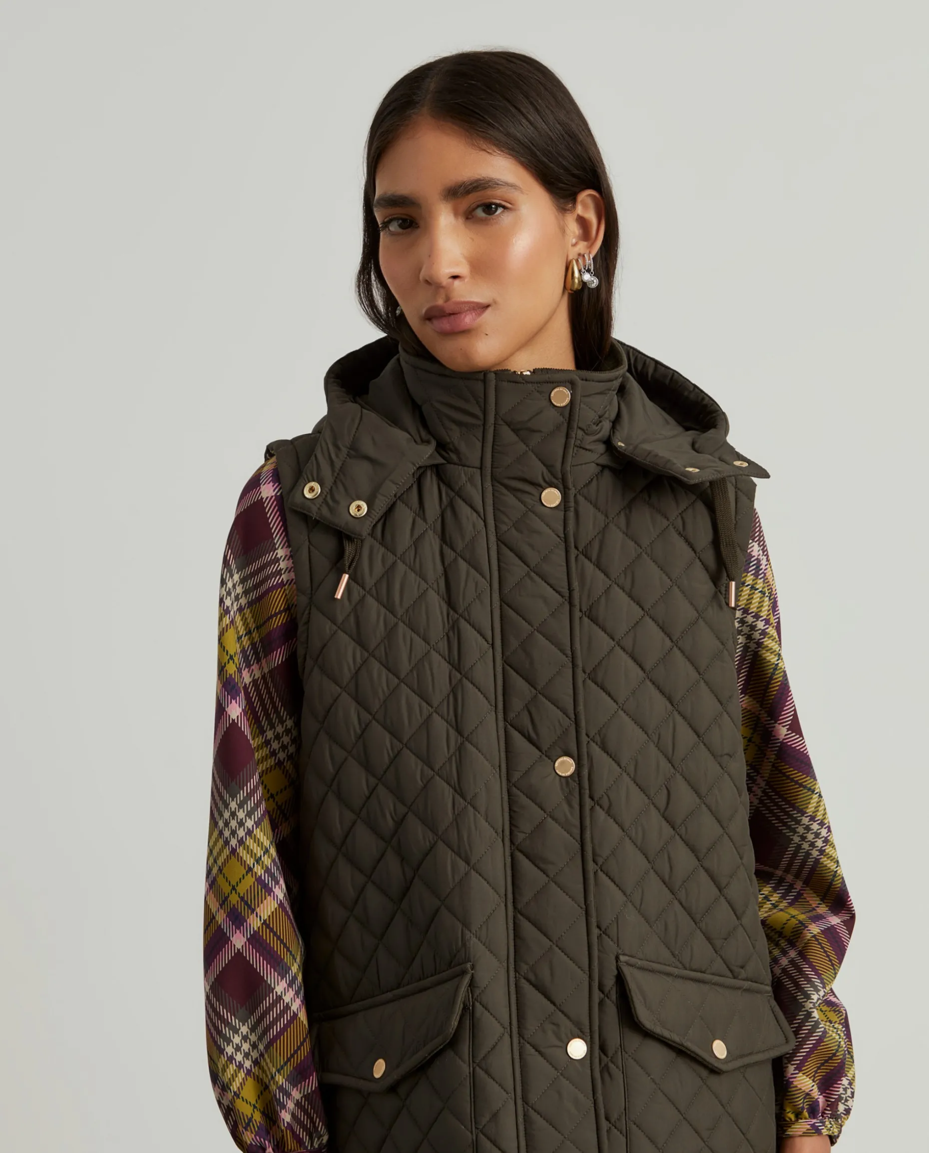 Adicione uma camada extra ao seu look com este colete comprido acolchoado. Aperta através de molas de pressão e conta com dois bolsos de pala frontais. Finaliza com capuz ajustável por cordão. Com forro interior com padrão em contraste e aberturas laterais na base.