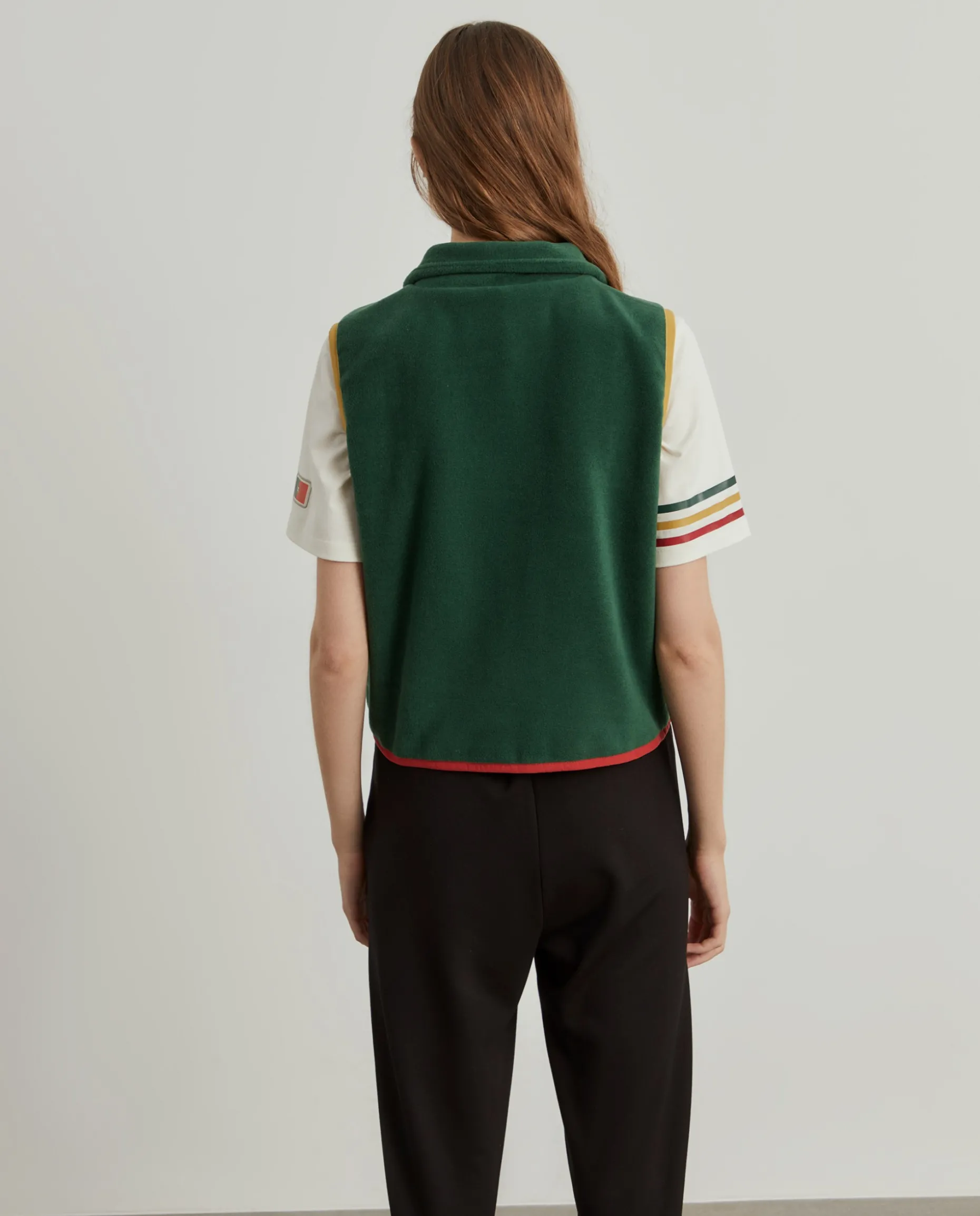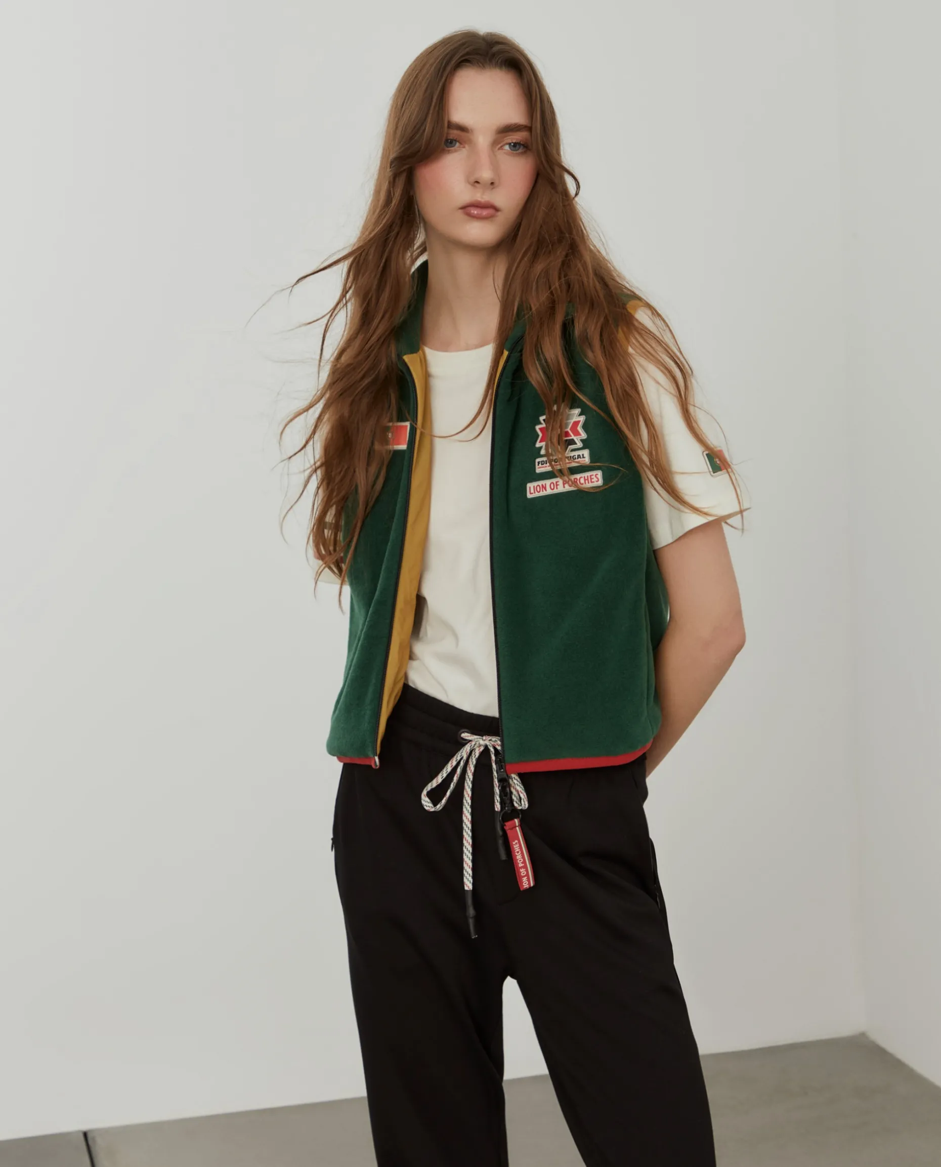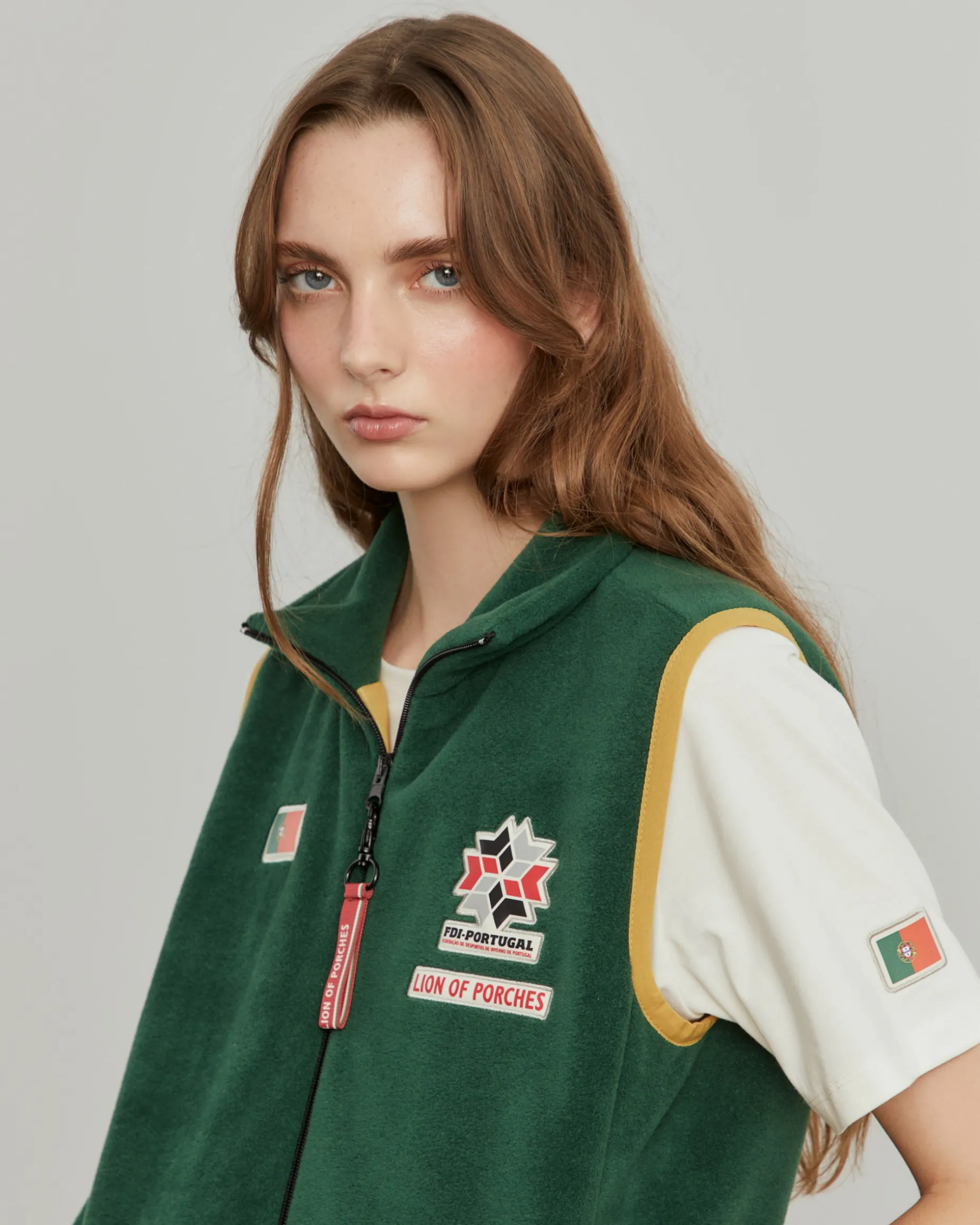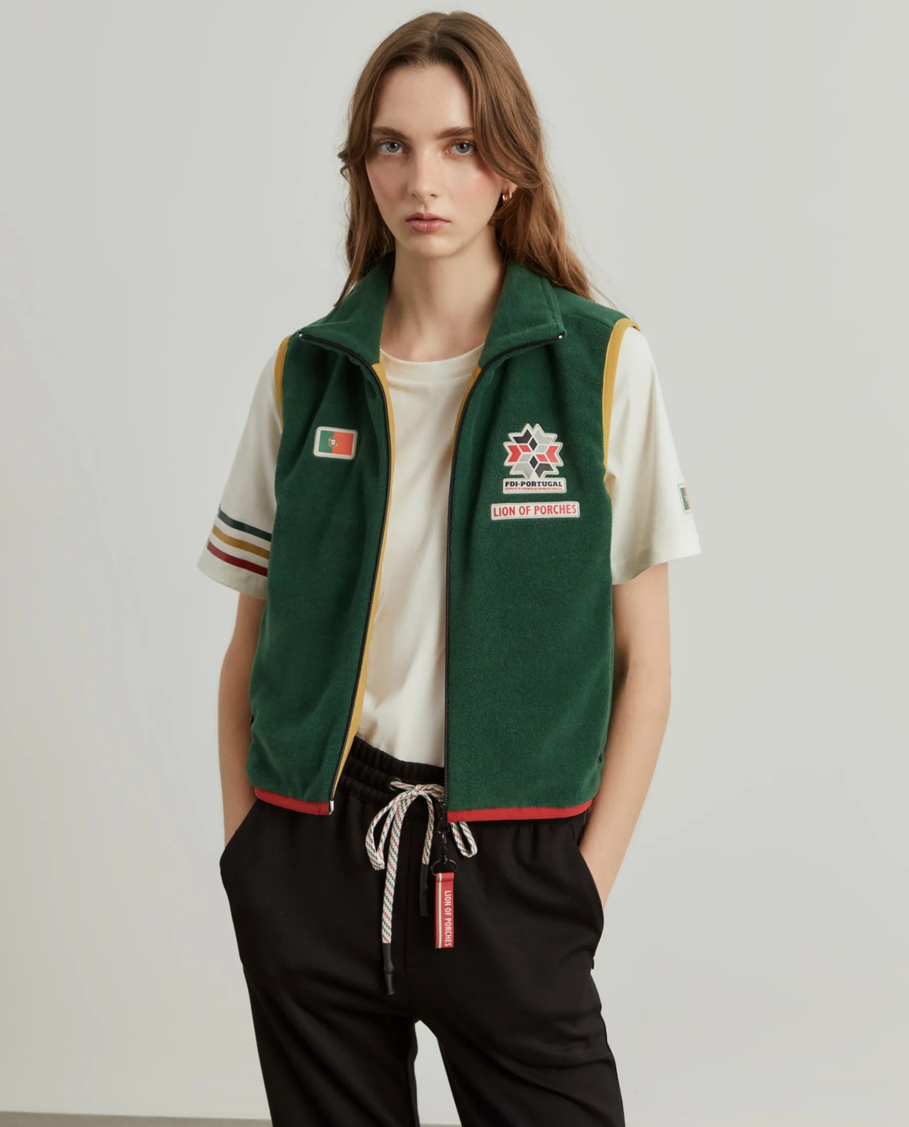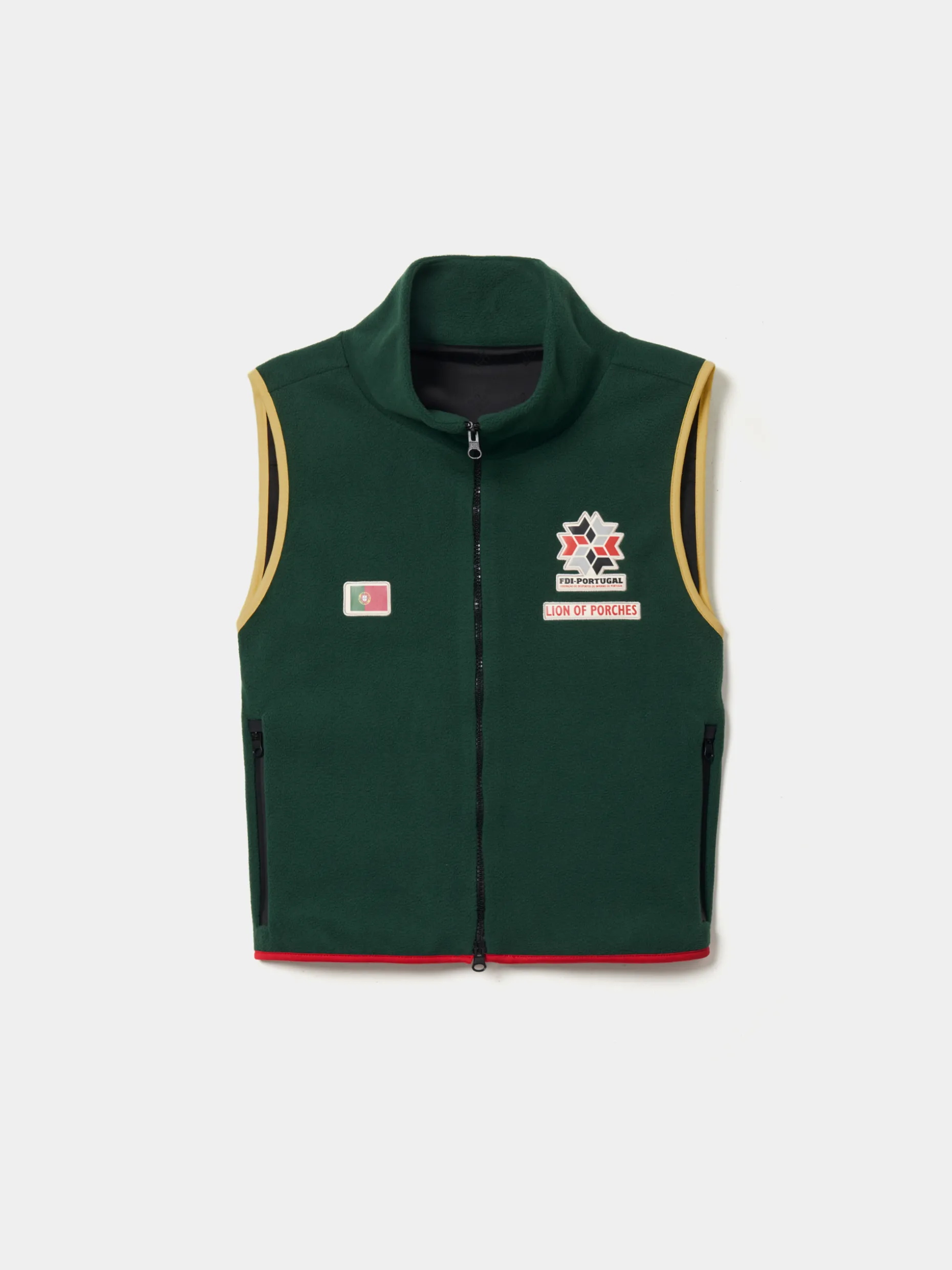 Colete confecionado em tecido polar macio que proporciona uma camada extra sem comprometer a liberdade de movimentos, tornando-o ideal para atividades ao ar livre em climas frios ou para dias descontraídos na cidade. O design inclui um fecho duplo de correr, assim como bolsos laterais com fecho. Destaque também para o emblema da FDI-Portugal e da Lion of Porches no peito, e ainda da bandeira portuguesa. Os acabamentos em amarelo nas cavas e o detalhe em vermelho na bainha inferior adicionam um contraste de cor ao design, remetendo para as cores da bandeira nacional.
