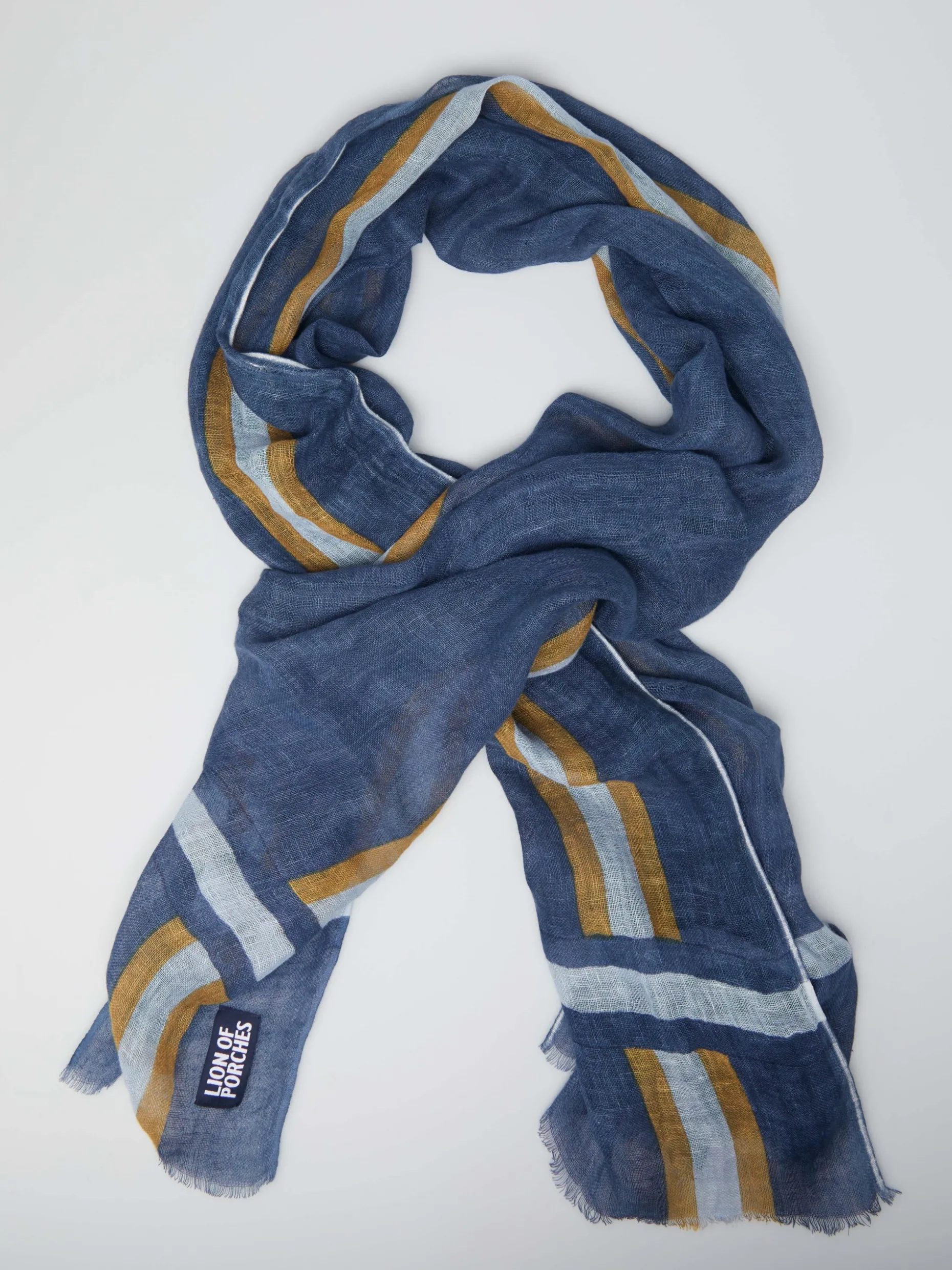 Echarpe clássica de linho com detalhe de linhas cruzadas nas laterias. Etiqueta Lion of Porches costurada numa das extremidades. Medidas: 180cm X 70cm