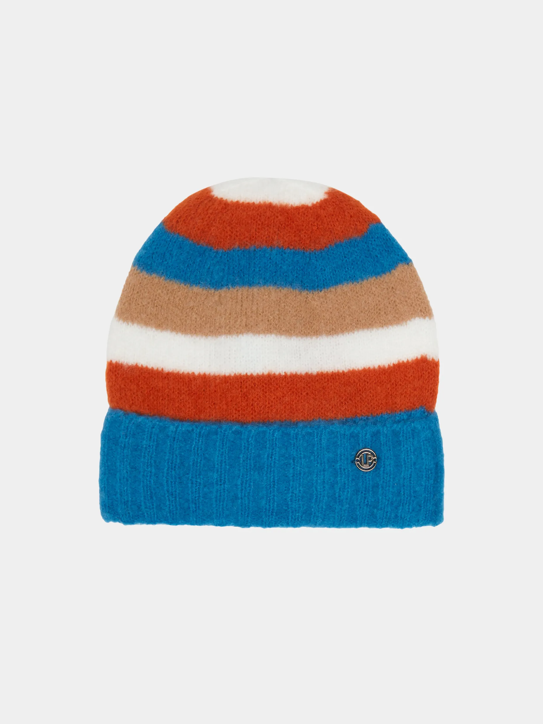 Gorro confecionado em malha estruturada com riscas.