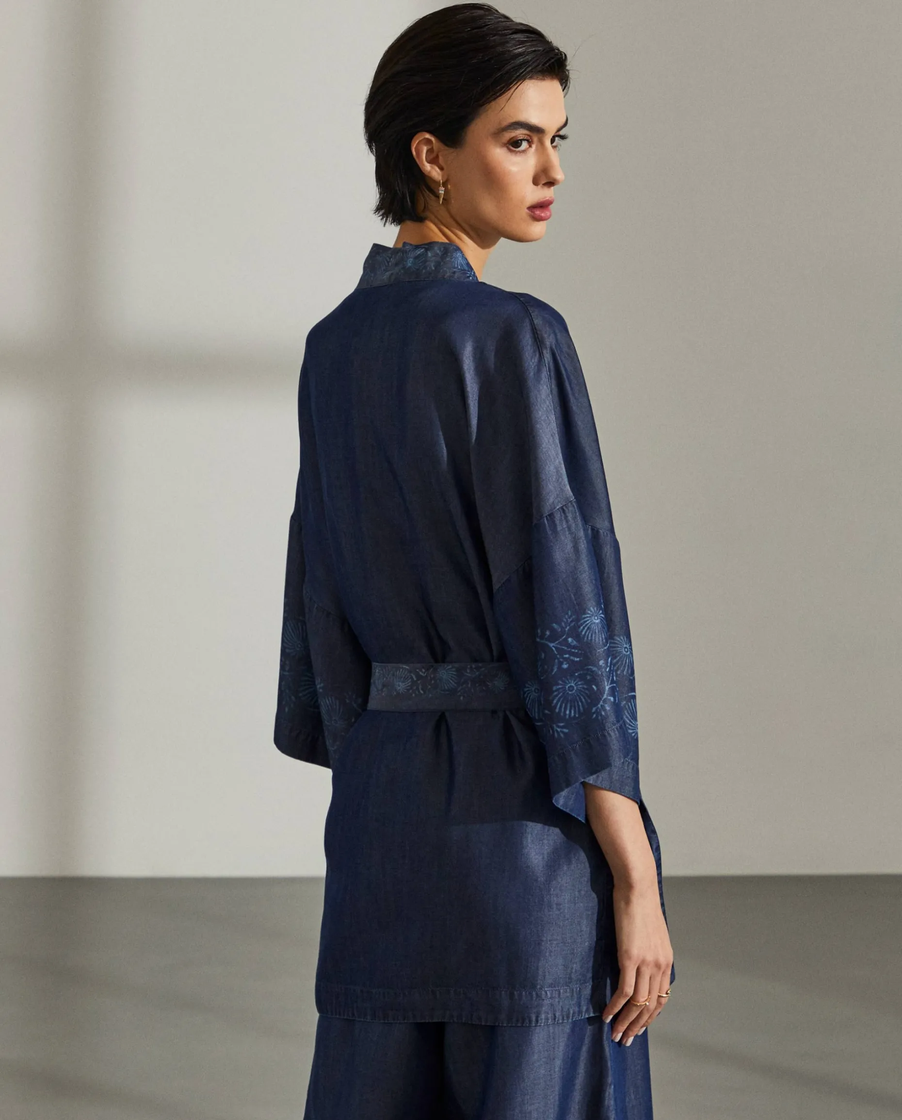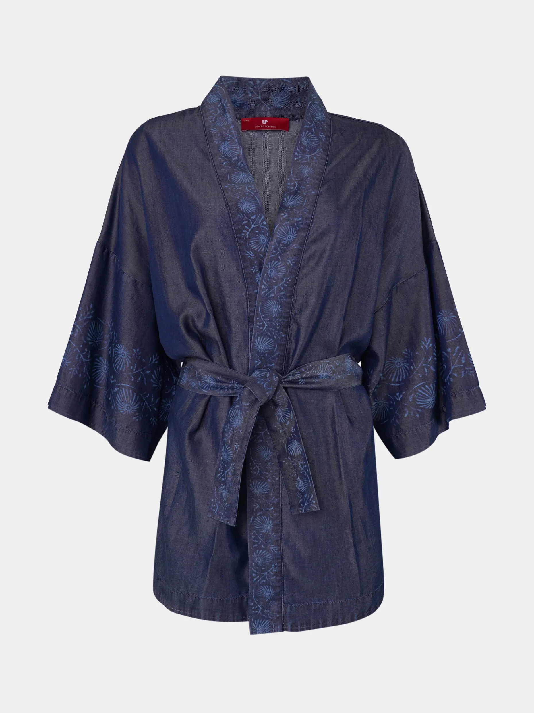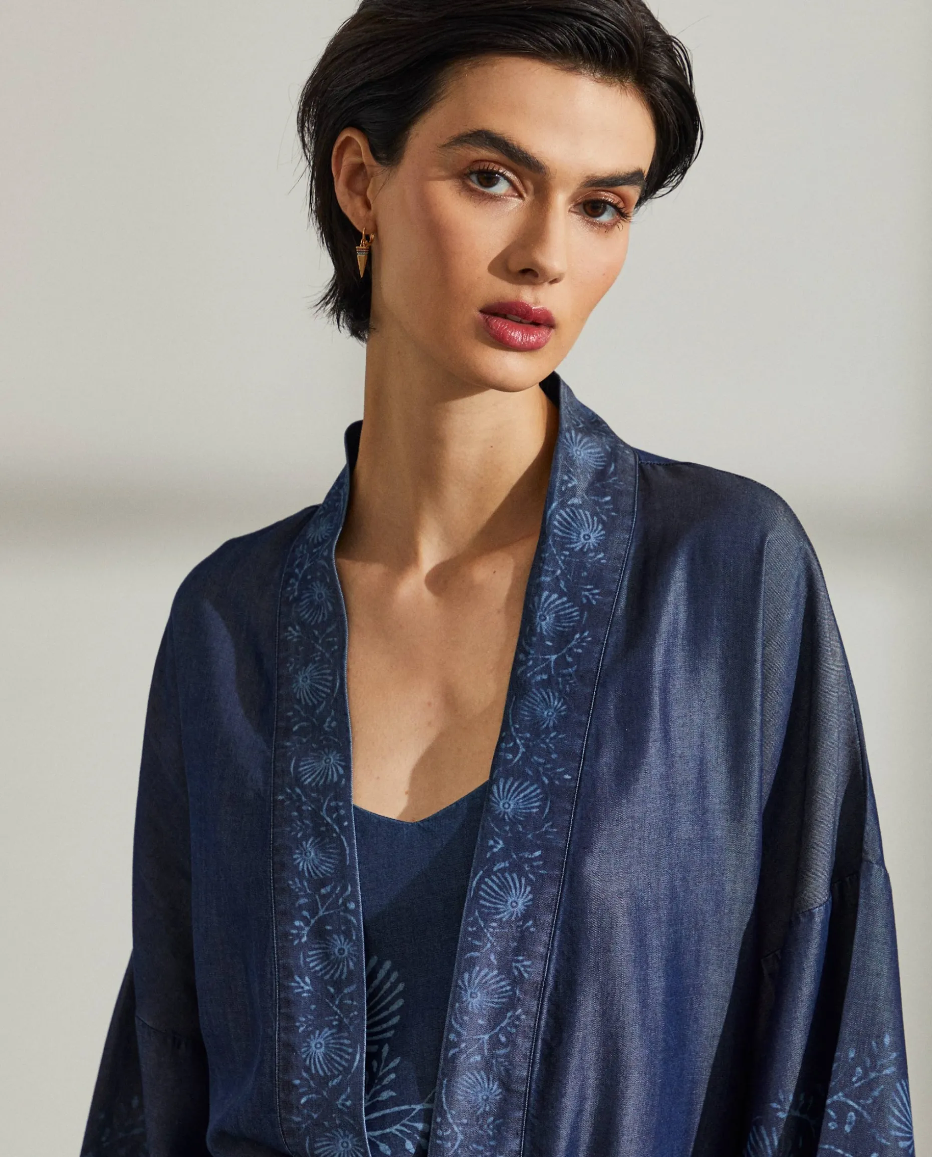 Quimono comprido confecionado em 100% lyocell estampado a laser. Aperta com cinto estampado. Aberturas laterais.