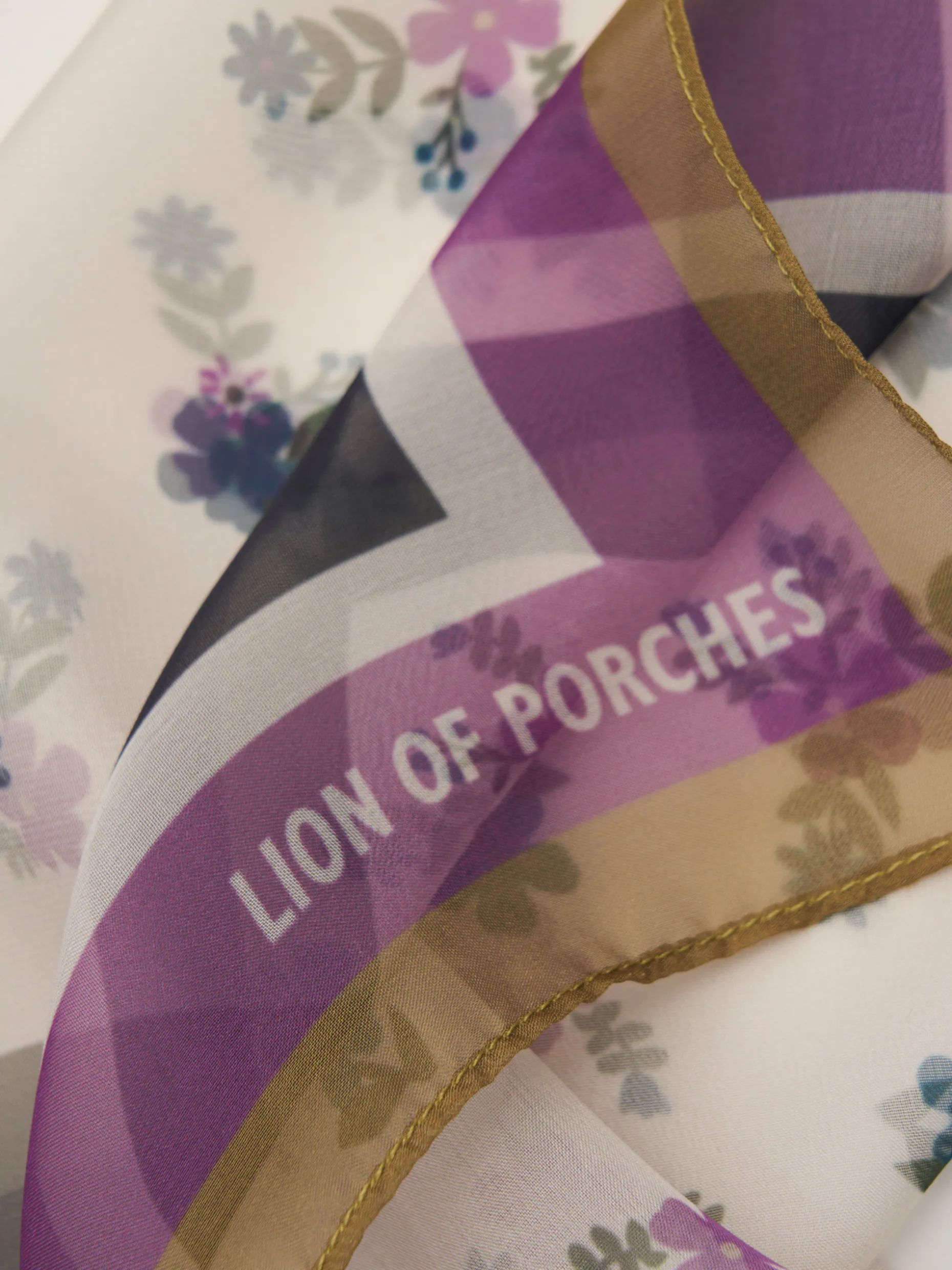 Lenço colorido, semitransparente, de formato quadrado. Com padrão de flores no interior e riscas a toda a volta. Finaliza com logotipo Lion of Porches nas pontas em contraste de cor.