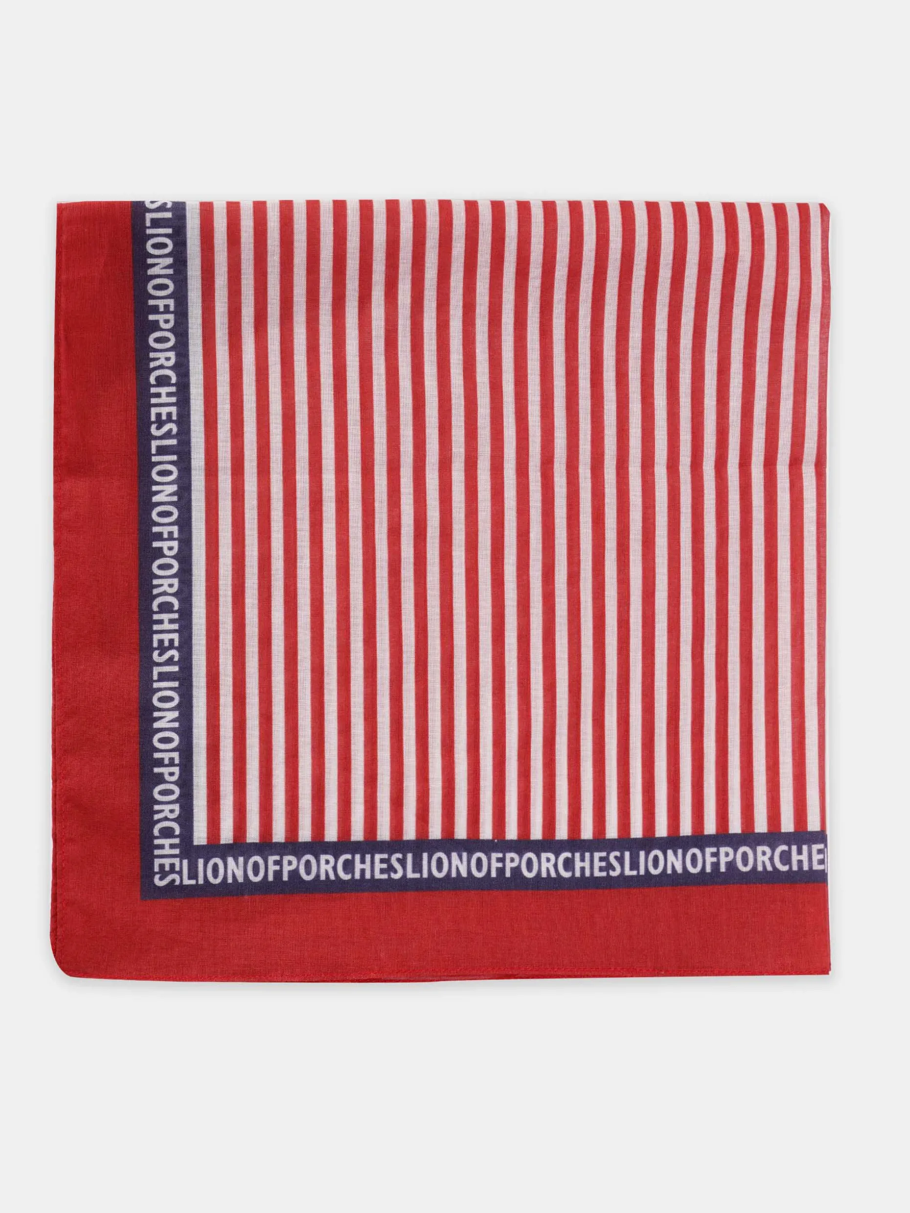 Lenço com estampado de riscas 100% algodão. Branding Lion of Porches e borda a cor contraste nas extremidades.