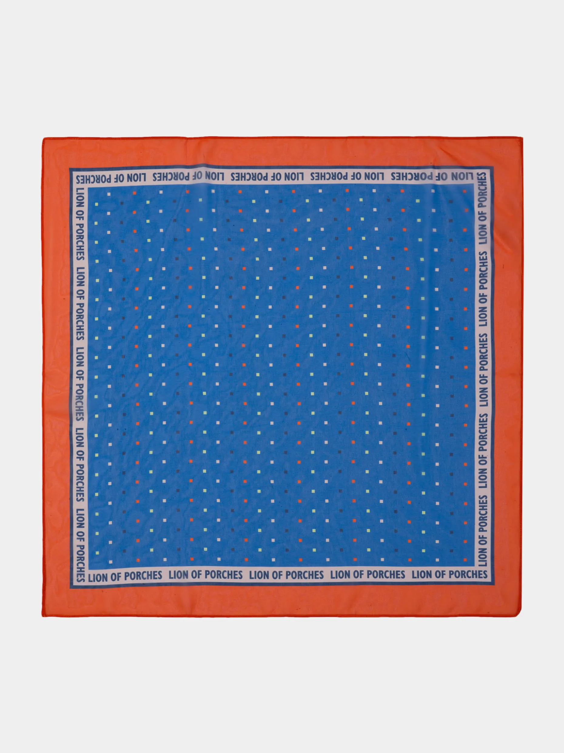 Lenço com estampado de quadrados. Detalhe de branding Lion of Porches e borda noutra cor a toda a volta das extremidades.