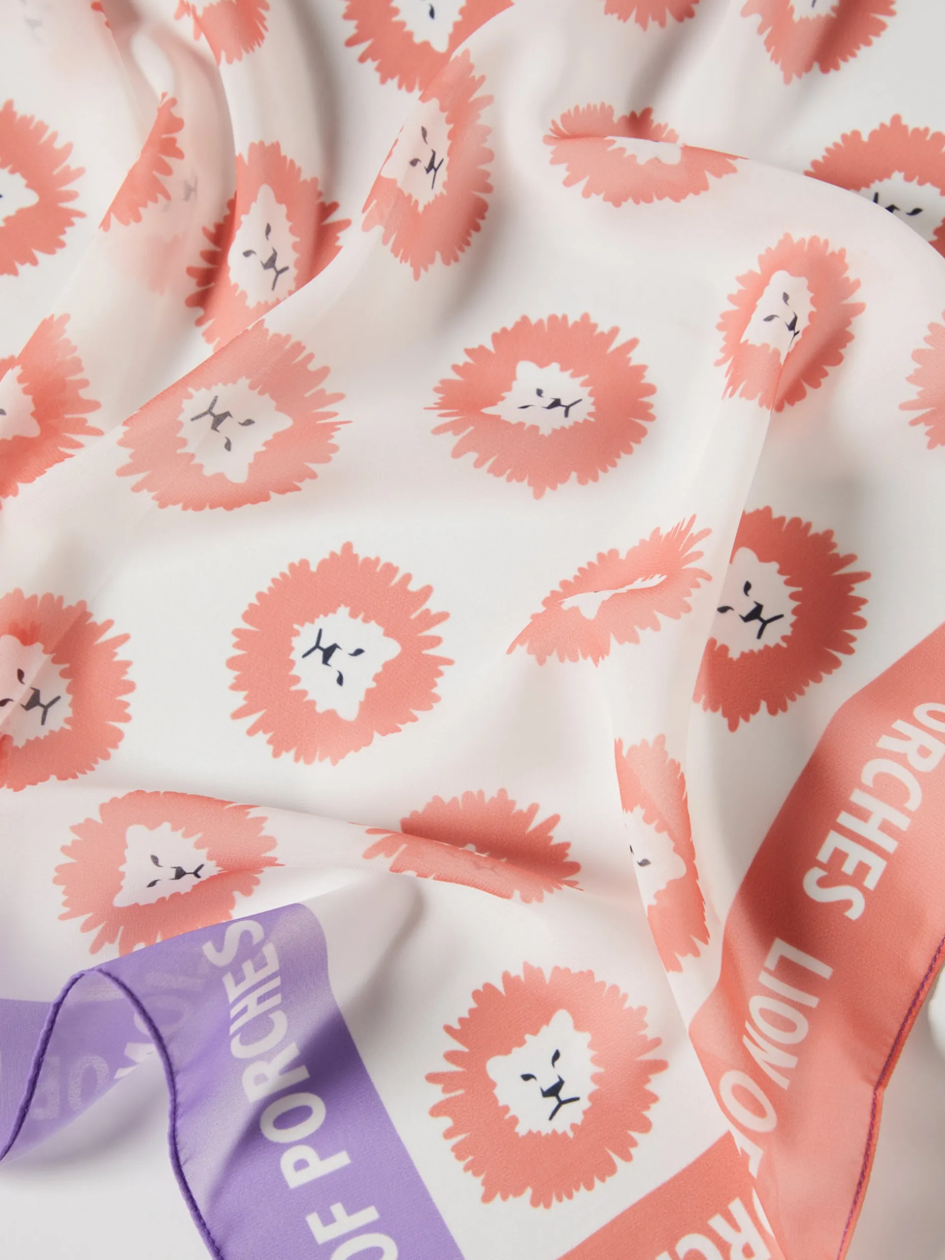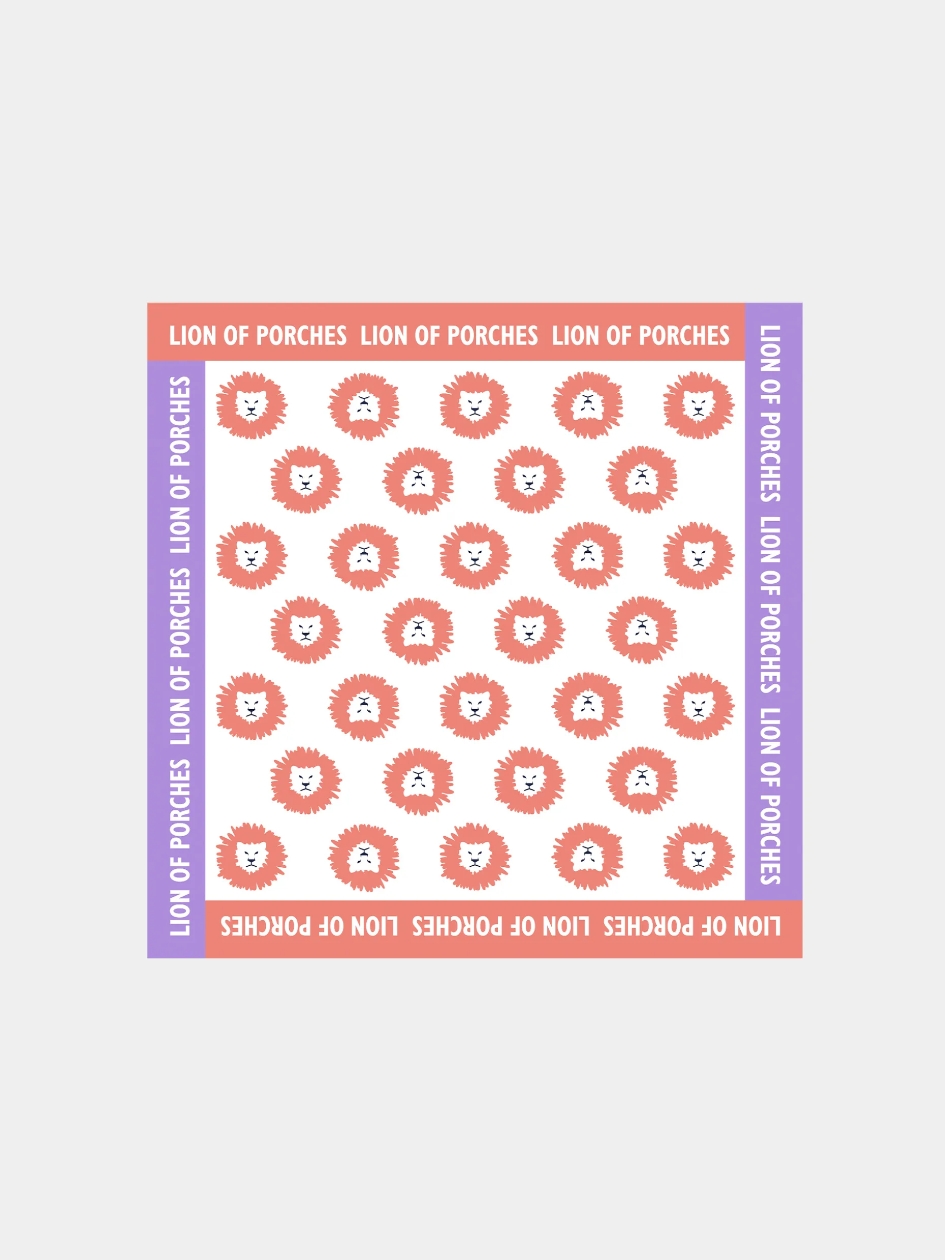 Lenço de formato quadrado com padrão de leões no centro. Finaliza com barras coloridas a toda a volta, com branding Lion of Porches em contraste de cor.