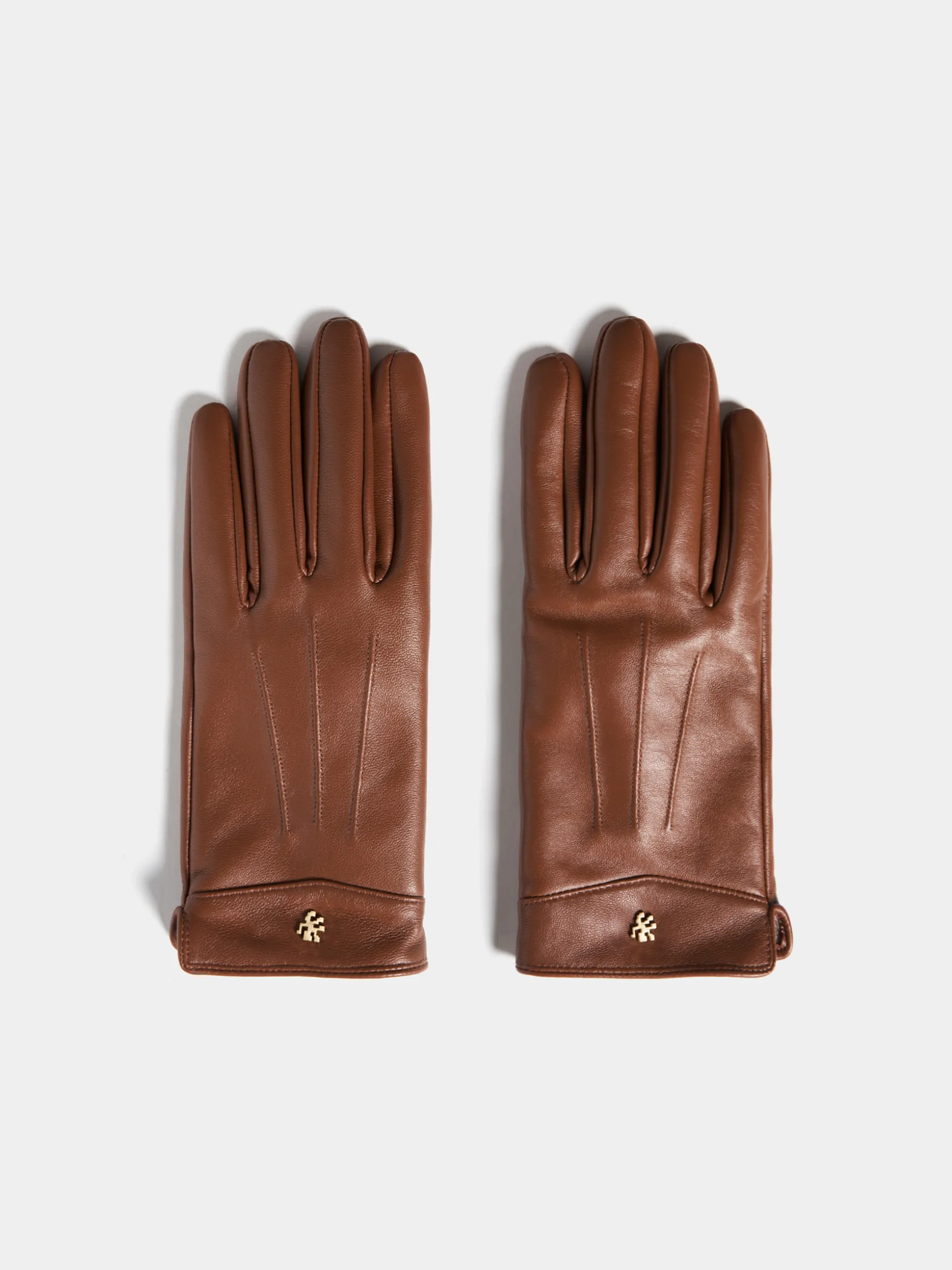 Elegantes e sofisticadas luvas em pele com forro interior em lã para maior isolamento térmico. De cor lisa, com aplicação metálica em dourado.