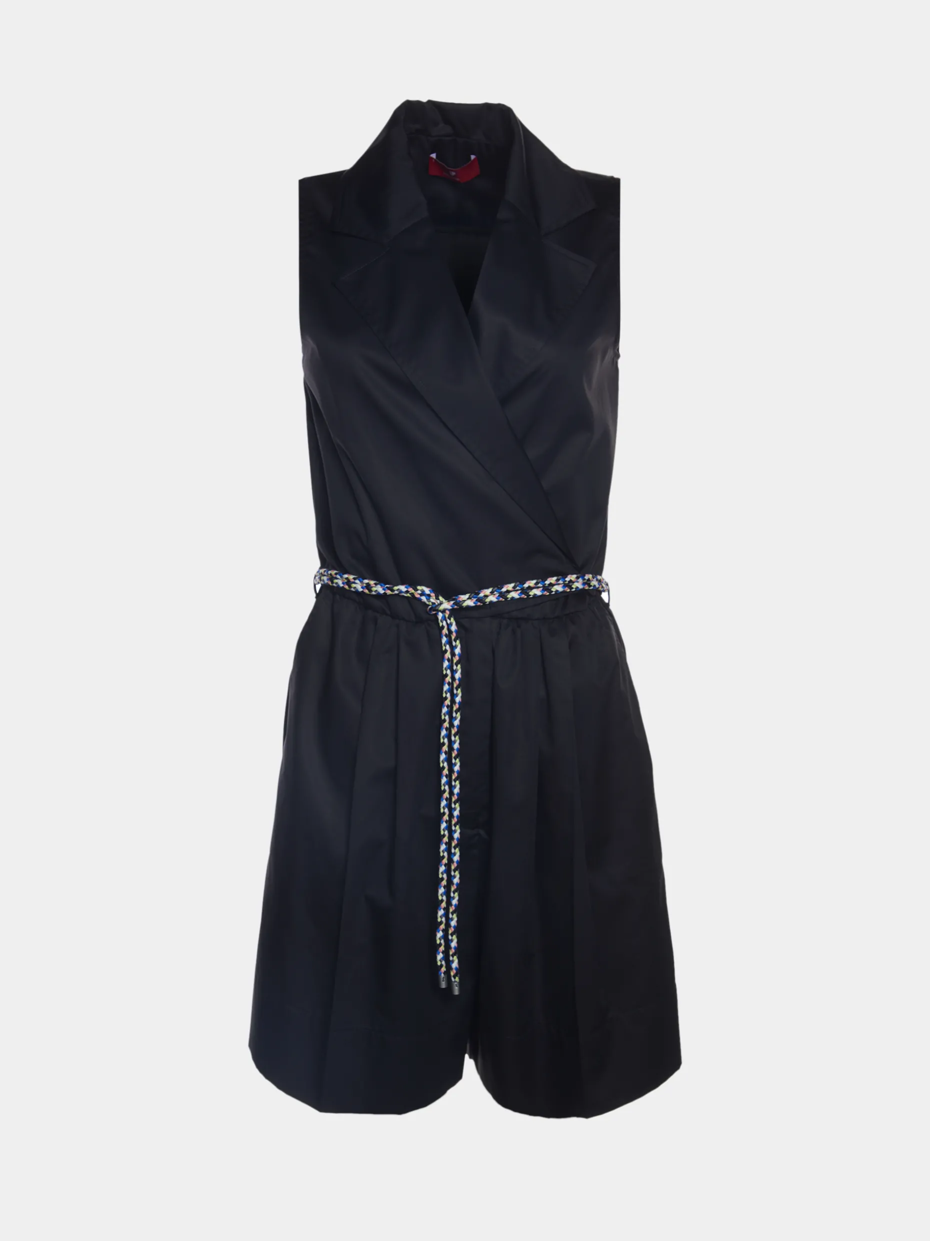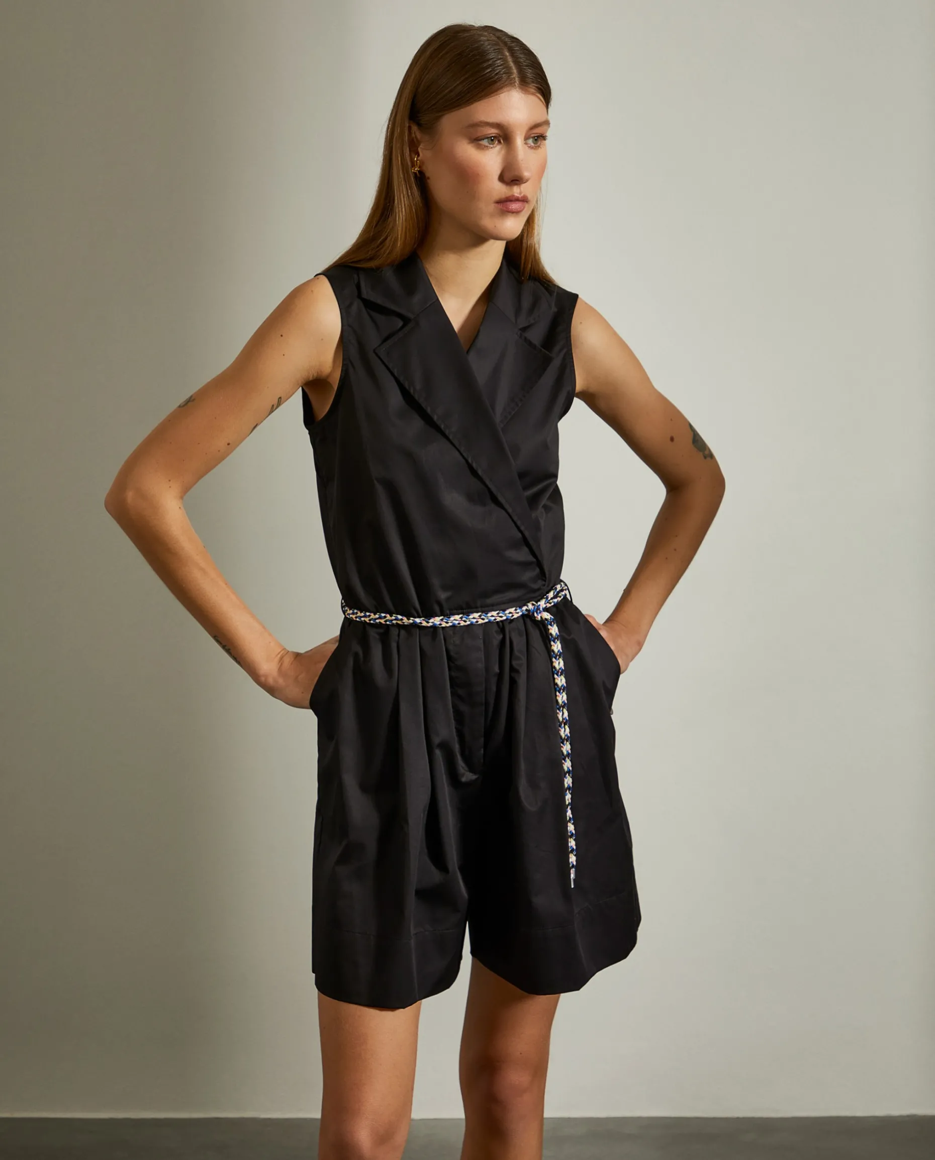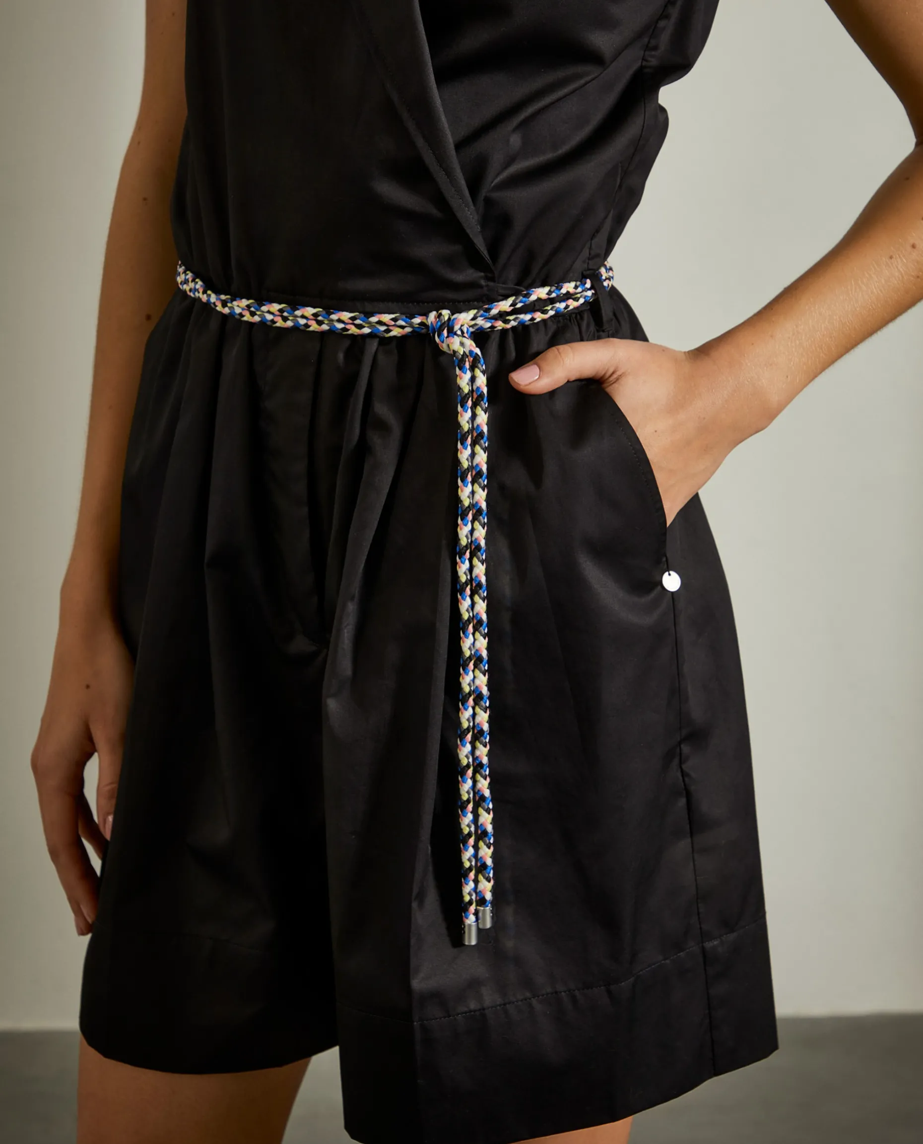 Macacão curto com trespasse e cordão colorido como cinto. Perna dos calções com vinco.