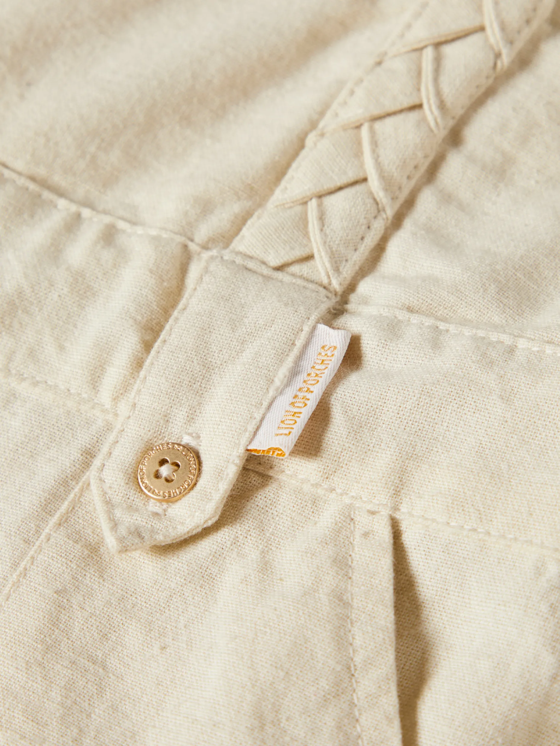 Um look leve e confortável para as miúdas, este macacão tem alças finas entrançadas e perna larga. Com bolsos laterais e presilhas no cinto com botões. A parte detrás tem elástico nas costas e cintura. É confecionado com uma mistura de algodão e linho tornando-o a escolha perfeita para as estações mais quentes.