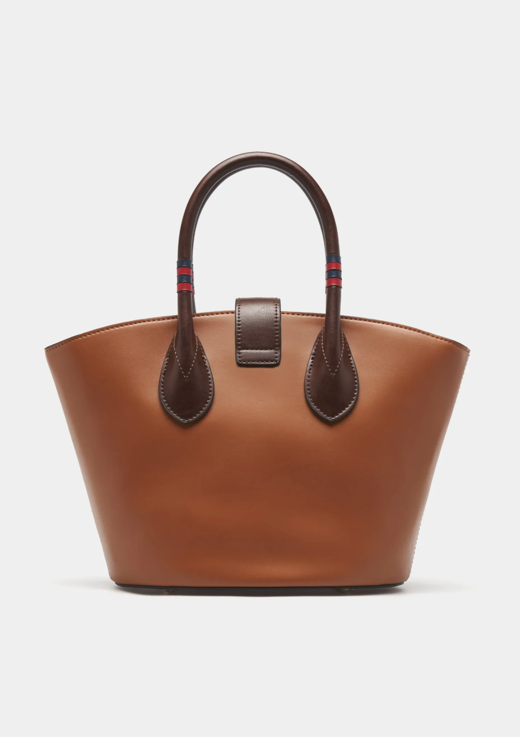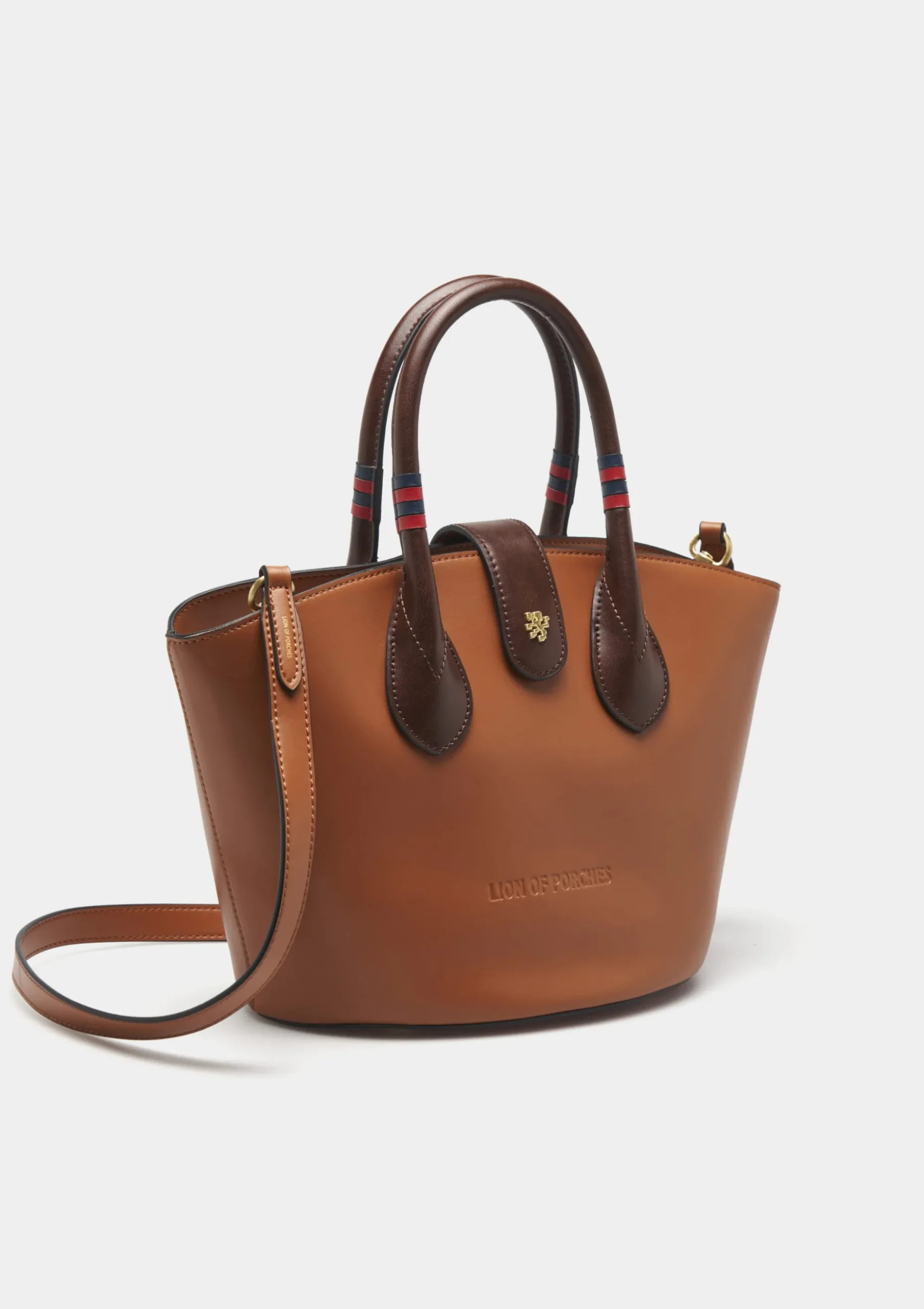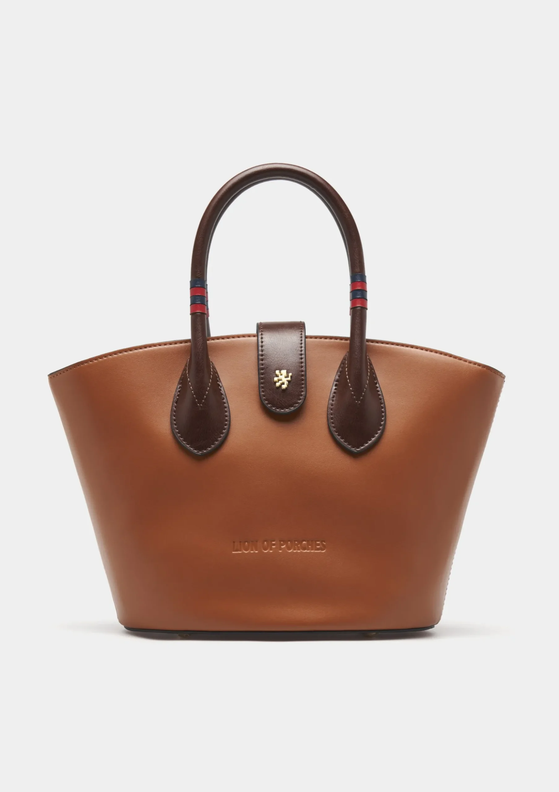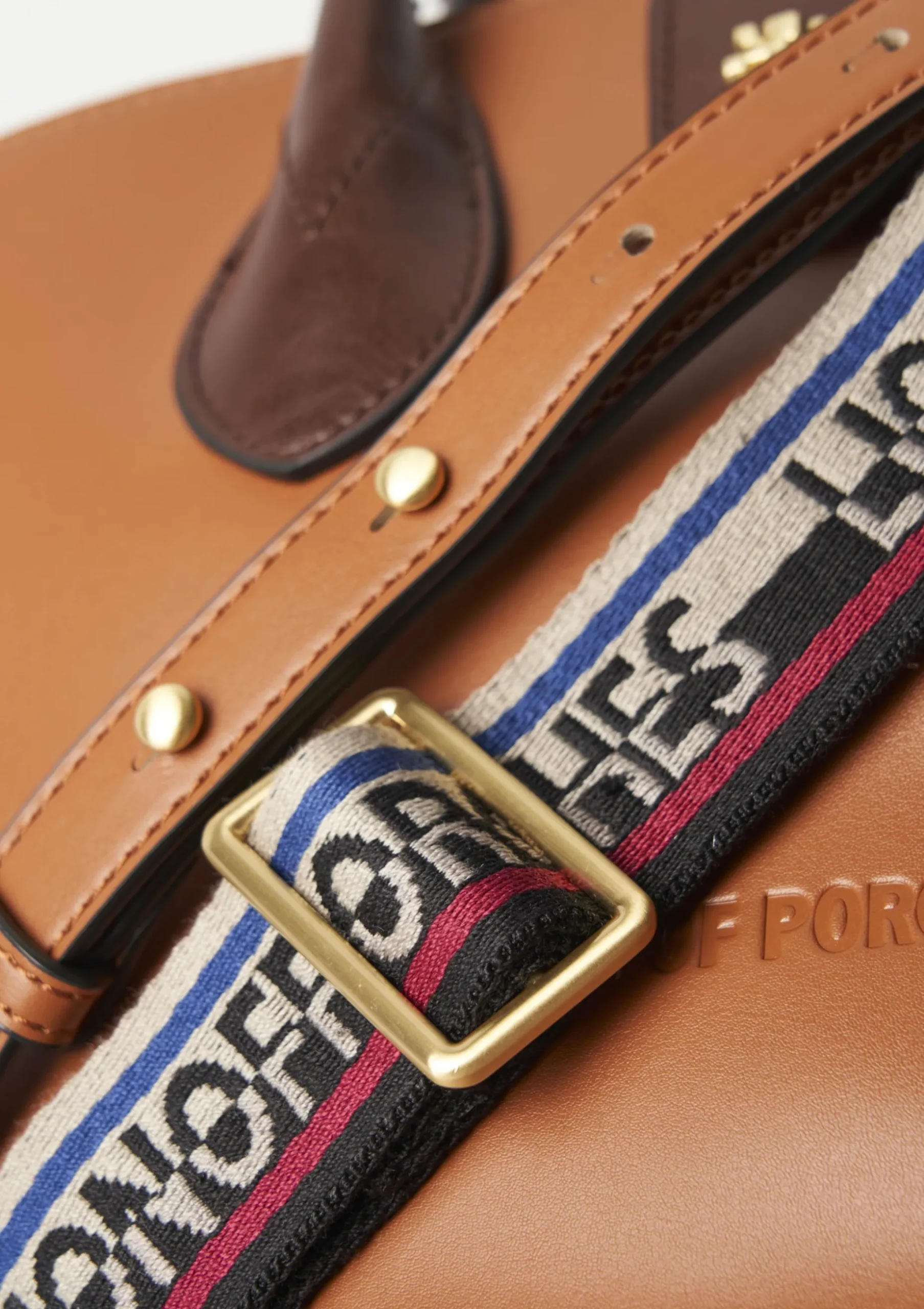 A mala que a vai acompanhar em todos os momentos é esta bucket, de cor camel, efeito pele. Tem alça dupla de mão, e mais duas longas a tiracolo ajustáveis e removíveis (uma ao tom, e outra em jacquard). Com aperto superior através de fecho magnético e zíper. Finaliza com logotipo da marca gravado na frente.