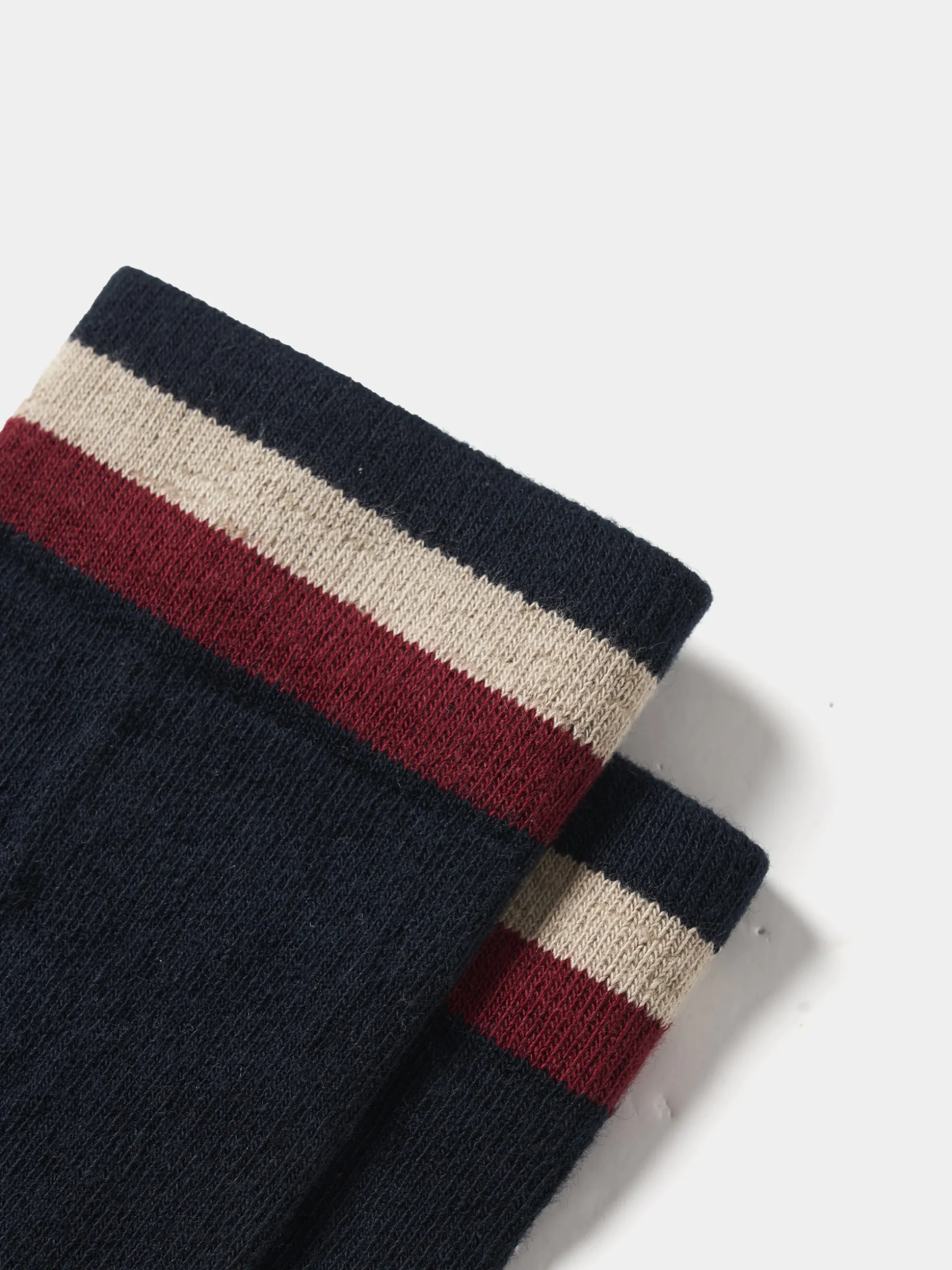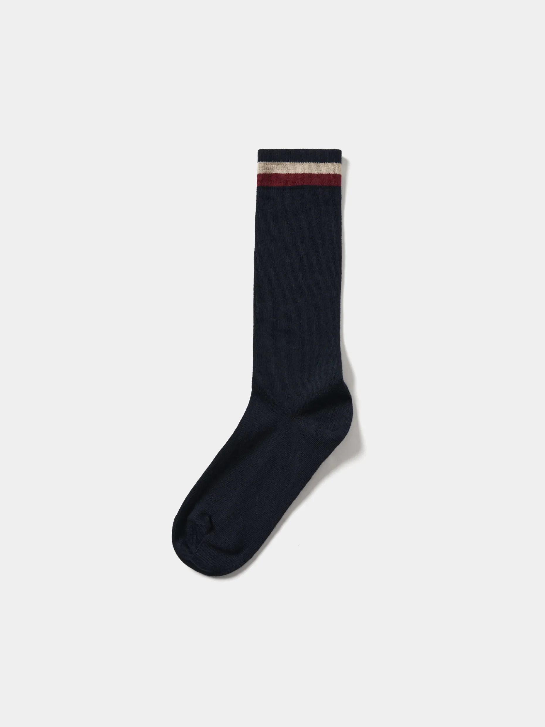 Meias até ao joelho, de cor lisa, com 3 riscas em contraste na ponta.