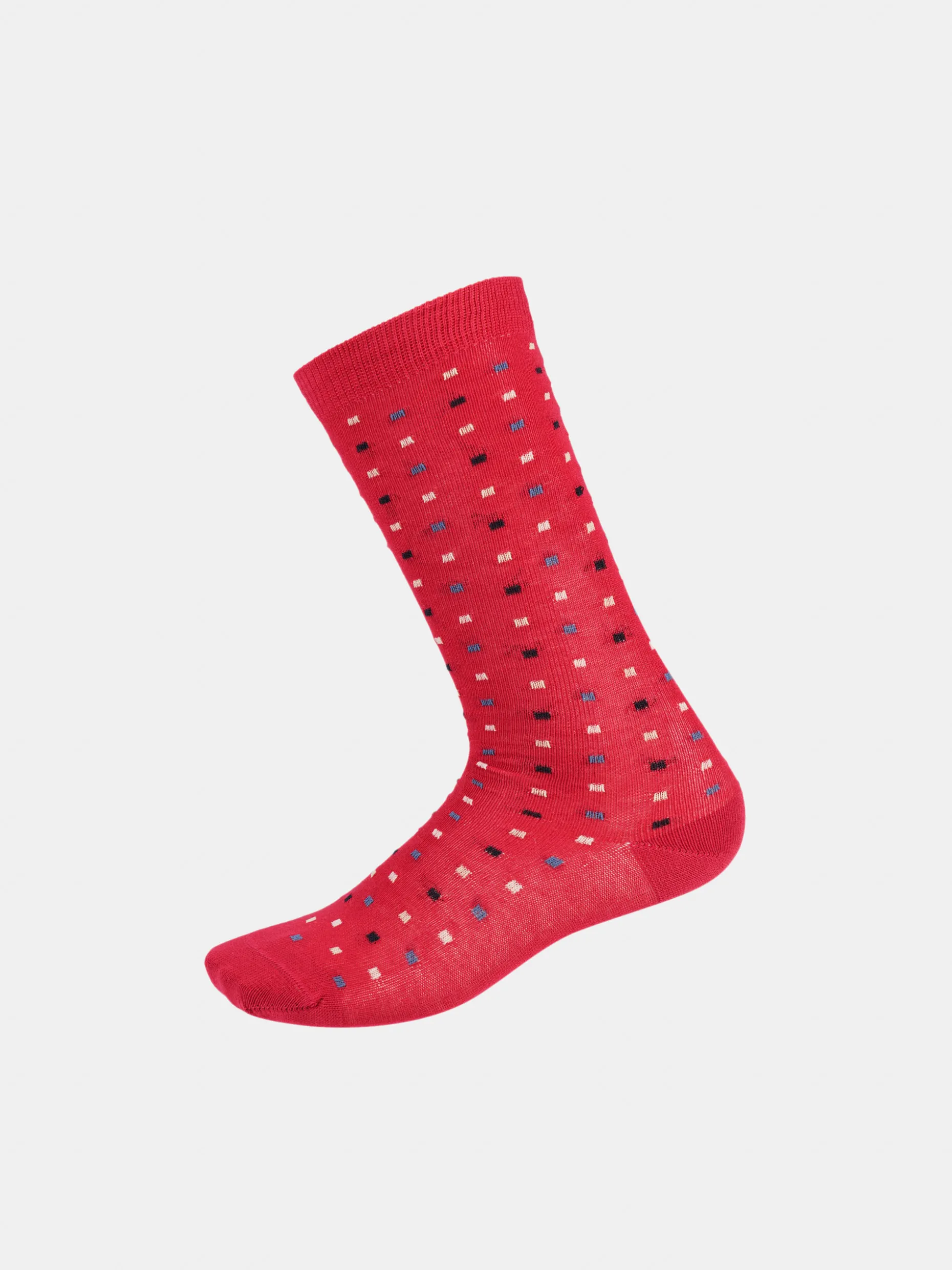 Meias confecionadas em algodão stretch com micromotivos quadrados.