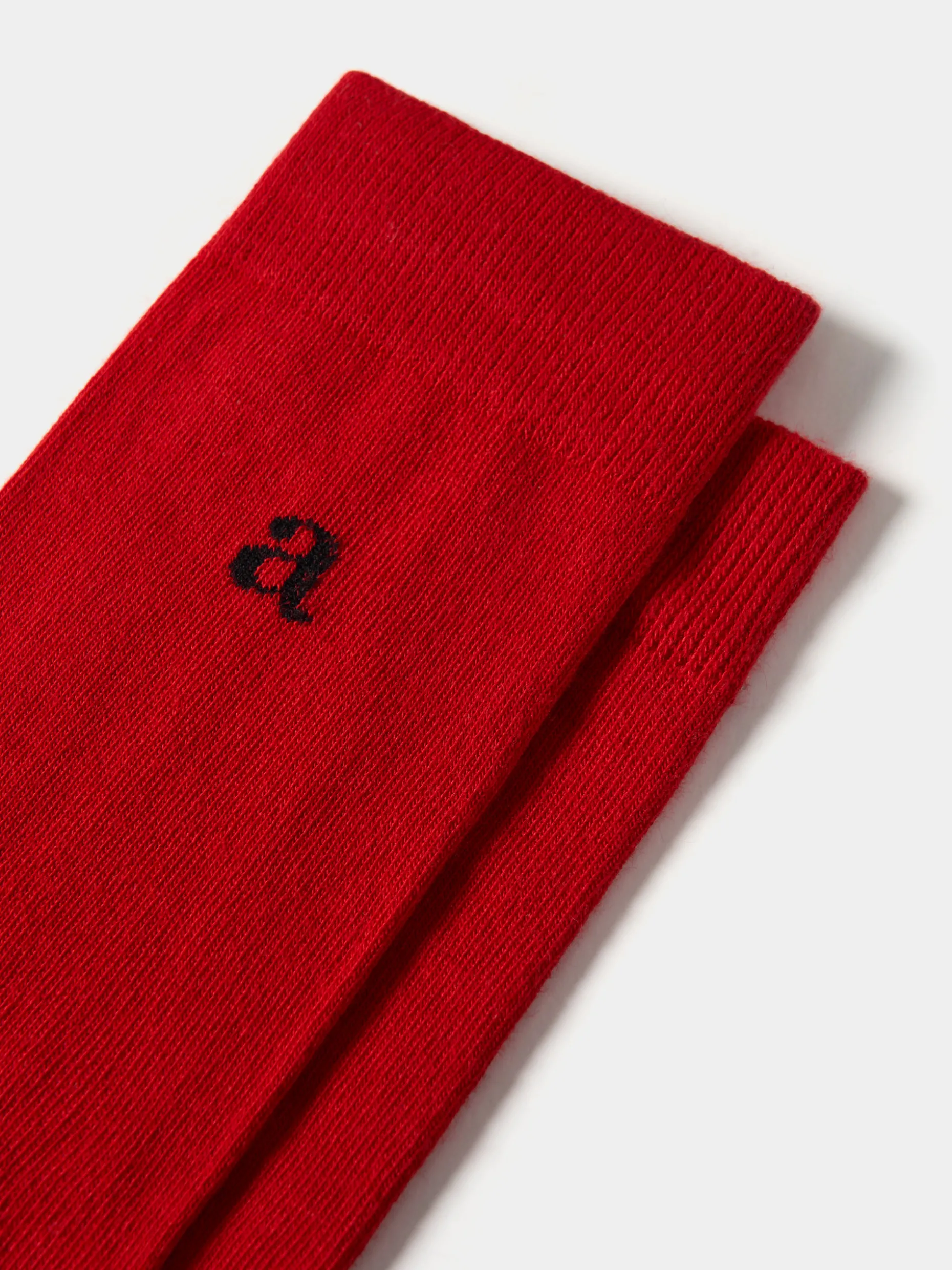 Meias vermelhas altas, de cor lisa, com logotipos em contraste de cor. Uma peça Lion of Porches x Paatiff, produzida em Portugal e desenhada com recurso a ferramentas de inteligência artificial.