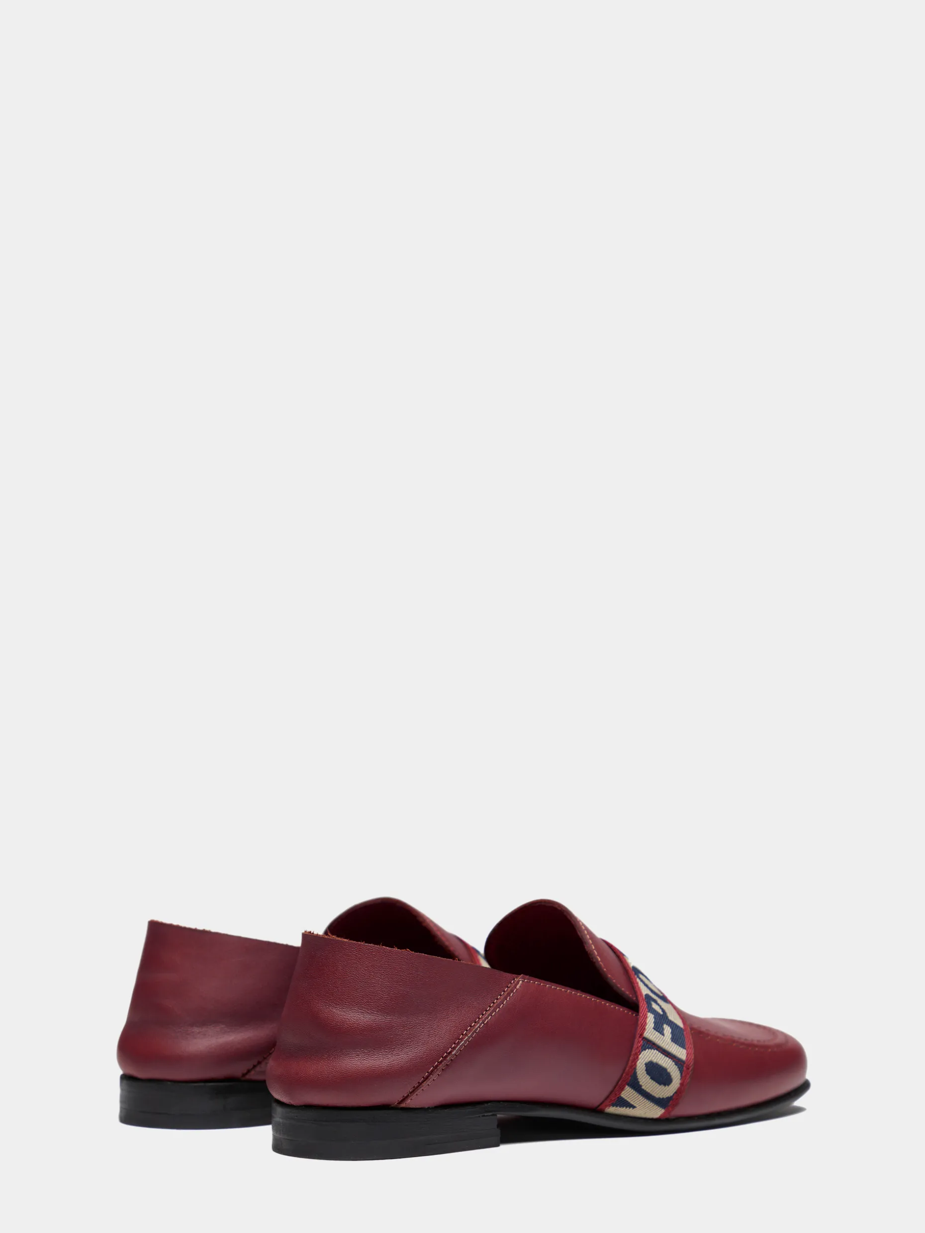 Mocassim em pele que se transforma em mule para usar conforme a ocasião. Com fita corporativa personalizada na frente a acompanhar a curvatura do pé.