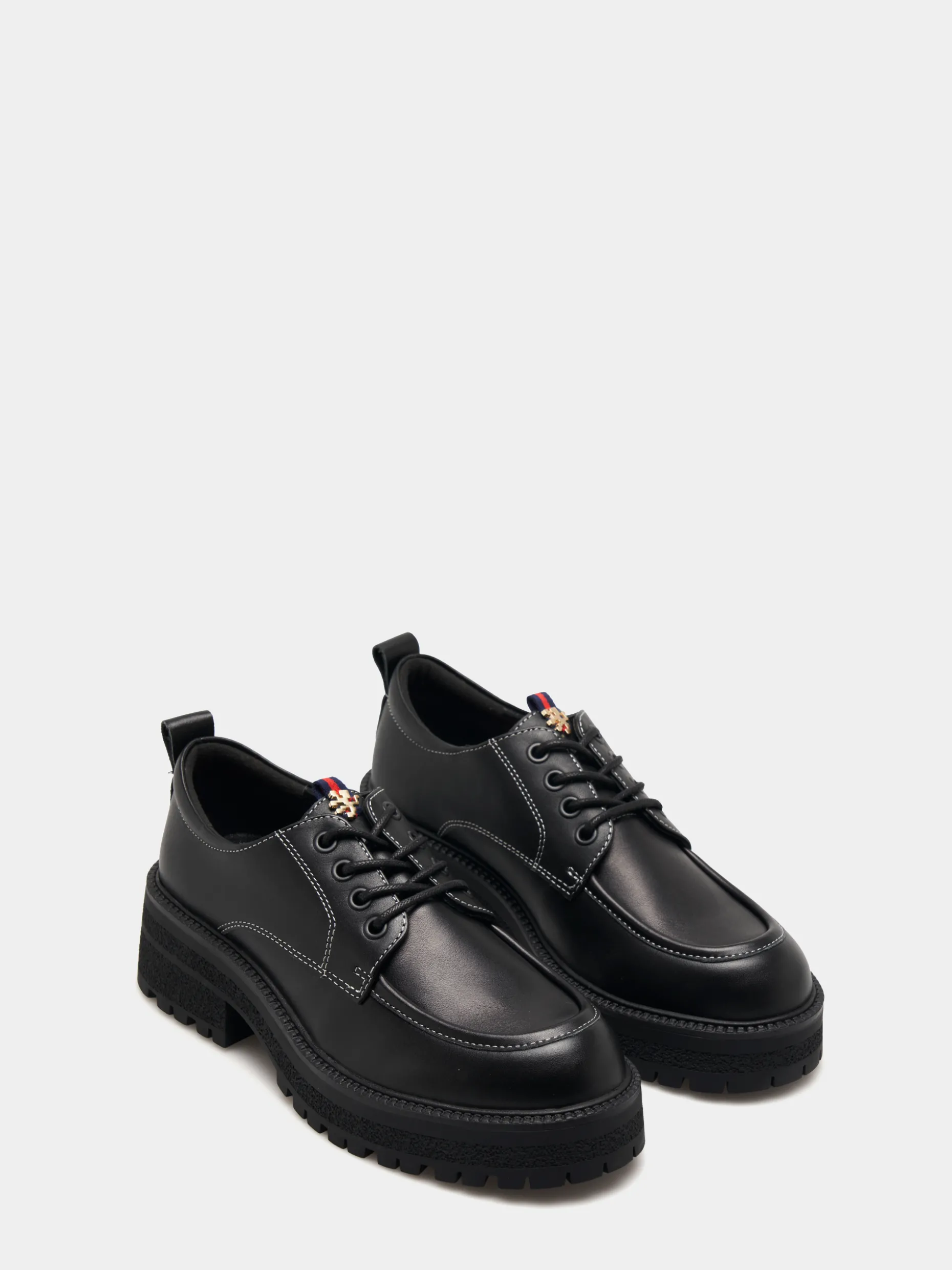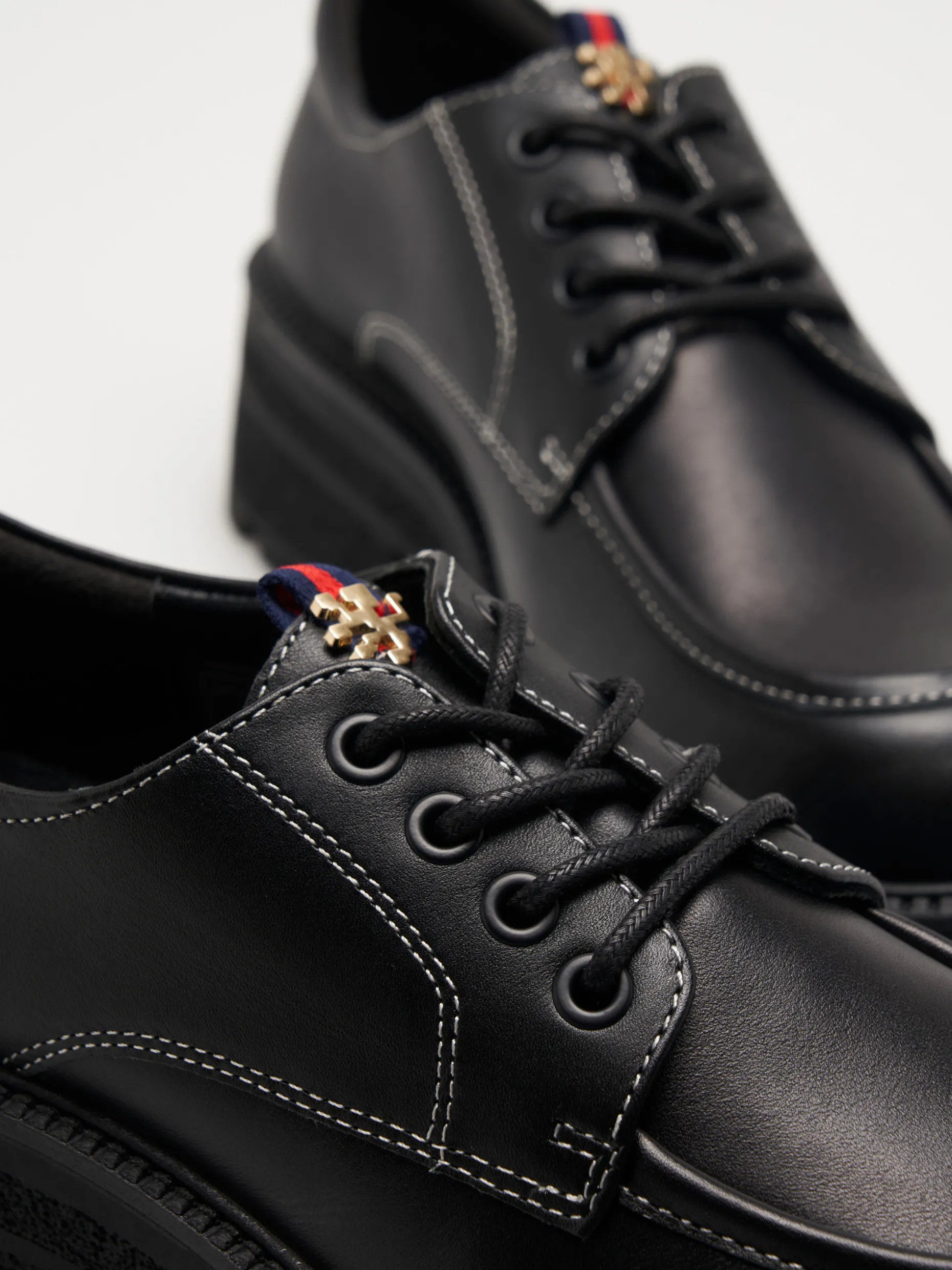 Uma tendência bastante versátil para os outfits de dia-a-dia são estes mocassins chunky em pele. Apertam com cordões e as costuras são em contraste de cor. Finalizam com leão da marca e fita na língua. Altura do tacão: 5cm