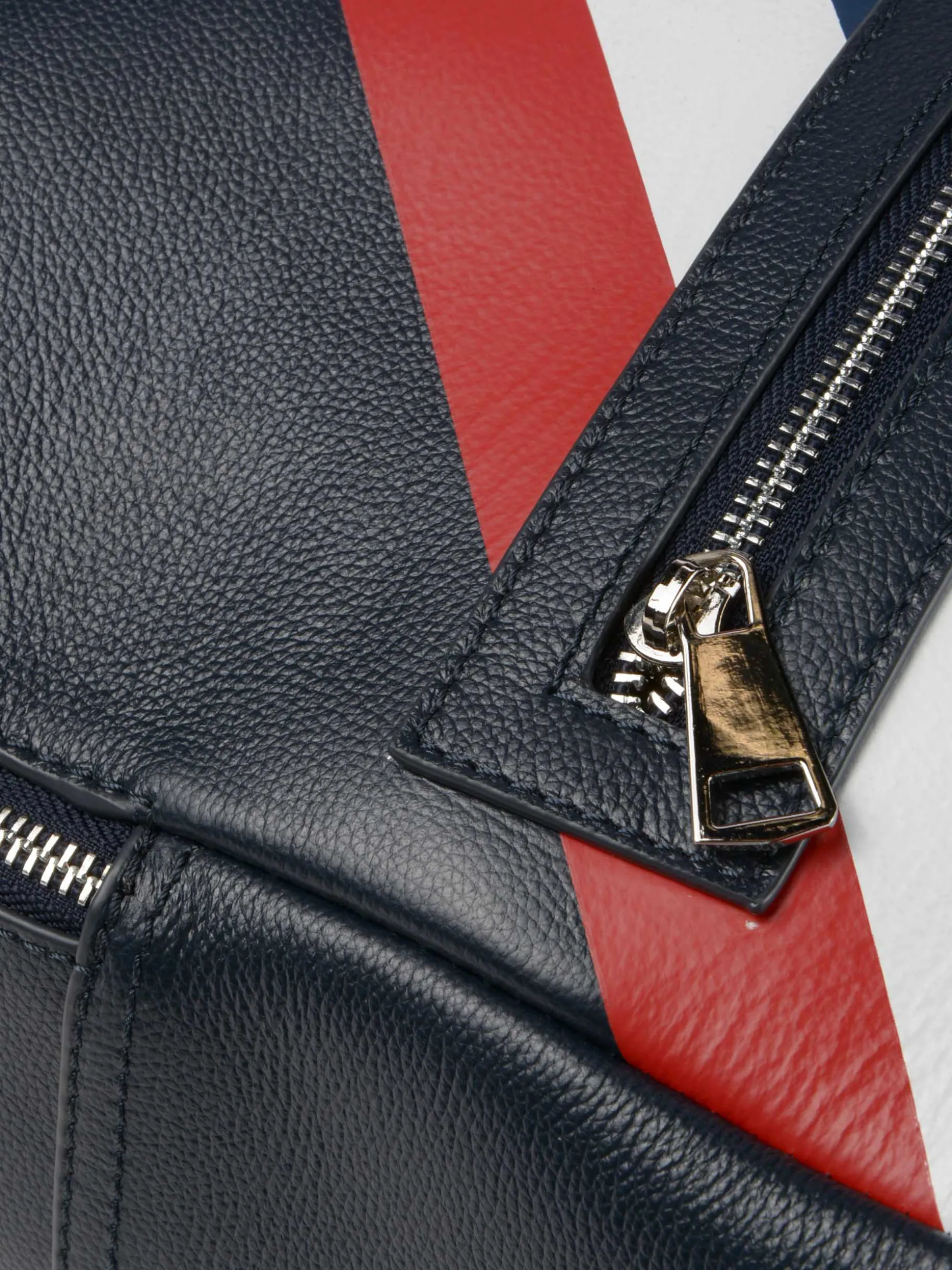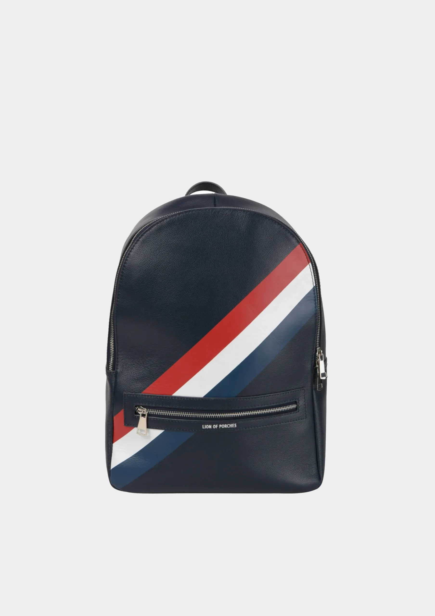 Mochila em pele navy com fita tricolor corporativa estampada. Fecha com zip. Alças ajustáveis em pele. Bolso frontal. Personalizado com gravação a prata «Lion of Porches». Dim. 38 X 30 X 14 cm.