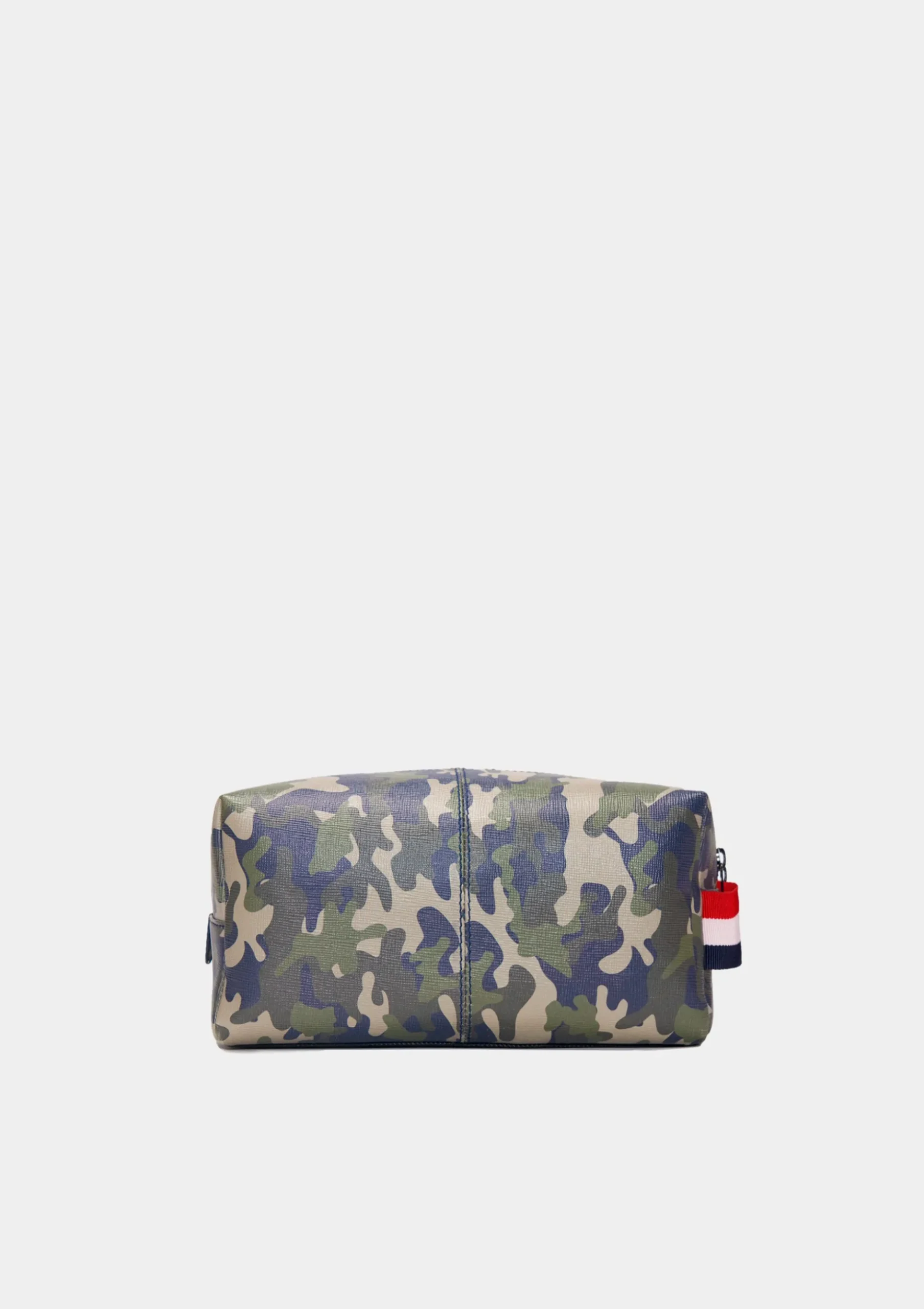 Necessaire com padrão. Em pele. Estampado personalizado na lateral. Fecho superior. Alça tricolor.