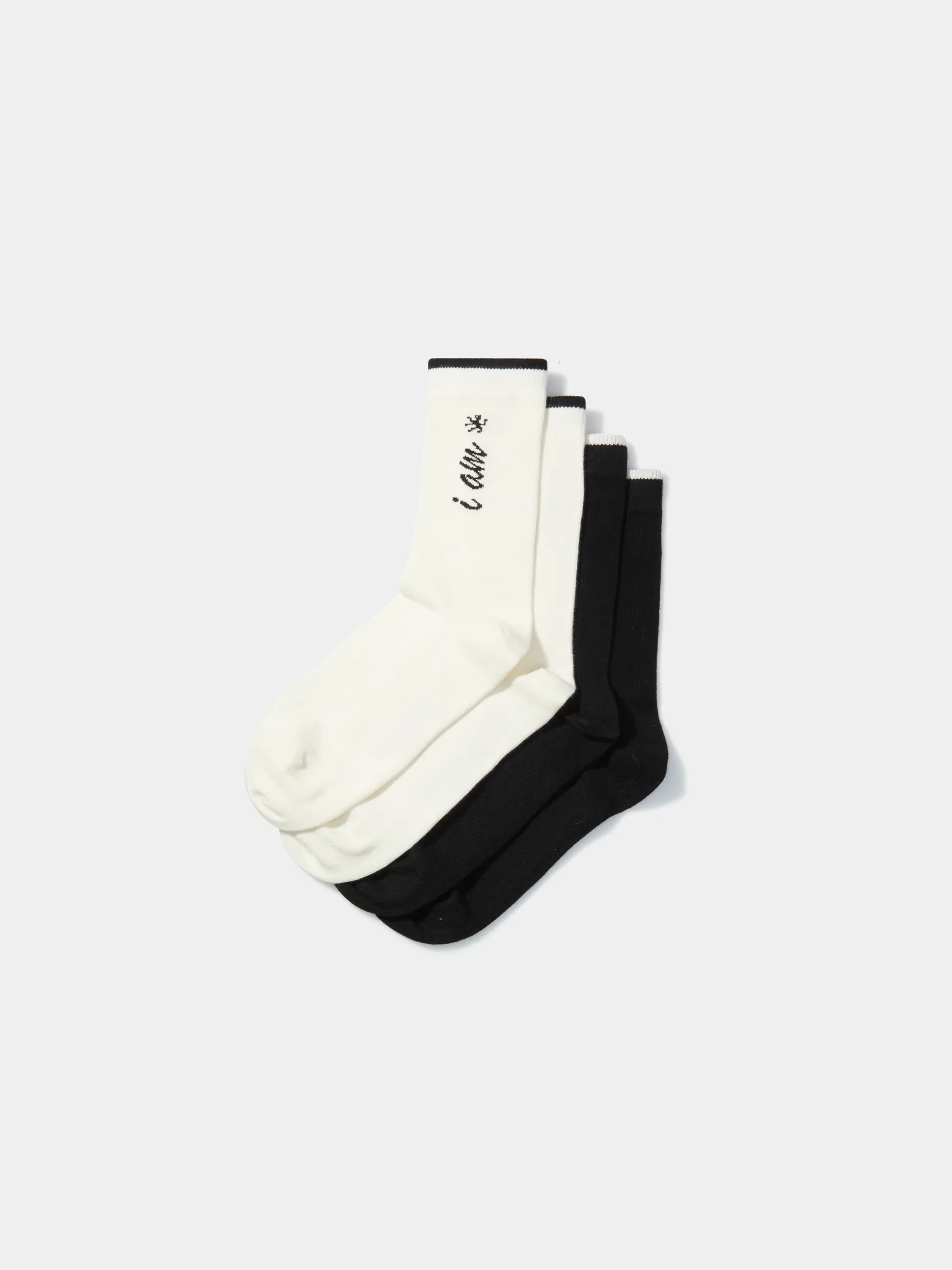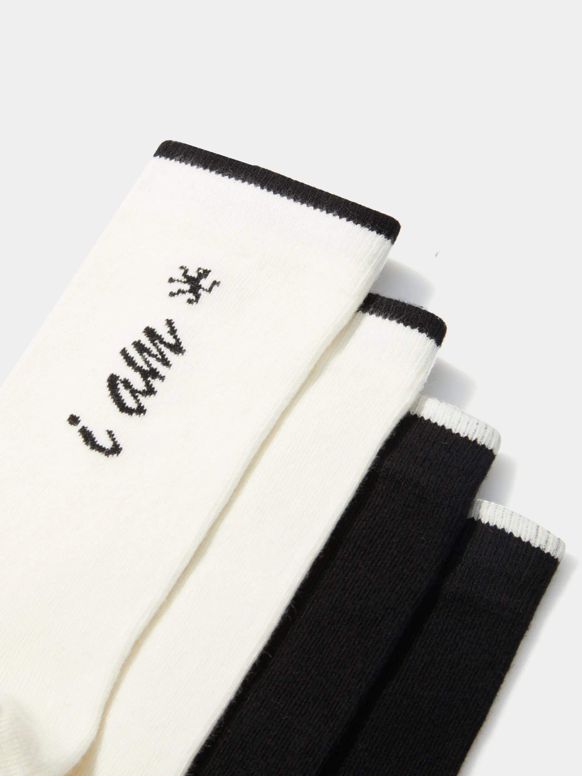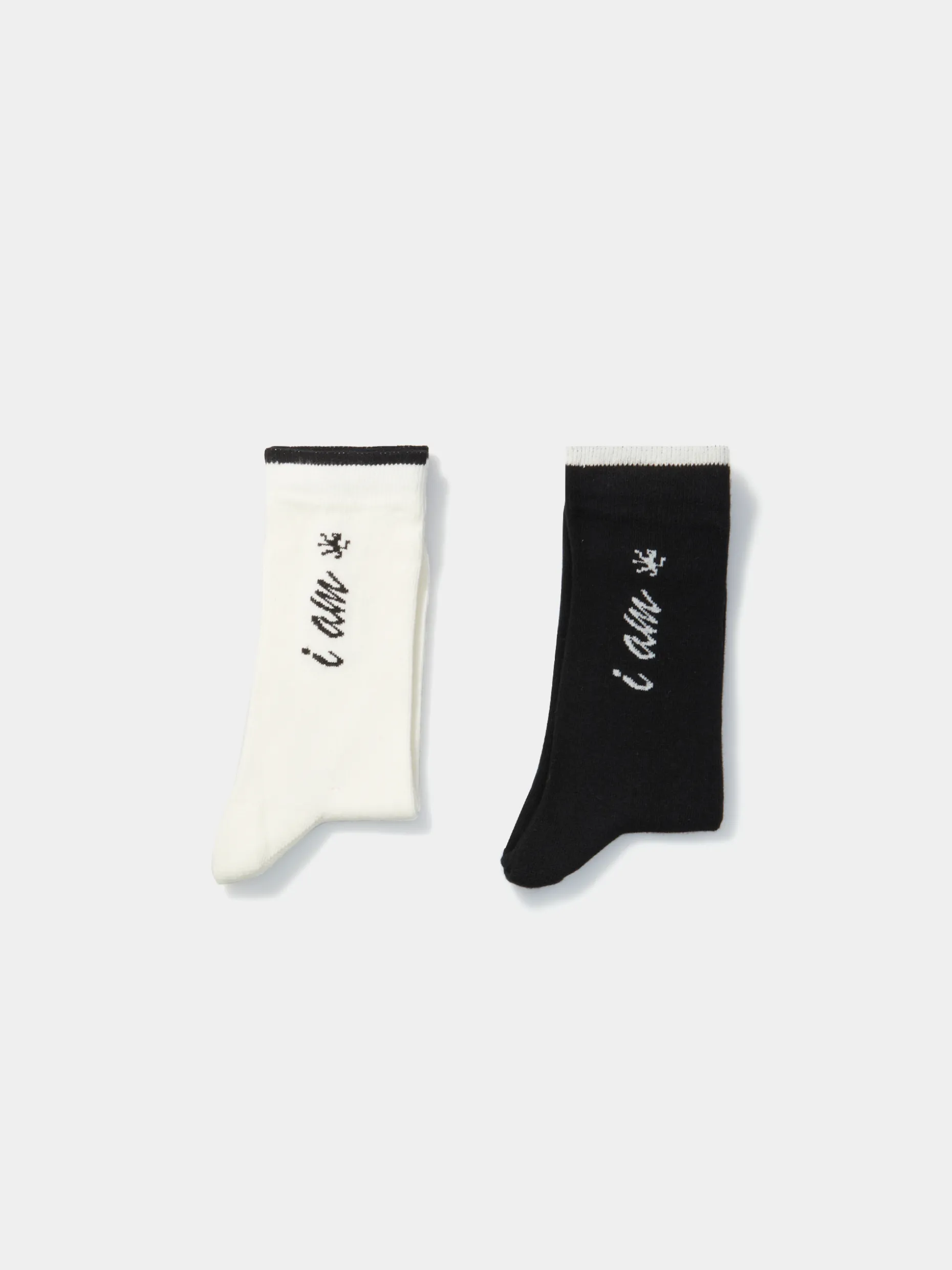 Pack de 2 meias lisas com risca no topo em contraste e estampado personalizado em contraste a meio.