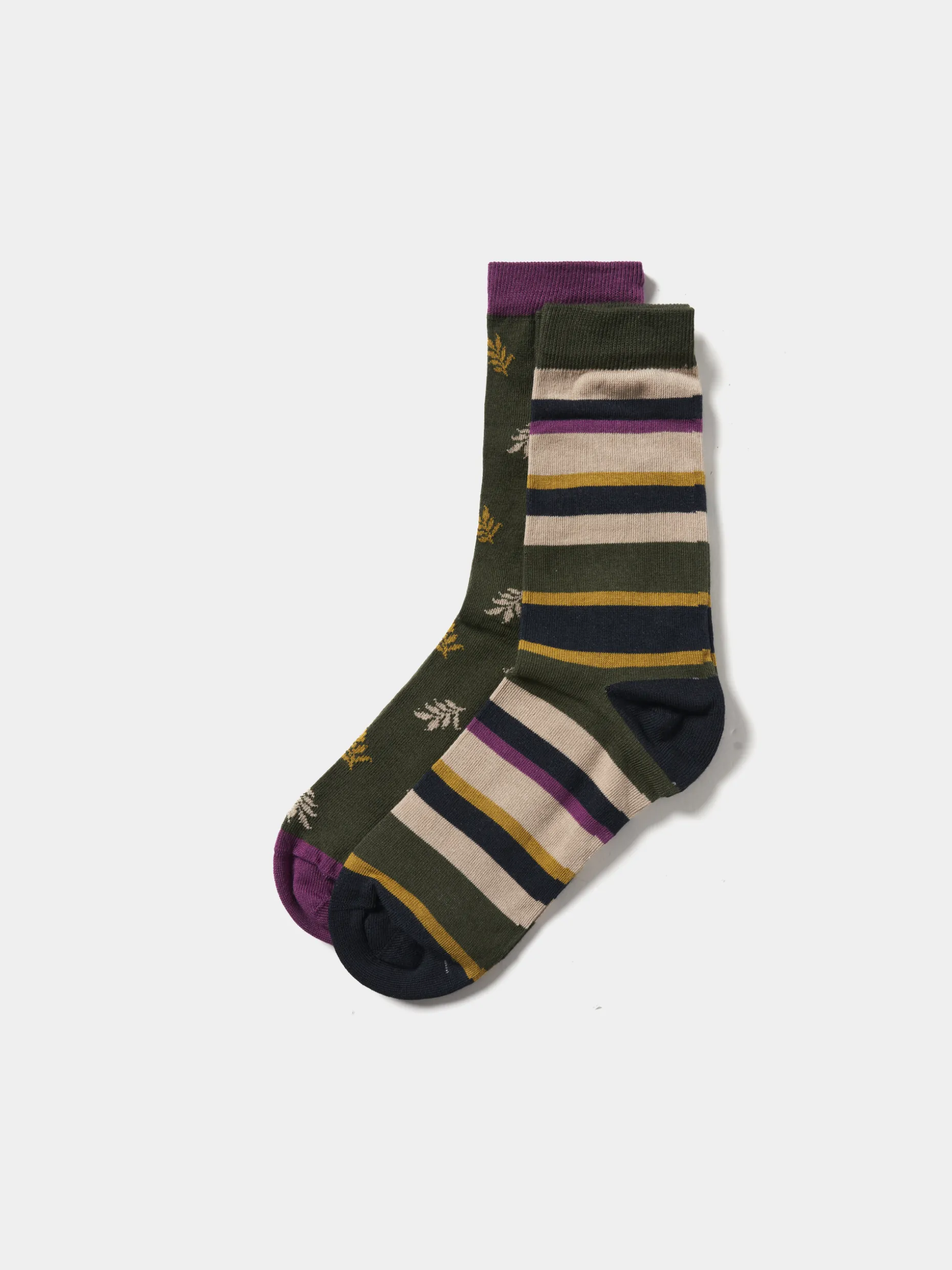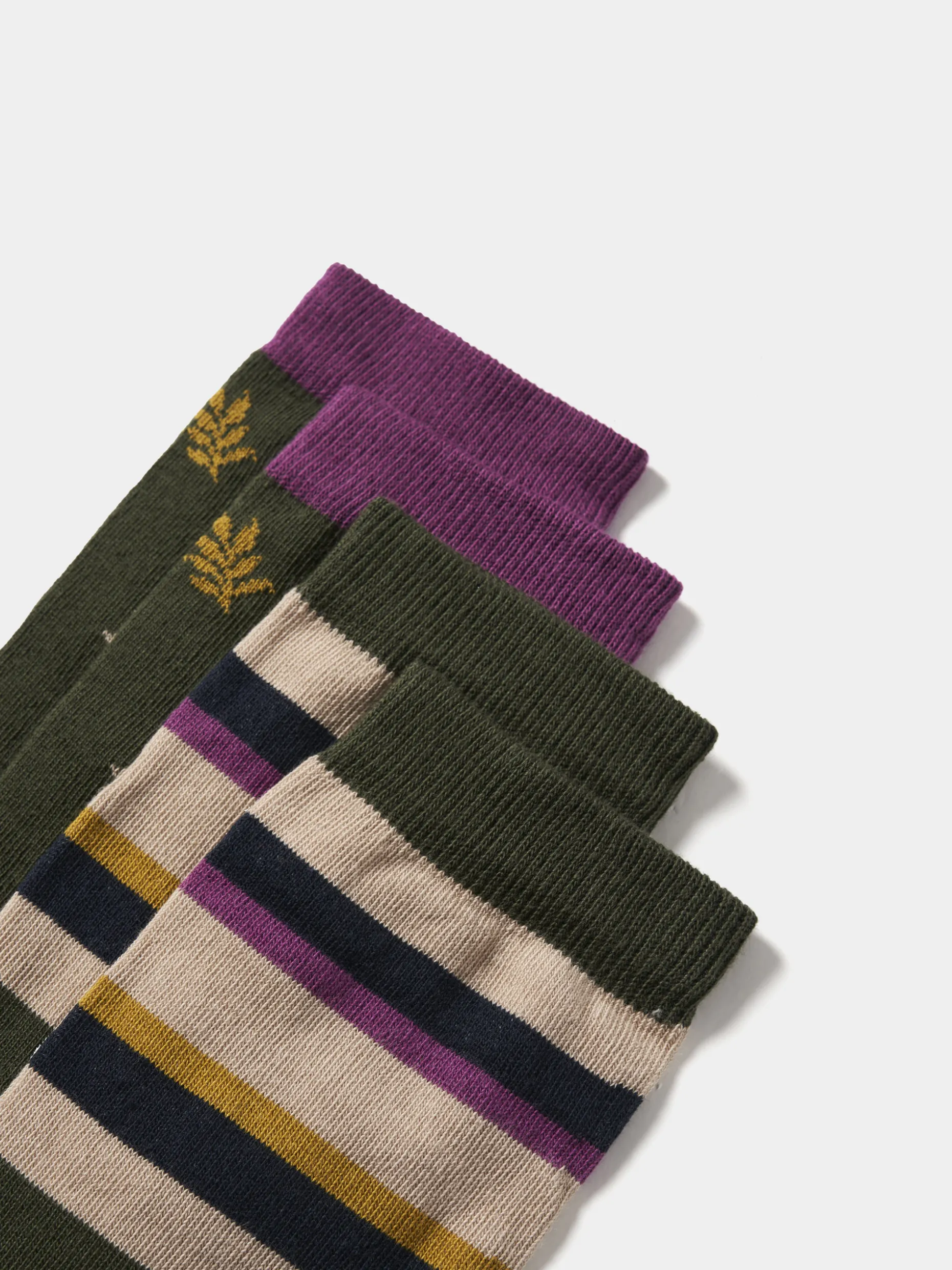 Se é fã de meias com um toque de cor, escolha este pack de dois pares de meias com estampado colorido, um floral, o outro de riscas. Terminam com canelado na parte superior.