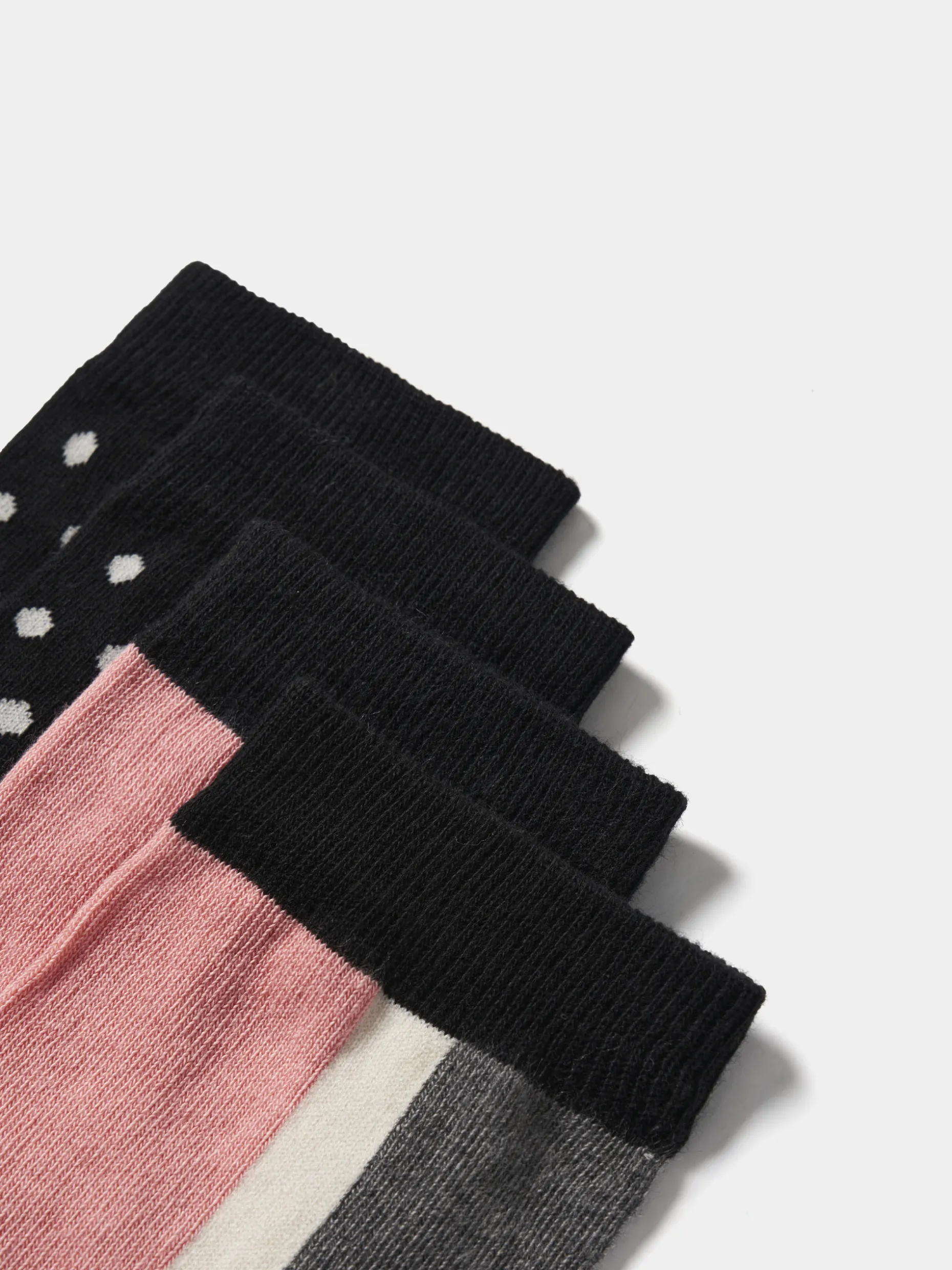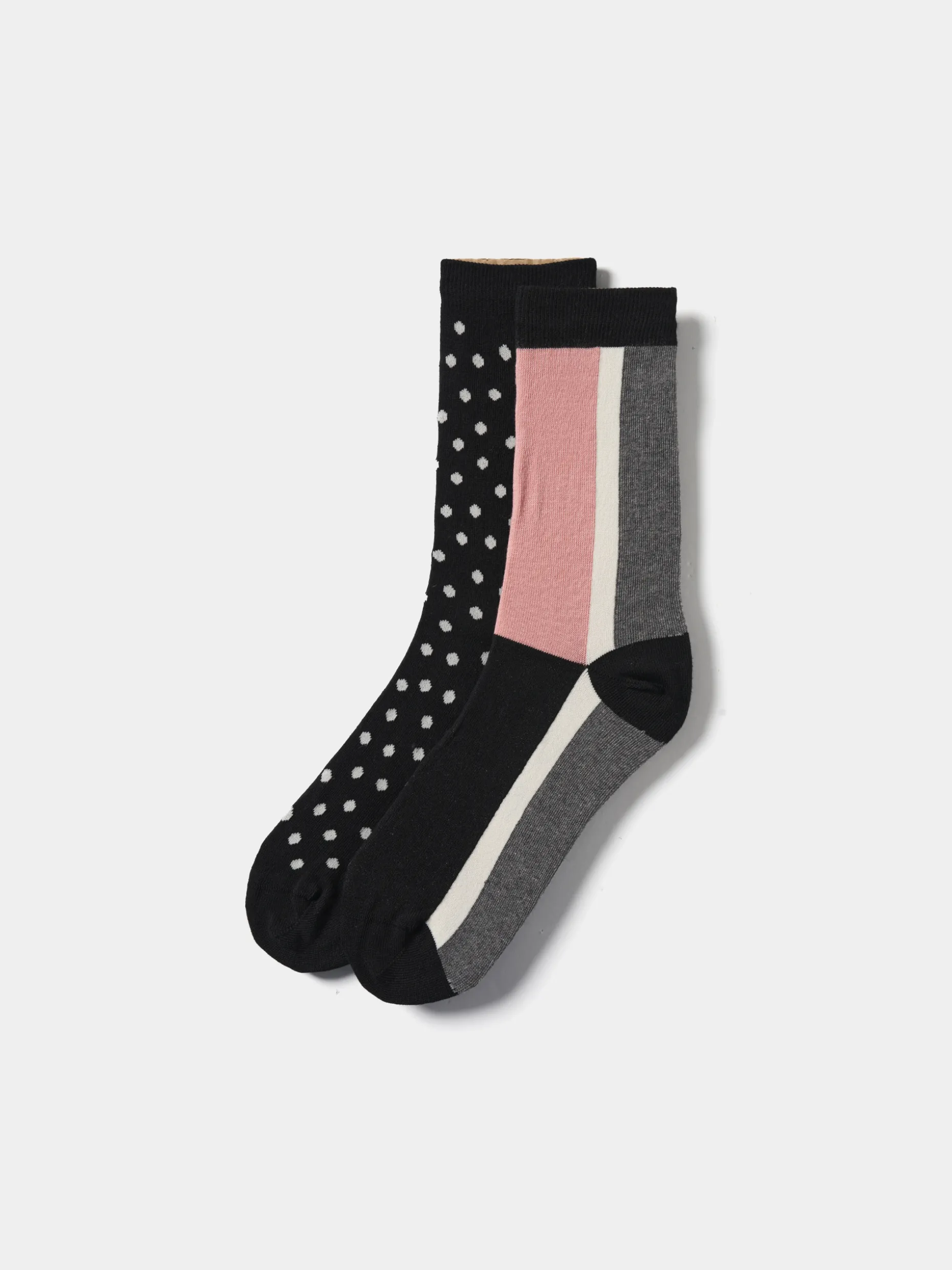 Se é fã de meias com um toque de personalidade, escolha este pack de dois pares de meias com estampado, um geométrico colorido, o outro com polka dots. Terminam com canelado na parte superior. Os padrões de ambas as meias permitem fazer conjunto com várias peças da mesma coleção.
