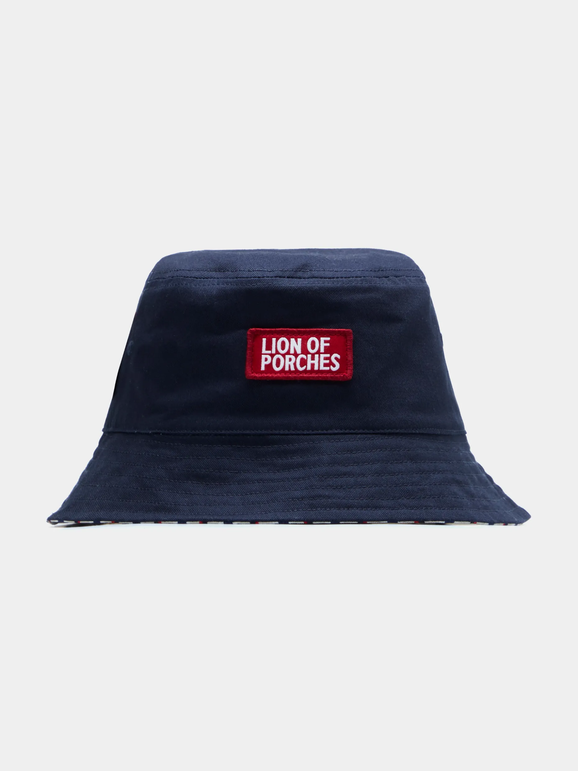 Panamá de algodão reversível. De um lado, liso, do outro com padrão de riscas. Ambos com etiqueta Lion of Porches em contraste.