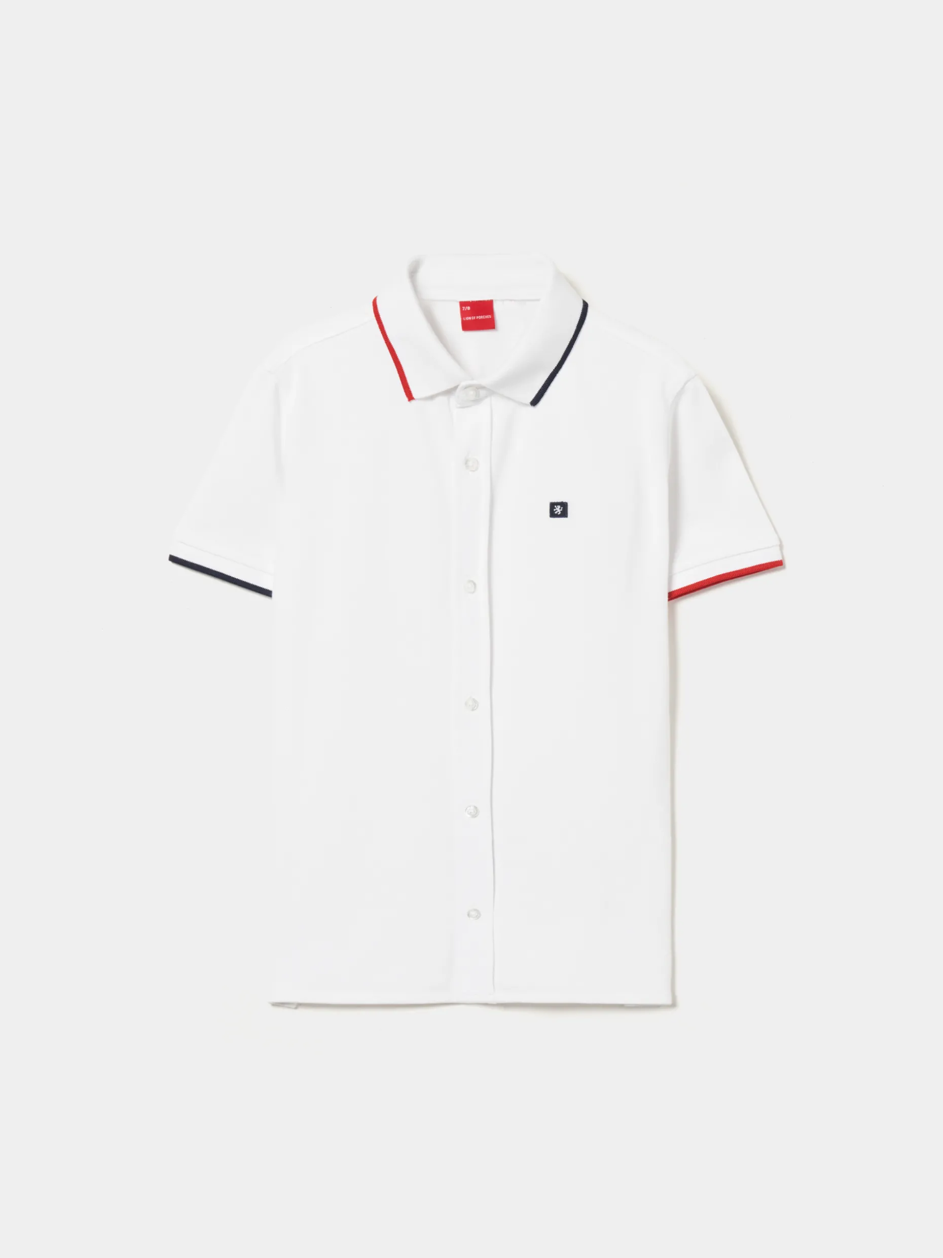 Polo camisa em malha piqué com botões na frente até à base. Com pormenor diferenciador de risca em contraste na gola e punhos. Finaliza com pequeno leão da marca no peito. É confecionado, na totalidade, em algodão para maior conforto e suavidade.