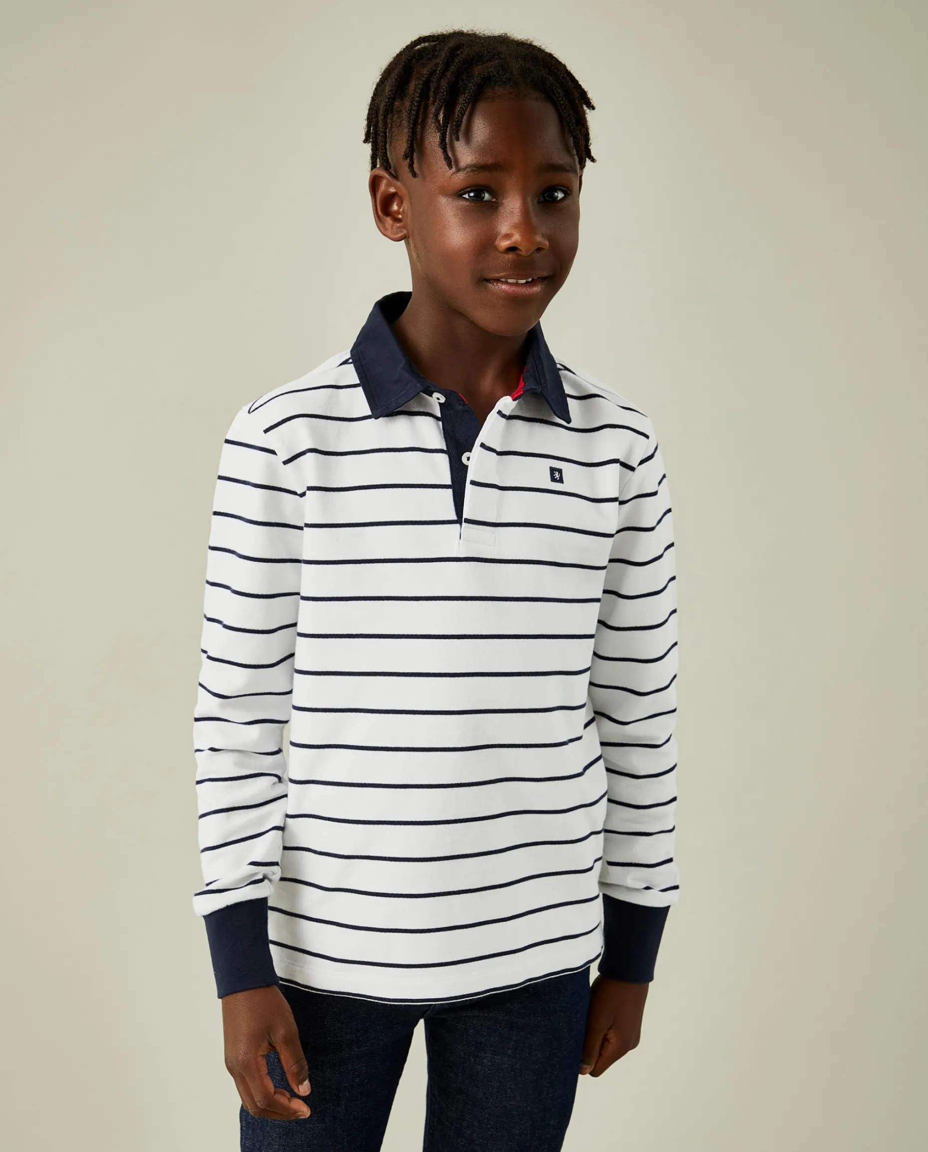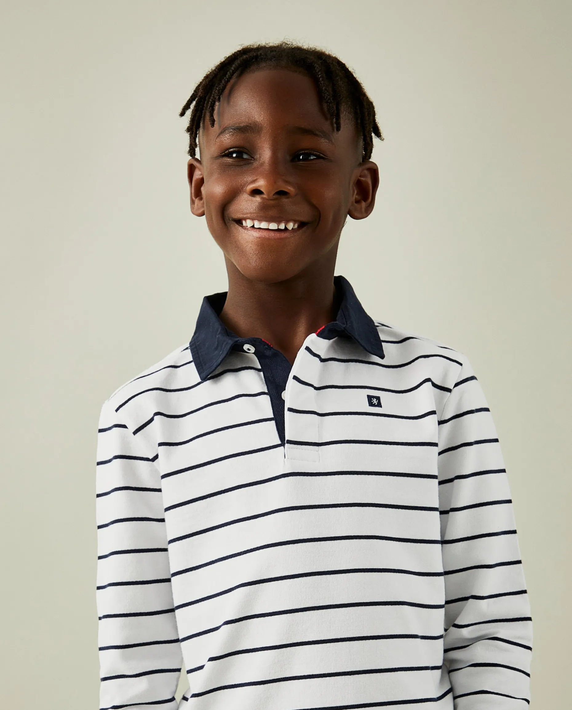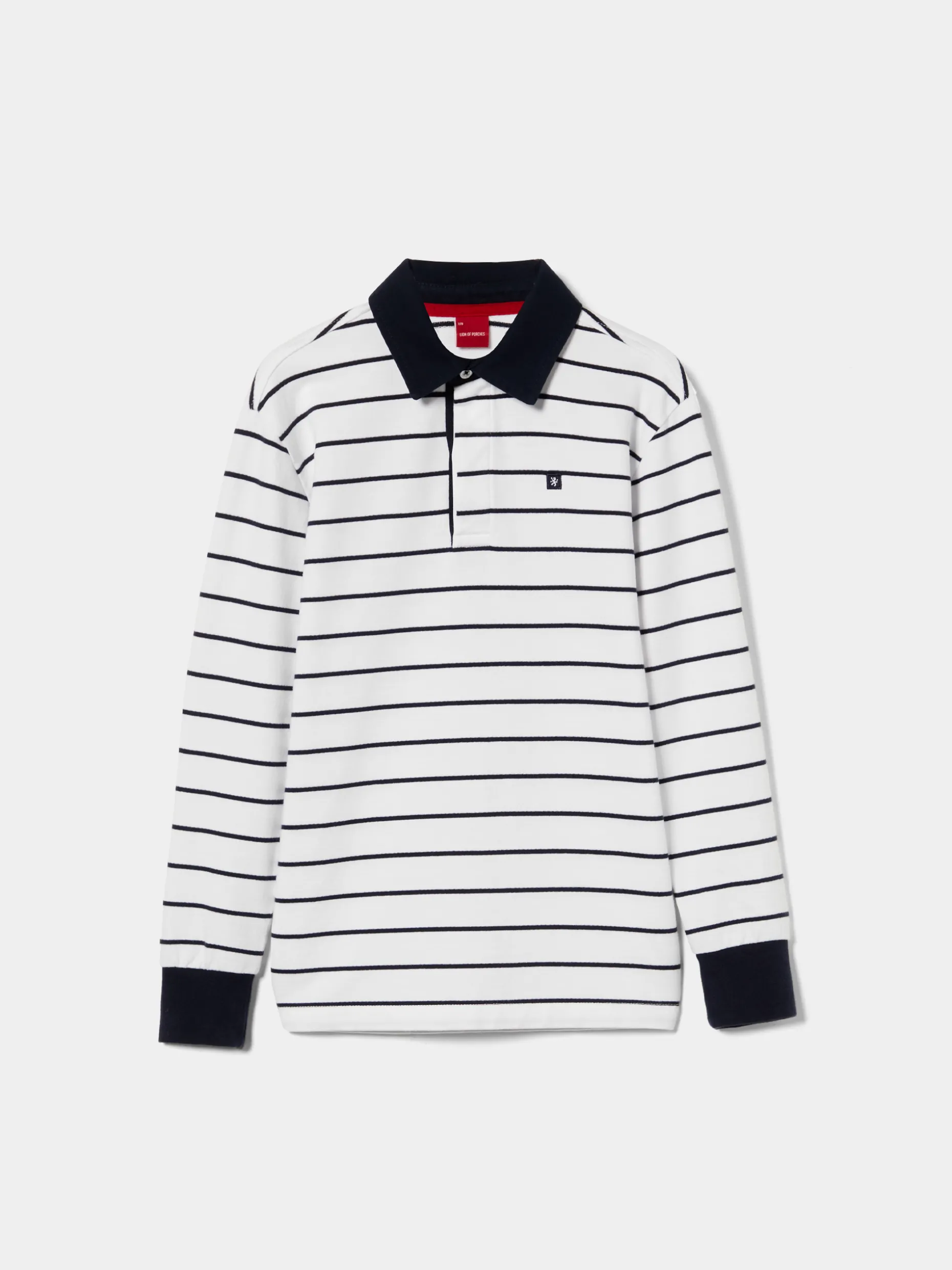 Polo de manga comprida com padrão de riscas. Pormenor diferenciador de gola e punhos em contraste de cor e leão da marca no peito. Confecionado em algodão para maior conforto.